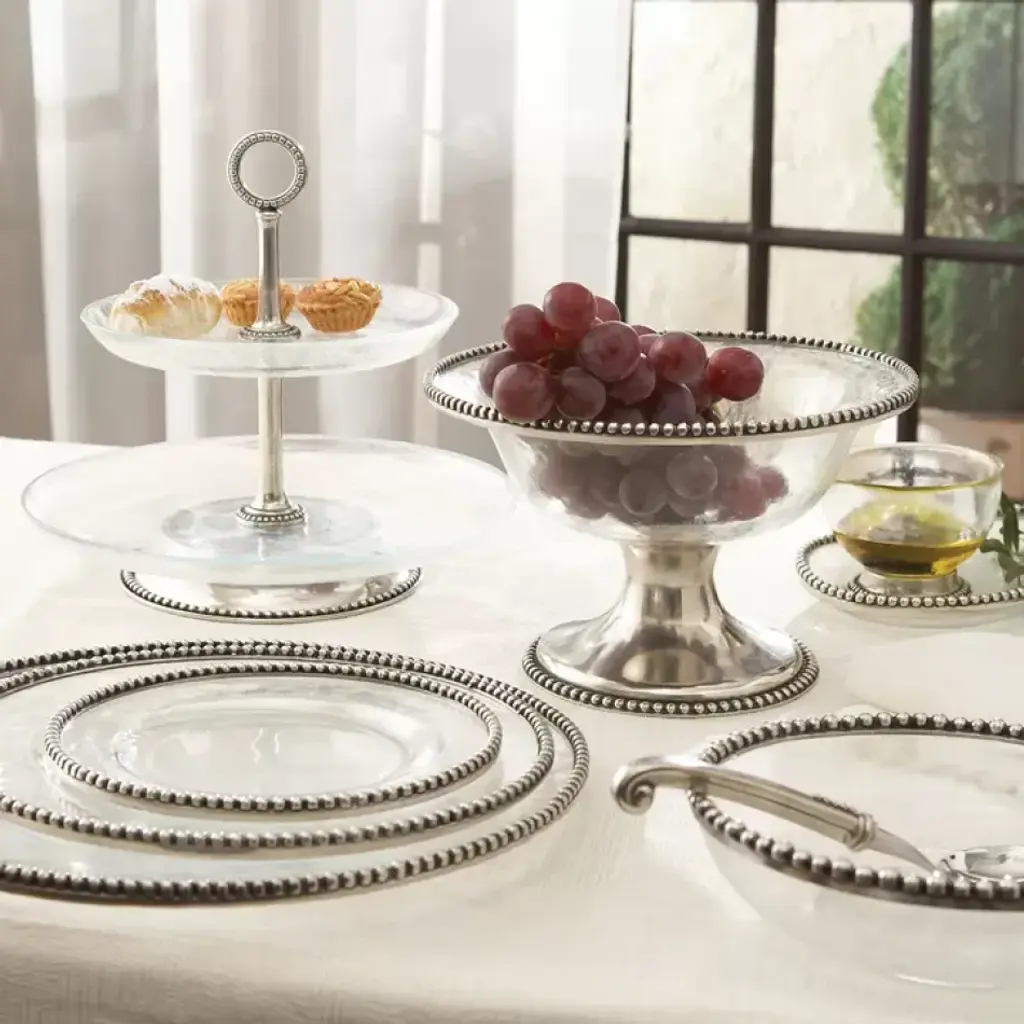 Continuing a tradition of innovation, Arte Italica's Tesoro collection features mouth-blown glass is accented with a pewter beaded rim to create a unique look. Tesoro (Italian for ‘treasure’) is a collection of dinnerware and accessories that sets a beautiful table and looks especially attractive when combined with other collections. Mouth-blown glass could differ slightly in shape and could contain small bubbles and variations. Handmade in Italy. Five-piece setting (charger) includes charger, dinner plate, salad/dessert plate, pasta/soup bowl, and mug. Five-piece setting (cereal) includes dinner plate, salad/dessert plate, pasta/soup bowl, cereal bowl, and mug. Founded in 1997 by Ann Skidmore, Arte Italica is a story of one woman's passion for Italian history, culture, art, and vintage pewter. Today, Arte Italica is one of the leading importers of European tabletop and home accessories products in the United States. Every piece is handmade and designed so that they can easily be mixed and matched to create a timeless, classic, and effortless look.