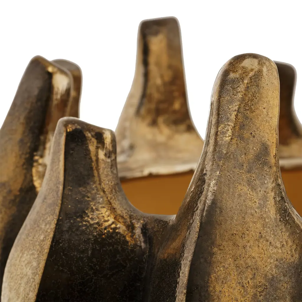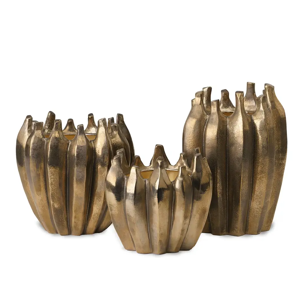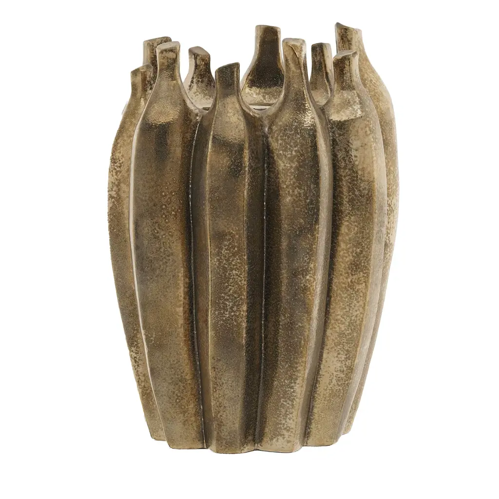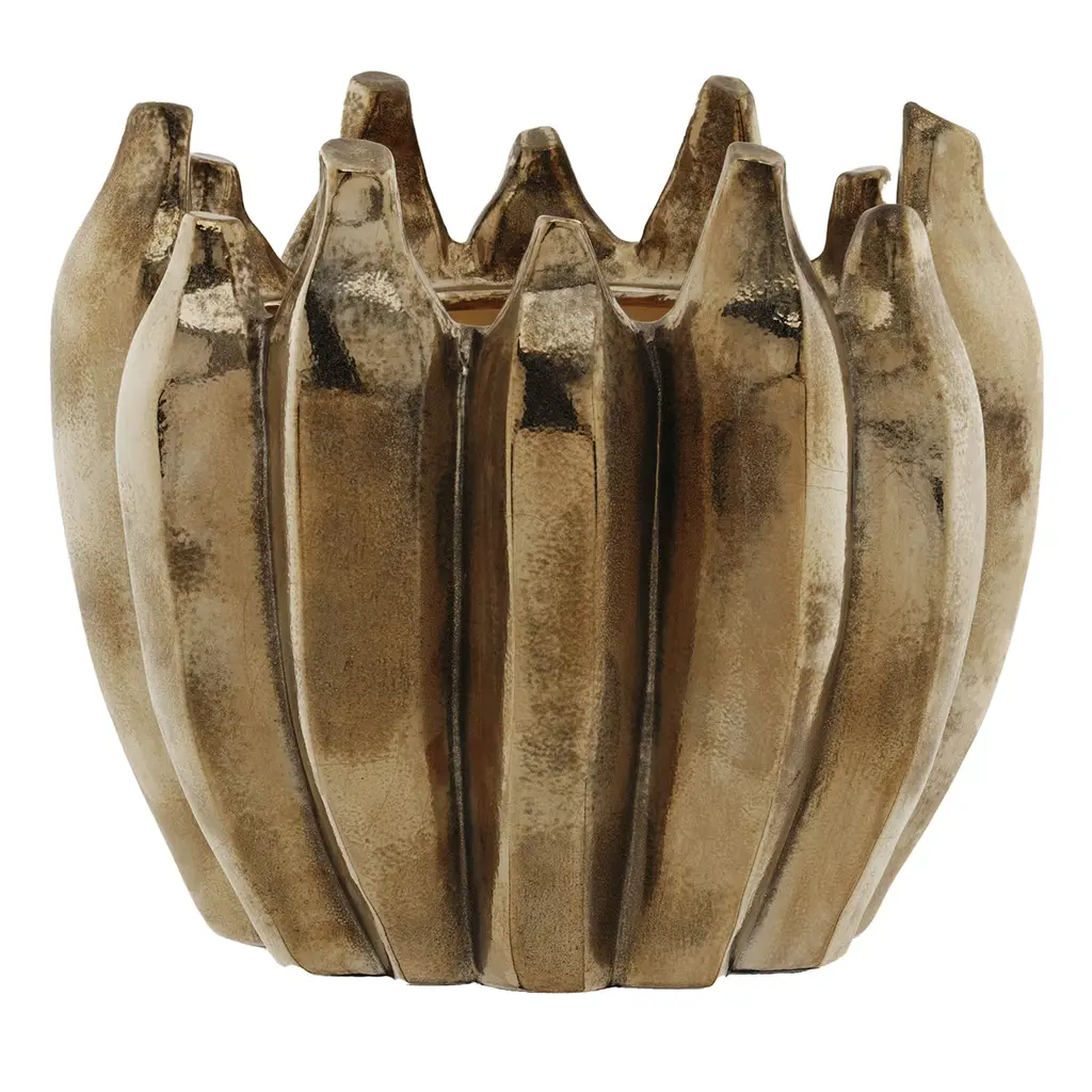 A gorgeous yet unusual silhouette of imposing grooves defines the striking design of this handmade ceramic vase that will exquisitely complement a contemporary entryway console or living room sideboard, shelf, or coffee table. Finished with an antiquated gold hue, it is available in various tones, please ask the Concierge for details.