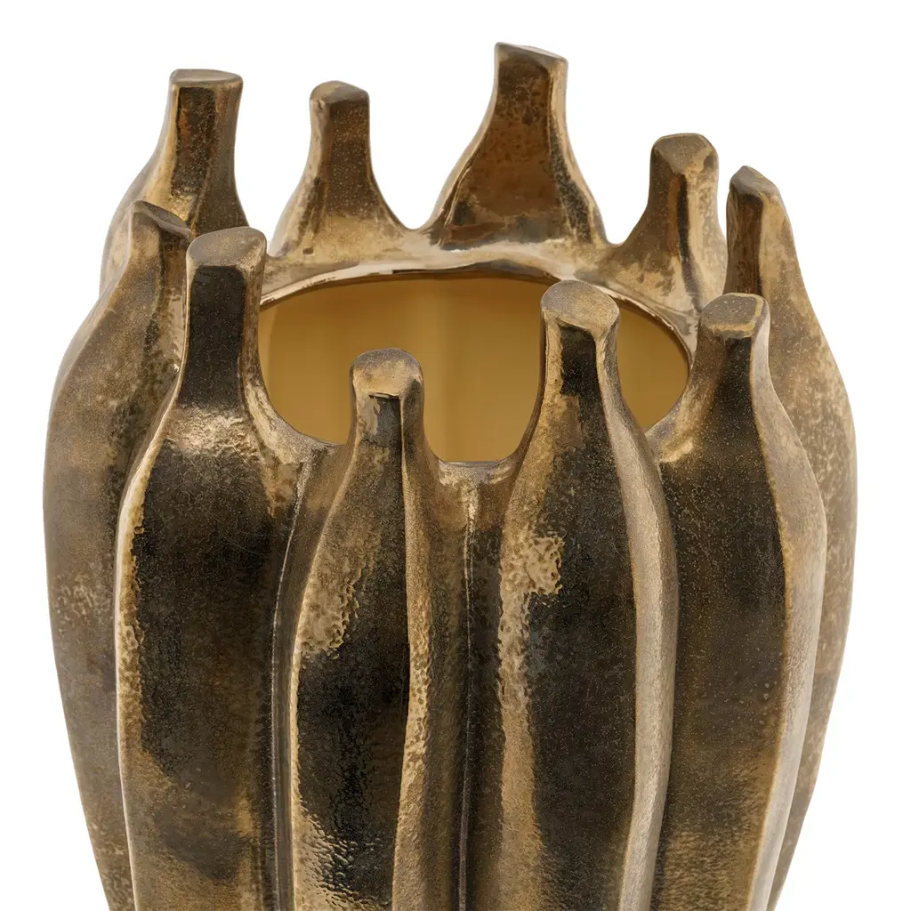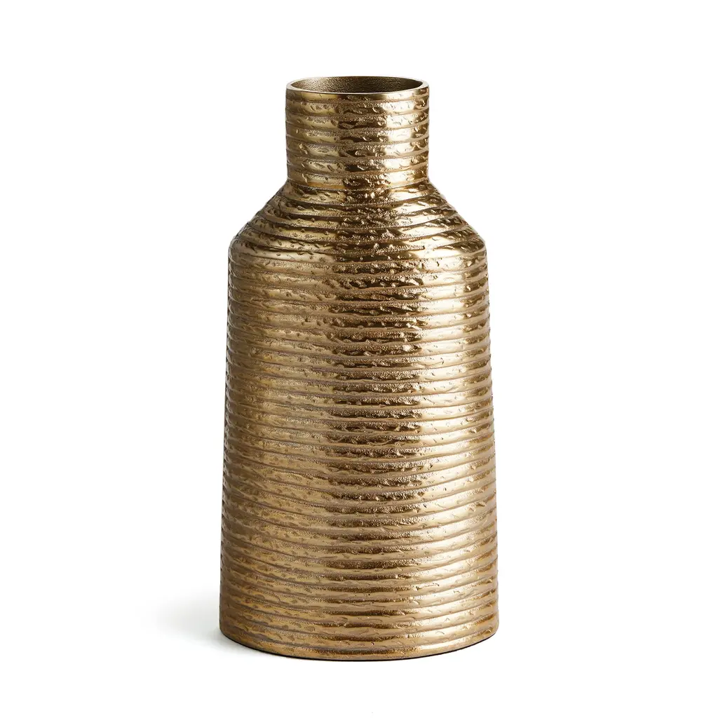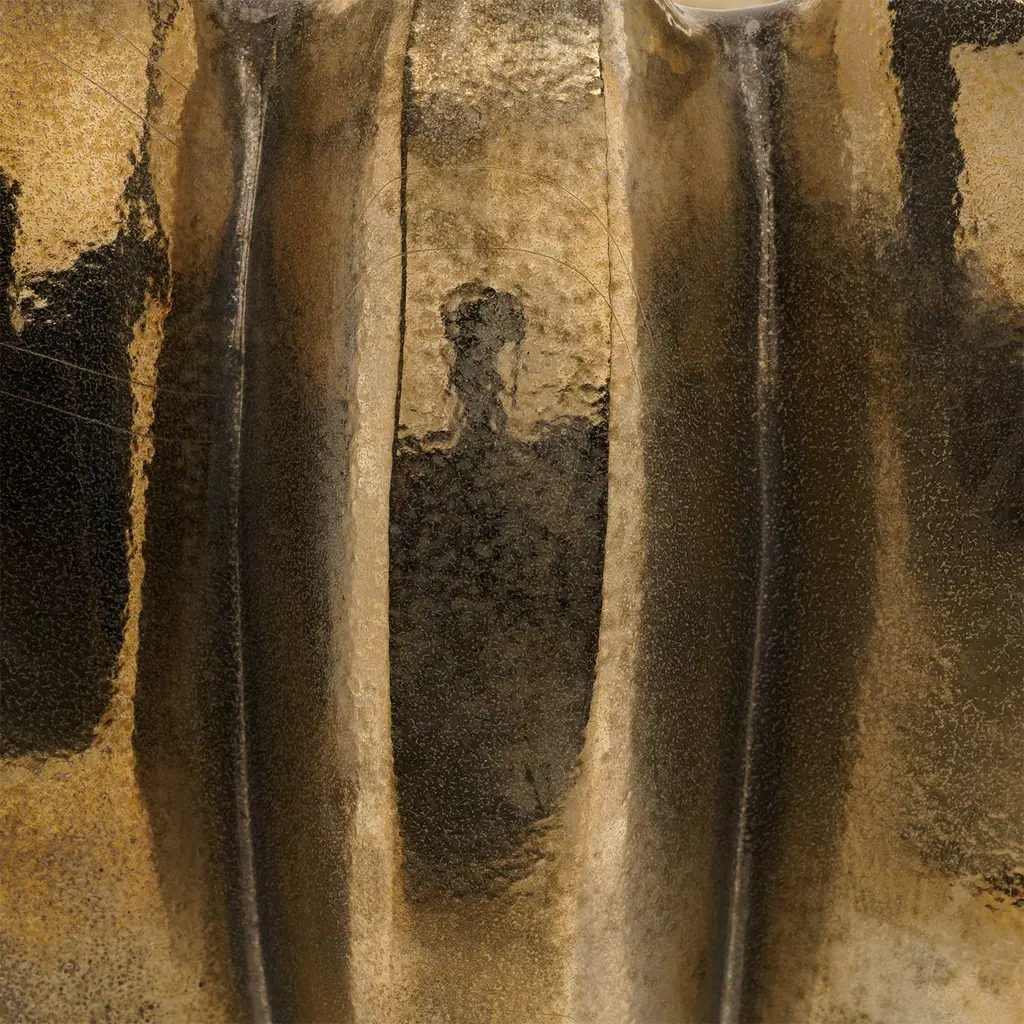 A superb ceramic vase that will surely decorate a contemporary entryway console or living room coffee table or shelf, this design is a sublime showcase of deft craftsmanship. Defined by a series of vertical grooves, its strikingly textured silhouette is enhanced with a magnificent antiquated gold finish. Available in various tones, please ask the Concierge for details.