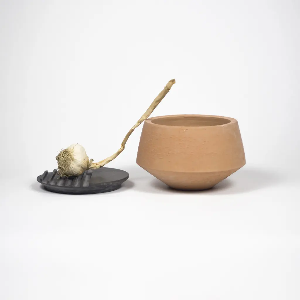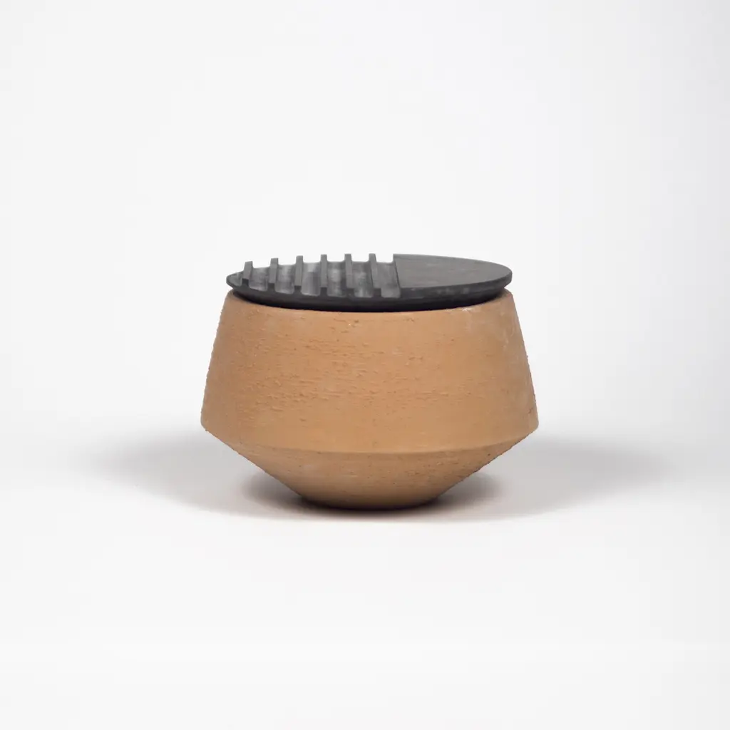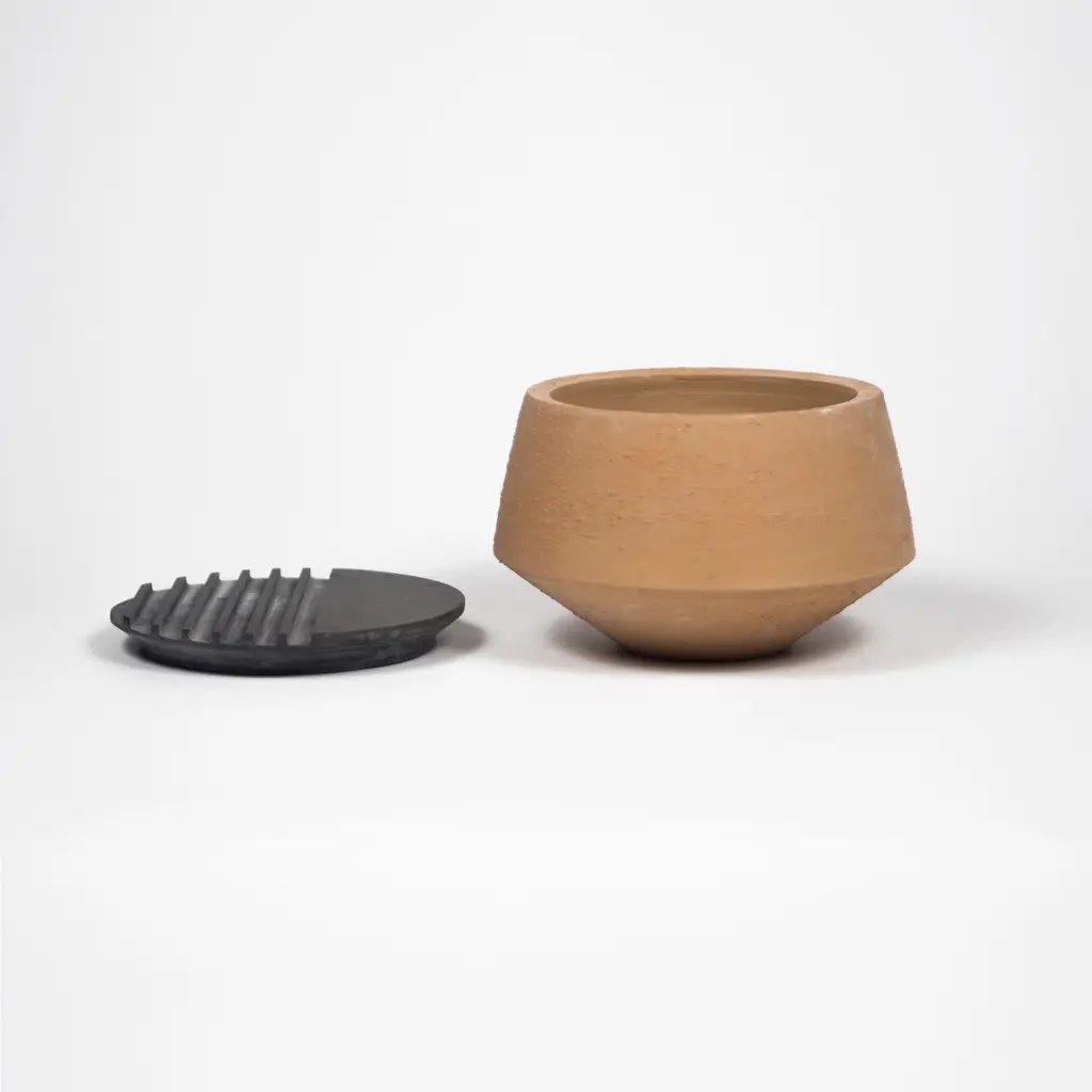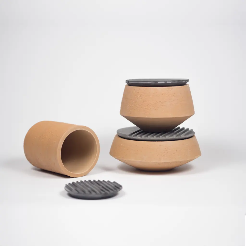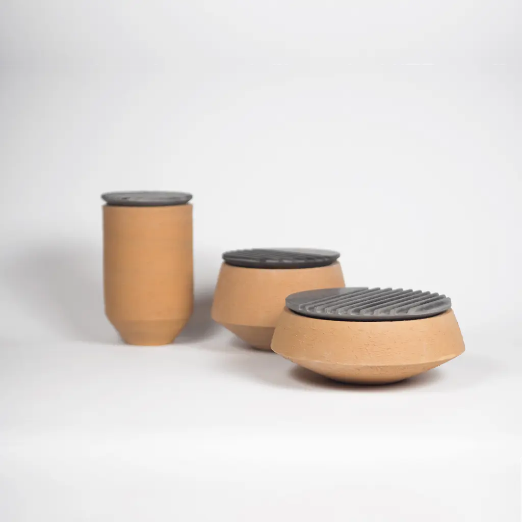 Inspired by the lines of agricultural fields as seen from above, the Traccianti (Tracers) series is as beautiful as it is tactile. Gumdesign has created the collection with a combination of natural, organic materials: refractory terracotta and Jerissa stone. Both elements come to life through a manual lathing technique which leaves its subtle marks on the materials. The textured, heat-resistant terracotta vessels have tapered bases and circular bodies. On top, a Jerrissa stone lid boasts more pronounced traces that give a nod to the collection’s concept and also provide an excellent grip. The Traccianti series comprises three vessels in different sizes and heights.