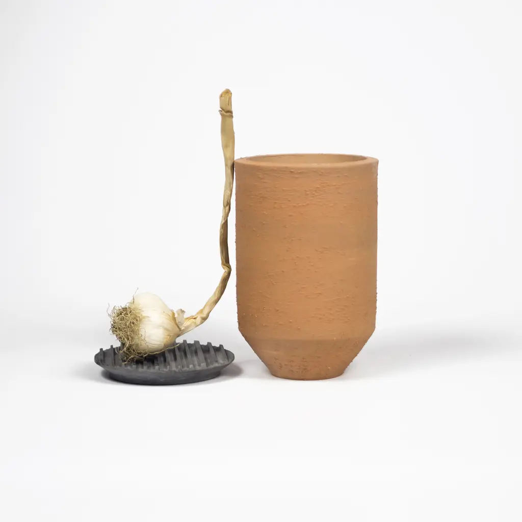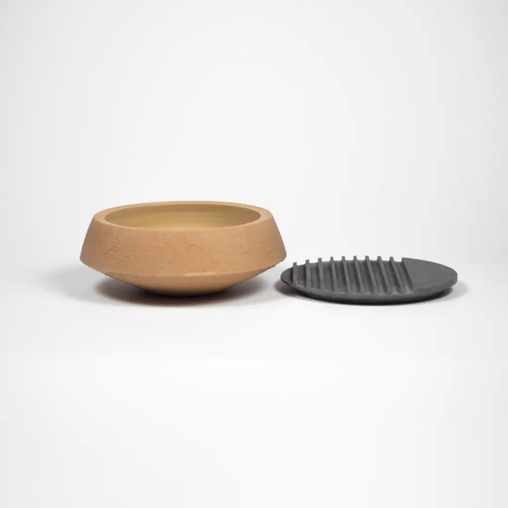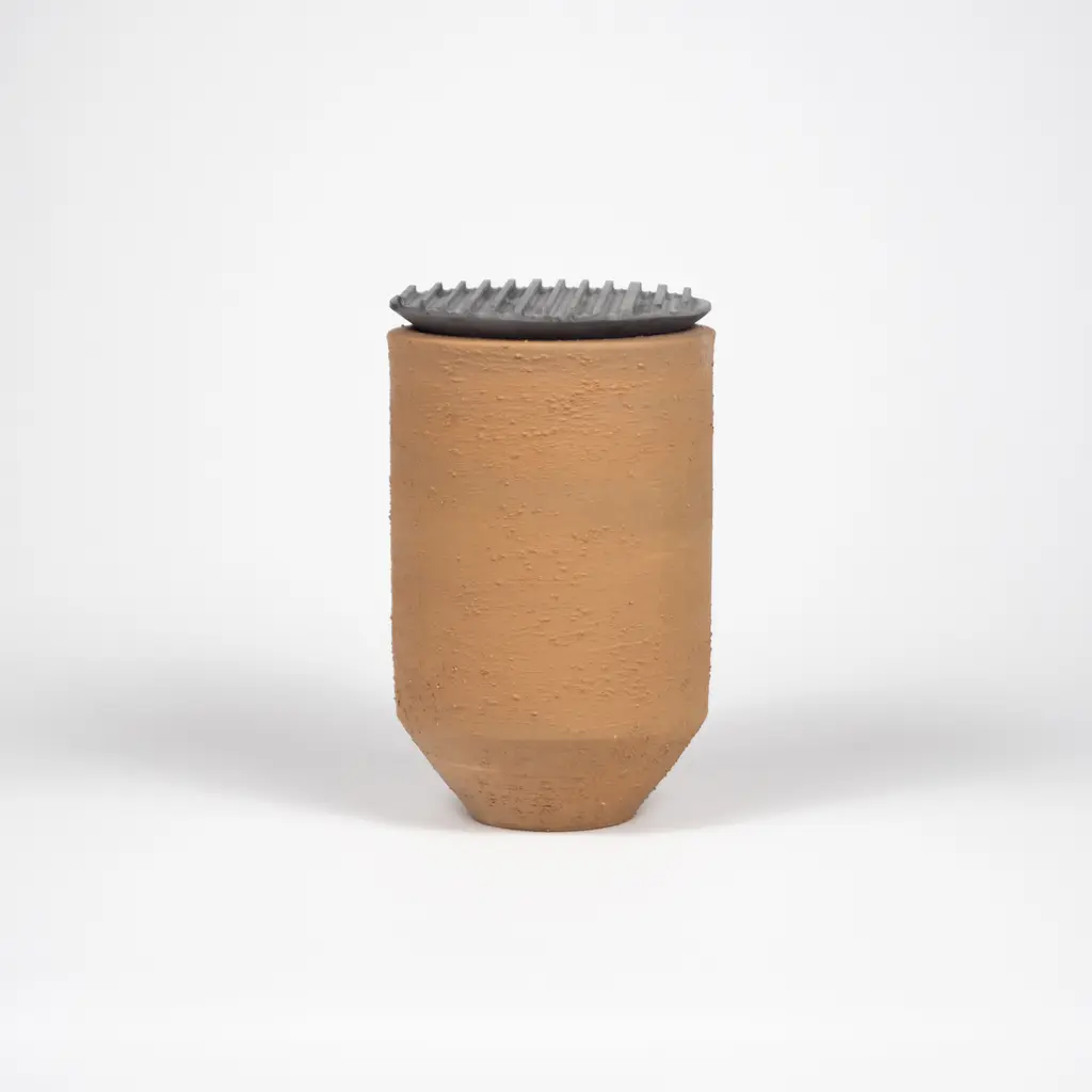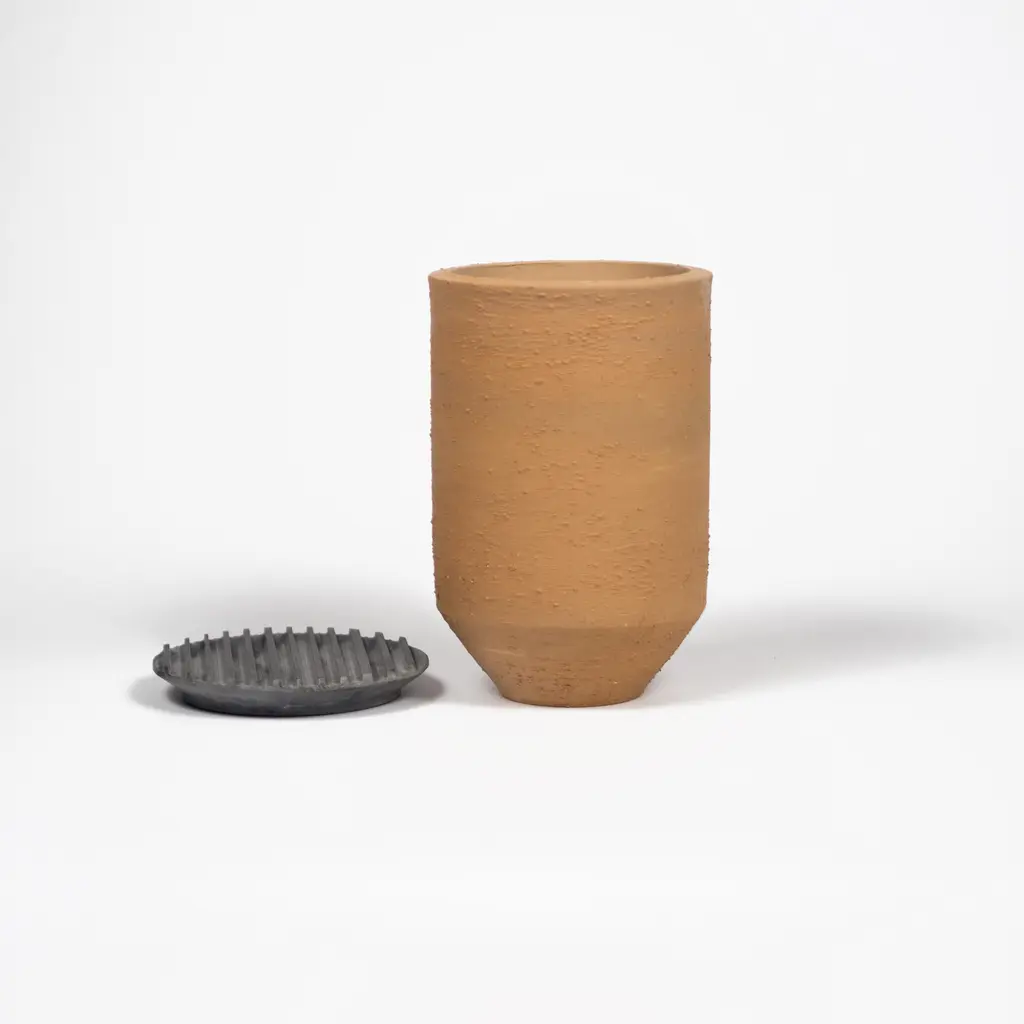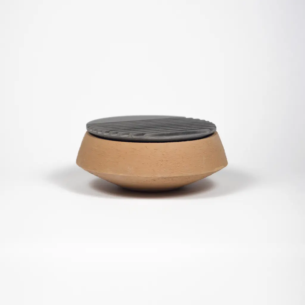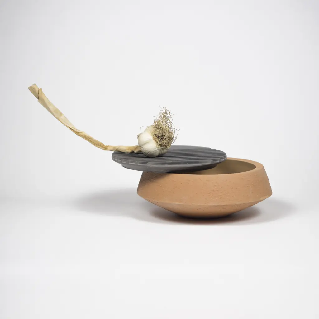 Inspired by the lines of agricultural fields as seen from above, the Traccianti (Tracers) series is as beautiful as it is tactile. Gumdesign has created the collection with a combination of natural, organic materials: refractory terracotta and Jerissa stone. Both elements come to life through a manual lathing technique which leaves its subtle marks on the materials. The textured, heat-resistant terracotta vessels have tapered bases and circular bodies. On top, a Jerrissa stone lid boasts more pronounced traces that give a nod to the collection’s concept and also provide an excellent grip. The Traccianti series comprises three vessels in different sizes and heights.