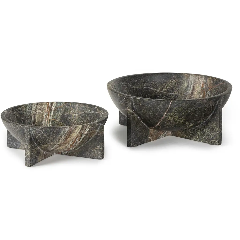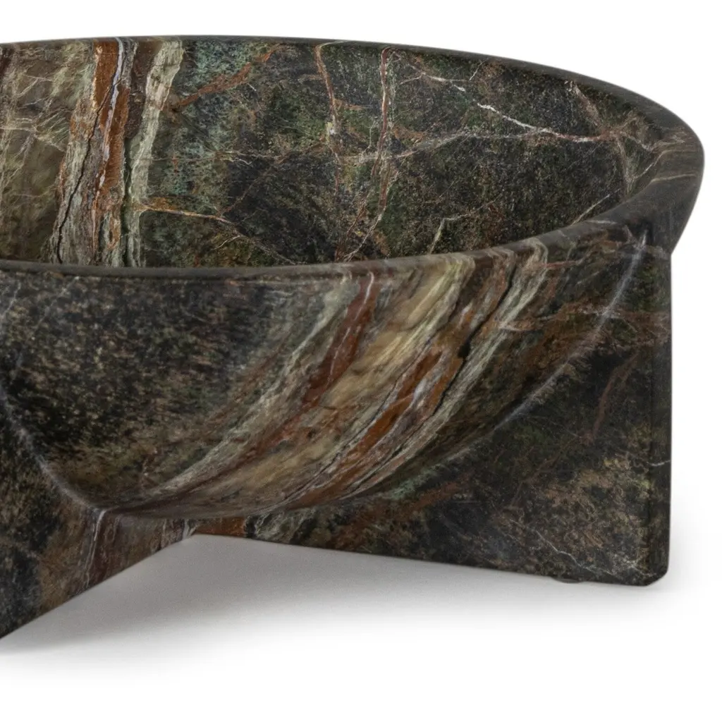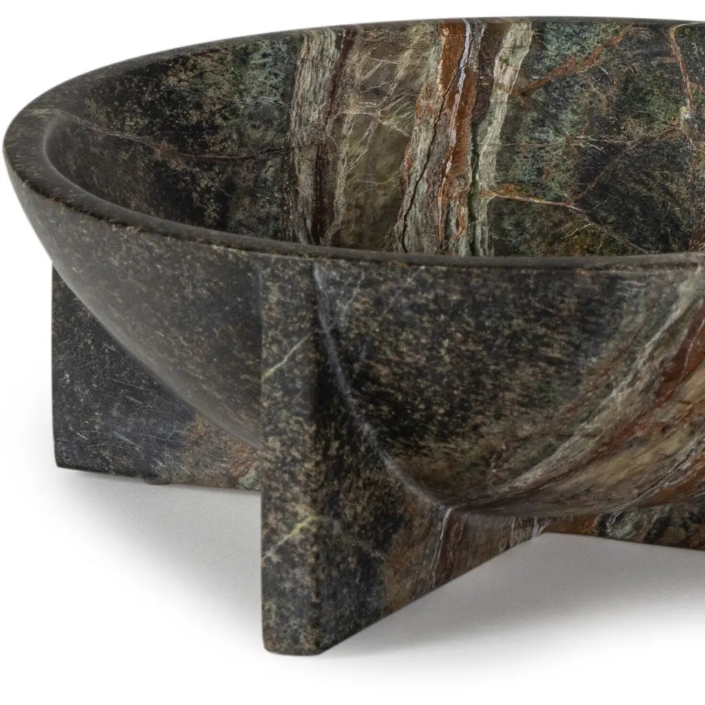 A modern X-shaped base, earthy details and dark veining define the Small Tribune Bowl. Crafted from heavy, forest green marble, this weighty piece is available in two sizes, ideal for pairing on a console or bookshelf.