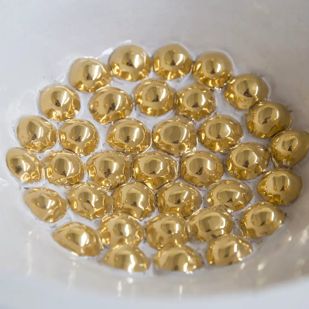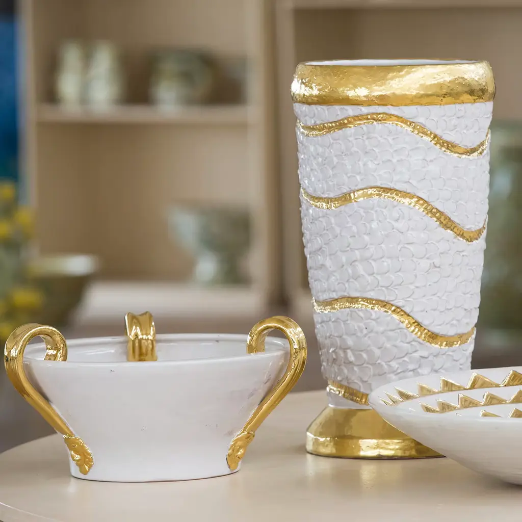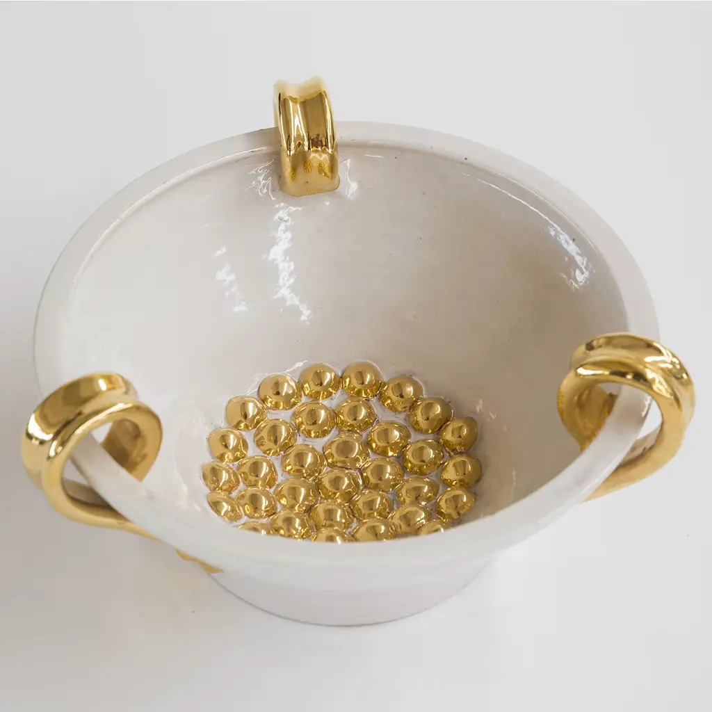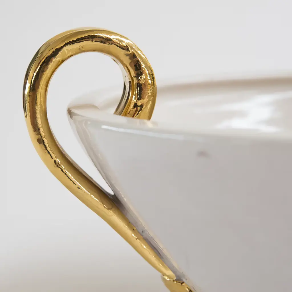 Elegant maiolica centerpiece adorned with three gold handles and further gold detail at the center, contrasting exquisitely with the smooth white ceramic form. This white and gold bowl is entirely handcrafted by the Tuscan ceramic artisans of ND Dolfi employing the time-honored specific techniques of maiolica ceramic.