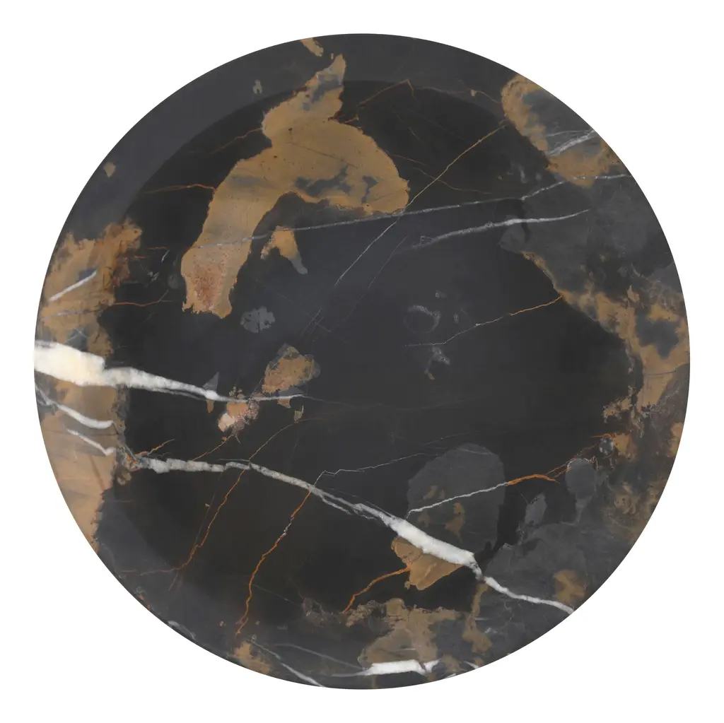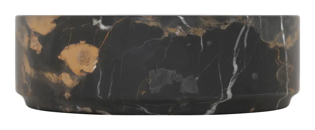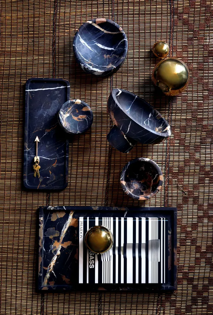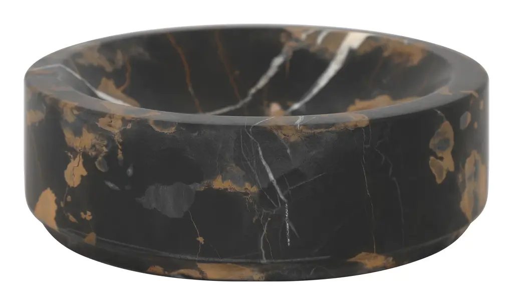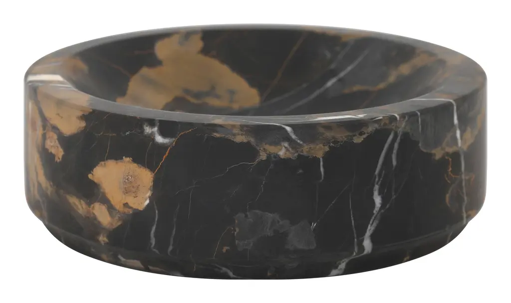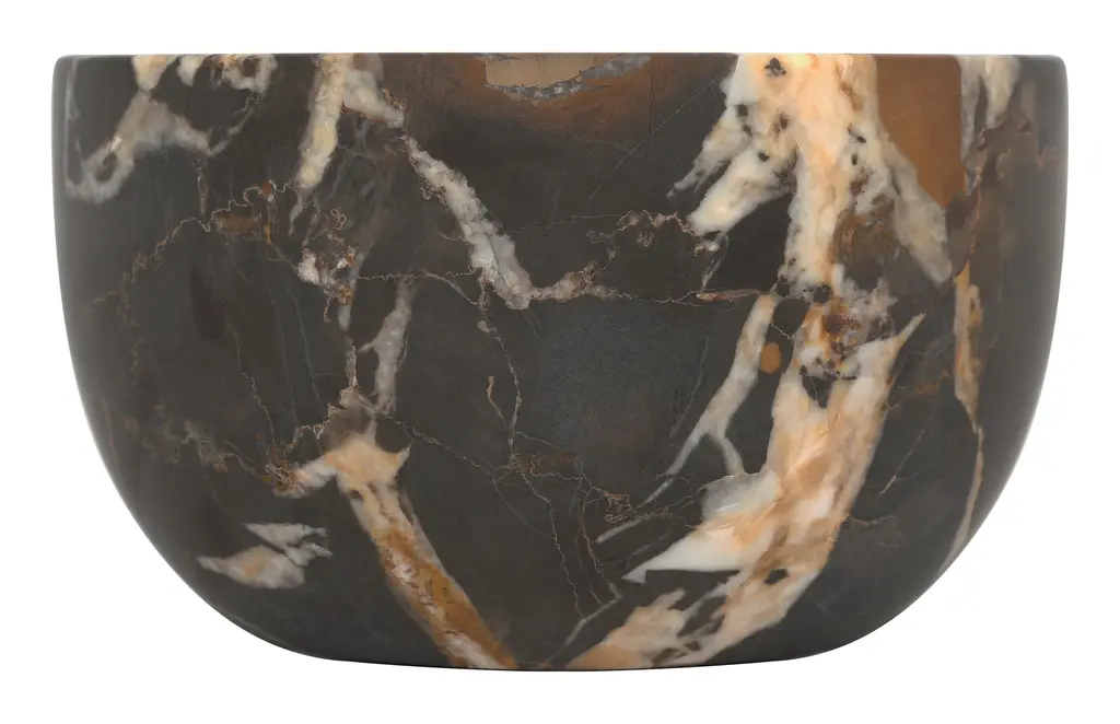 Our handsome Troy Bowls make the perfect finishing touch for any room of the house. Simple and stately, these monolithic dishes are crafted from weighty black marble with stunning swirls of white and caramel-colored veining that makes each one unique. Striking all on their own, we love our Troy Bowls sitting atop a stack of books on the coffee table or étagère. It would also be great as a catchall for keys and coins on the entryway console or collecting odds and ends on the desktop. •black marble •organic white and caramel veining •each is unique Dimensions •short: 8" diameter x 2.75"H •tall: 6" diameter x 3.5"H