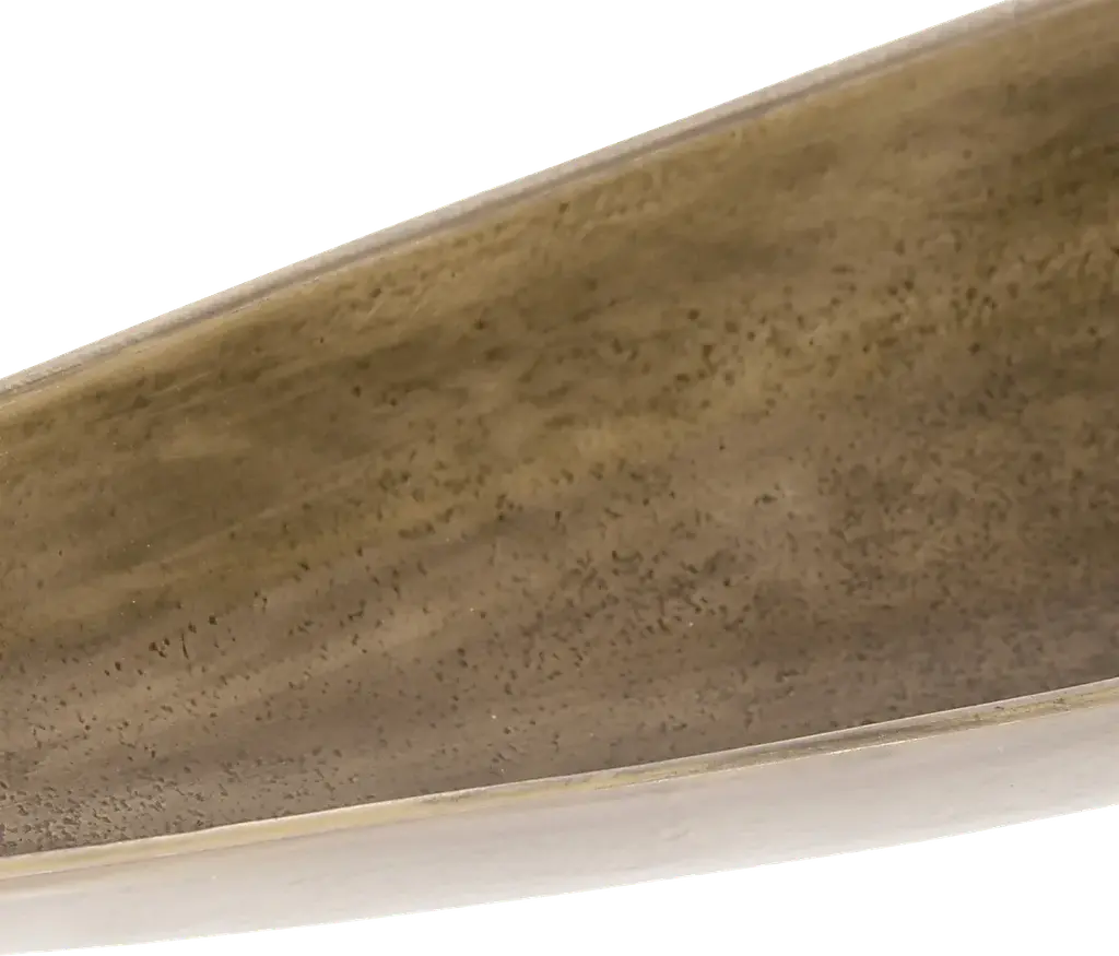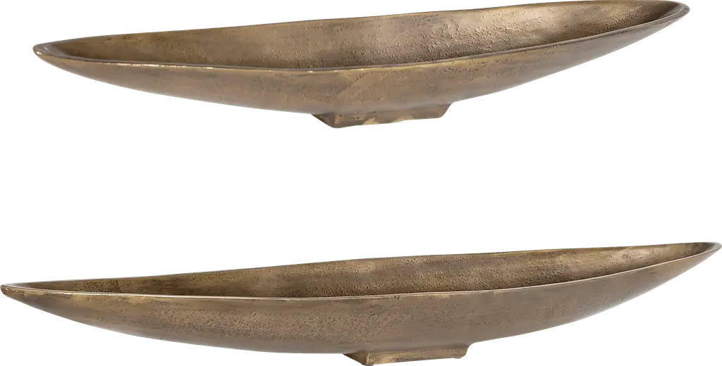The Turio antique brass finished cast aluminum bowls feature a sleek, elongated design, perfect as decorative centerpieces or functional accents for any room. Their minimalist yet striking appearance adds a touch of vintage elegance to modern and classic spaces alike. May also be hung on the wall and used outdoors.