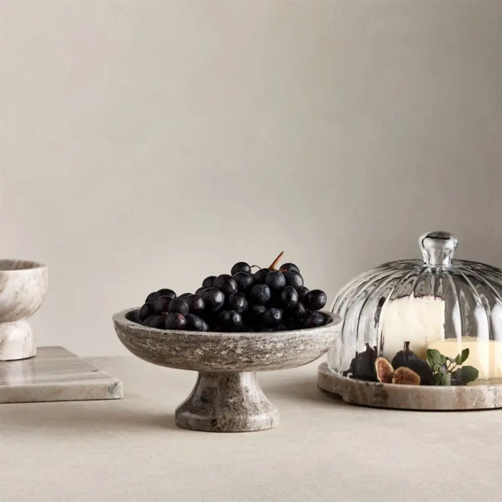 Our Tuscan kitchen collection brings home the rustic warmth and organic beauty of central Italy. Softly neutral yet statement-making, luxurious beige marble shape a stunning pedestal bowl. The fascinating material refreshes the traditional silhouette, while the semi-matte finish keeps the look sleek and timeless. Fill the footed bowl with bread rolls for a grand presentation or with fruits for a still life-worthy centerpiece. Subtle variations in hues, veining and texture make each hand-finished marble bowl uniquely gorgeous.