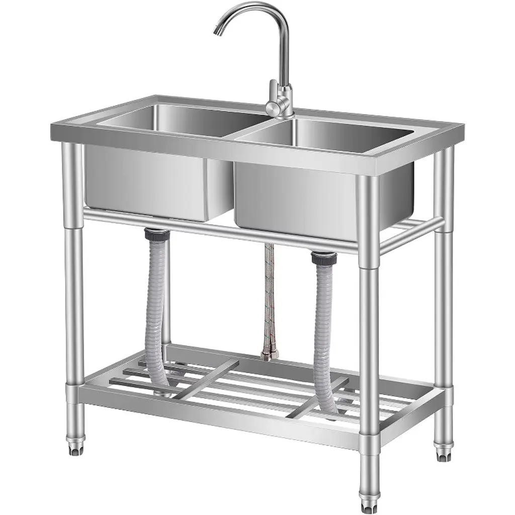 1.Premium 201 Stainless Steel for Heavy-Duty Use Crafted from corrosion-resistant 201 stainless steel, this commercial utility sink is built to withstand rigorous daily use. It offers superior resistance to rust, scratches, and stains¡ªmaking it ideal for high-traffic environments like restaurant kitchens, garages, outdoor prep areas, or busy laundry rooms. The durable material ensures long-lasting performance, even with constant exposure to water, cleaning chemicals, and heavy cookware. 2.Hot & Cold Water Faucet for Versatile Cleaning Equipped with a stainless steel faucet featuring integrated hot and cold water pipes, this sink allows precise temperature control for any task¡ªfrom rinsing produce and washing dishes to cleaning tools or sanitizing equipment. The 360¡ã swivel spout adds flexibility, reaching every corner of the double bowls for thorough, efficient cleaning. This feature eliminates the need for separate hoses, streamlining workflow in busy spaces. 3.Spacious Workbench & Smart Storage Solutions The sink includes a large workbench that provides ample prep space for chopping, organizing, or staging items. A built-in slotting tool holder keeps knives, scrub brushes, and utensils within easy reach, reducing clutter. Below, the sturdy undershelf offers additional storage for pots, pans, cleaning supplies, or bulk items¡ªmaximizing vertical space and keeping essentials organized and accessible. 4.Easy Setup with Adjustable Stability Designed for hassle-free installation, this freestanding sink set comes pre-assembled¡ªno pre-drilling required. Simply connect the water lines, and it¡¯s ready to use. The adjustable feet ensure stability on uneven floors, preventing wobbling and ensuring safe use even when the sink is full. Its versatile freestanding design works equally well indoors (restaurants, laundries) and outdoors (garages, backyard kitchens). 5.Versatile Performance for Multiple Environments This double bowl utility sink excels in diverse settings: it¡¯s a workhorse in restaurant kitchens for food prep and dishwashing, a practical addition to garages for cleaning tools, a handy outdoor sink for backyard barbecues, or a reliable laundry room fixture. Its ergonomic design and durable construction meet high-volume demands effortlessly, making it a versatile solution for any space needing a robust, multi-functional sink.