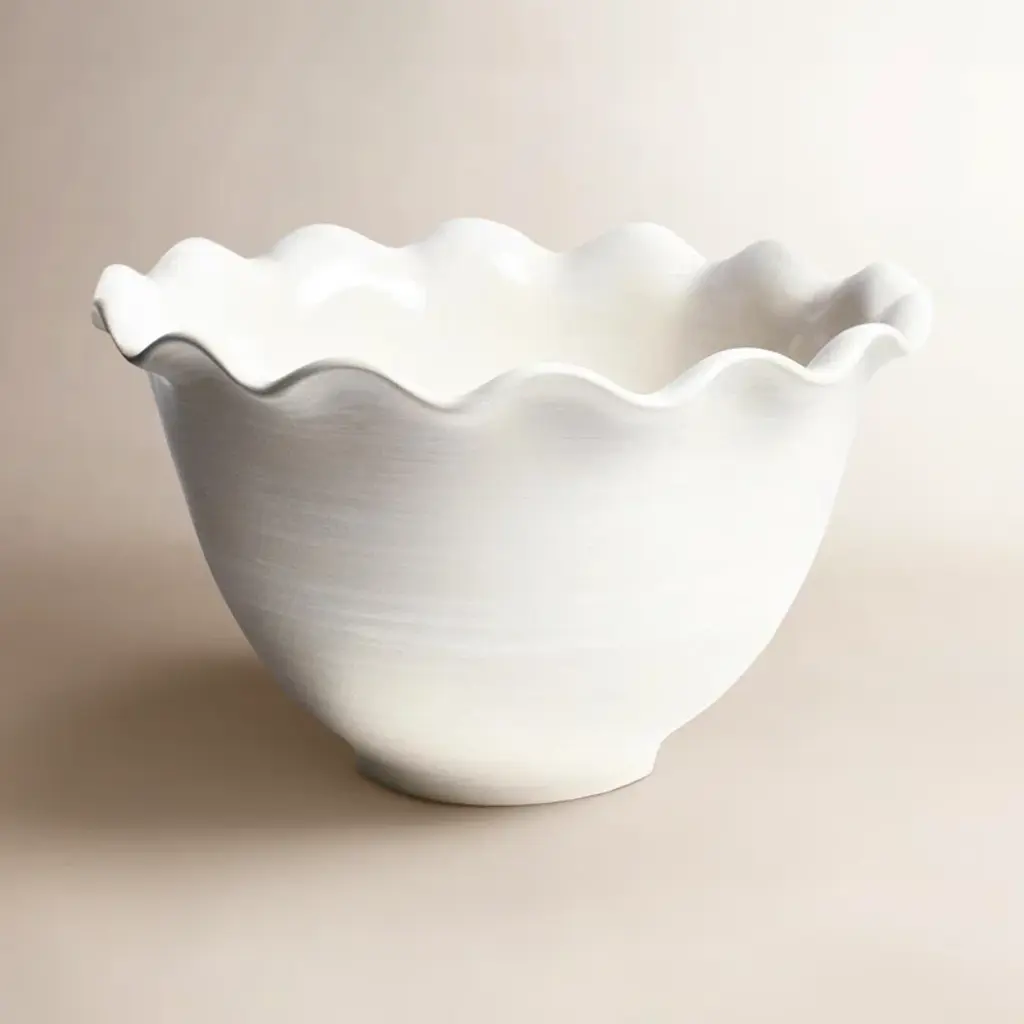 This Elegant Ceramic Bowl Features A Stunning Ruffled Edge Design, Evoking The Delicate Shape Of A Blooming Flower. Its Soft White Glaze With A Subtle Crackle Finish Adds Texture And Sophistication, Making It An Ideal Statement Piece For Any Modern Or Classic Decor. Perfect For Displaying As A Centerpiece Or For Functional Use, This Bowl Blends Art And Practicality Effortlessly.