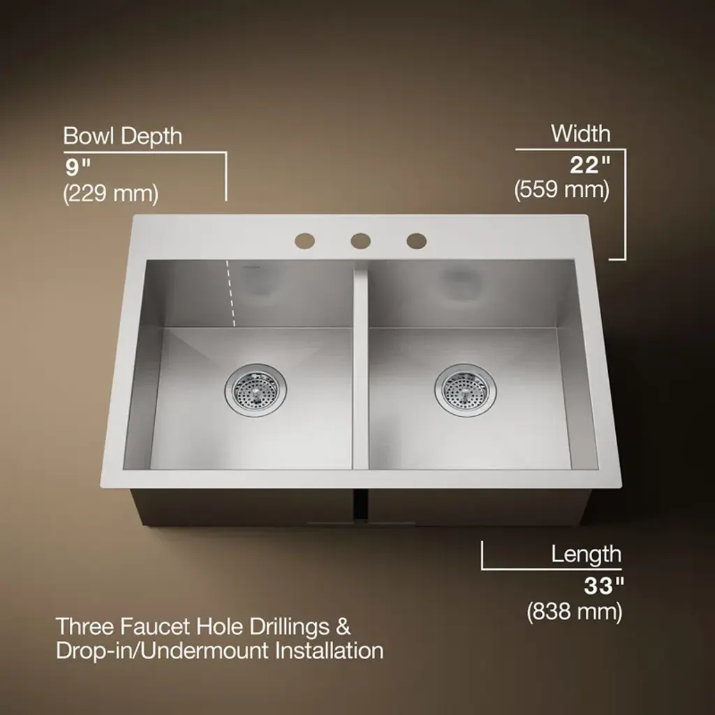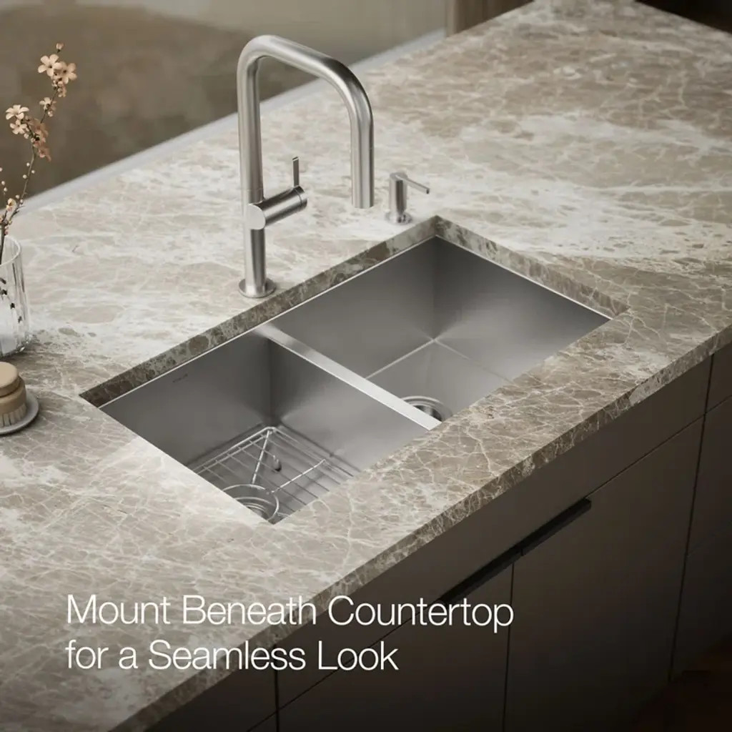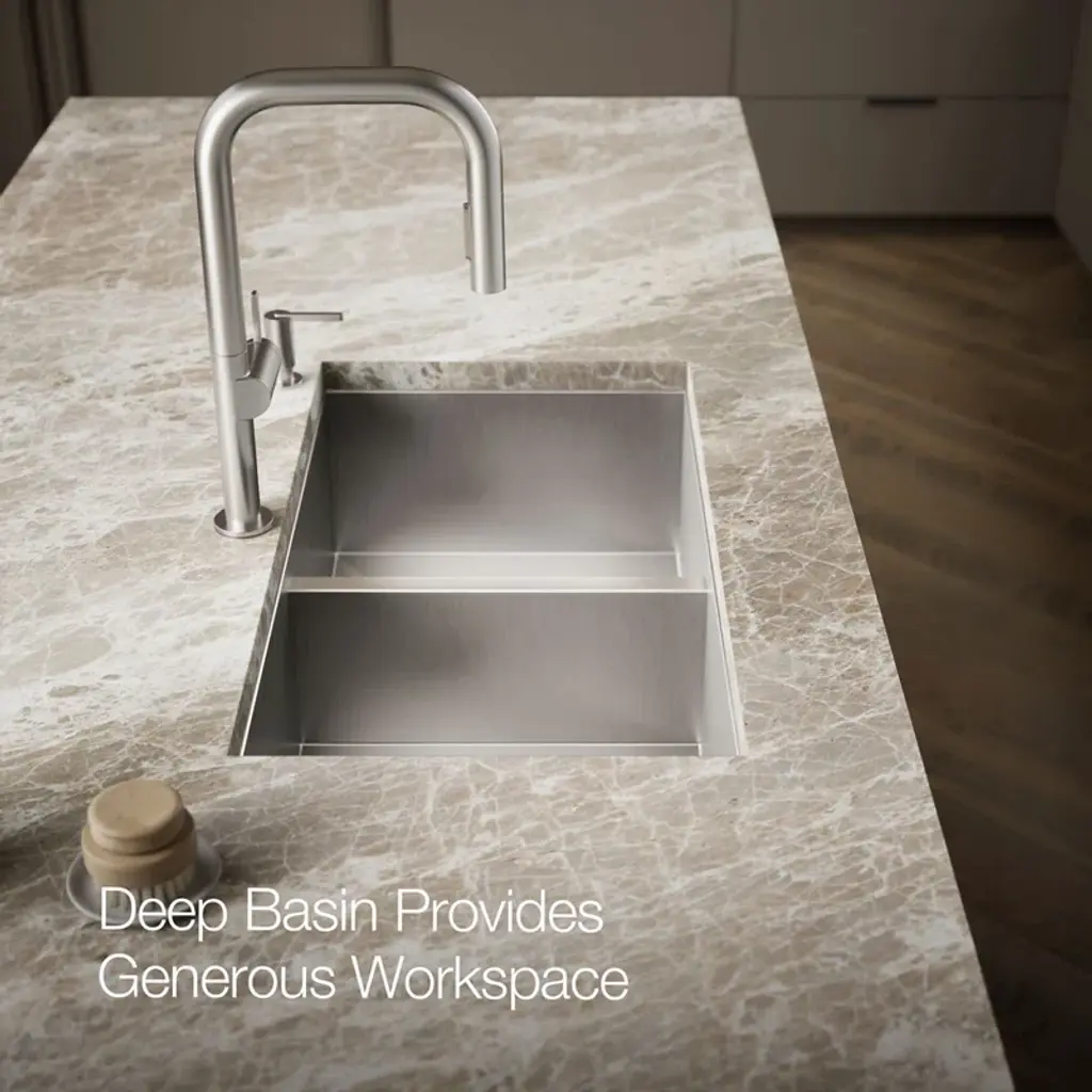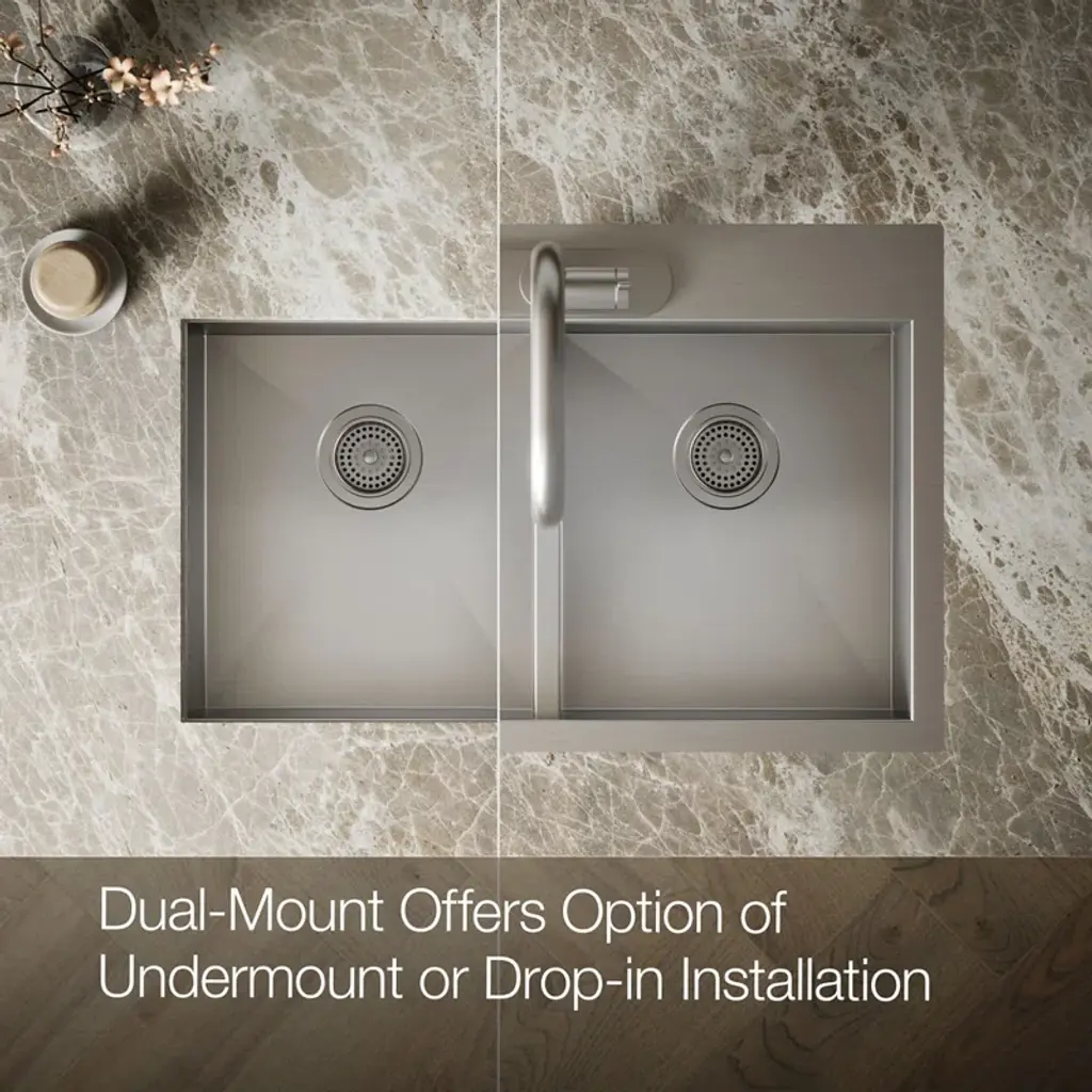 The distinctive, modern design of the Vault™ sink lends a contemporary vibe to your kitchen. Handcrafted from durable stainless steel, this dual-mount sink features a lowered divider, tightly angled corners to maximize basin space, and a sloped bottom that helps with draining and cleanup. An engineered sound absorption system significantly reduces disposal and dishwashing noise. Vault™'s ultra-flat rim makes it easy to wipe from the counter directly into the sink.