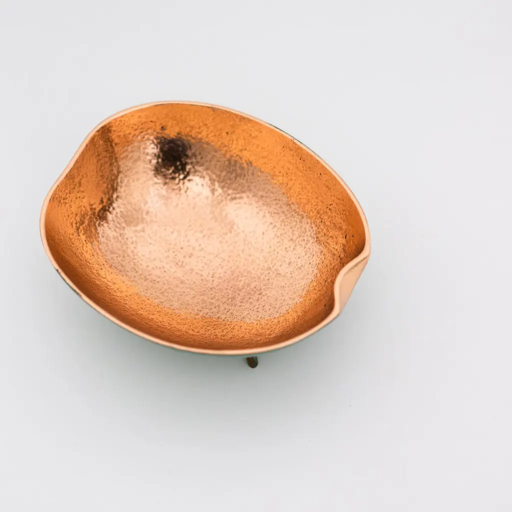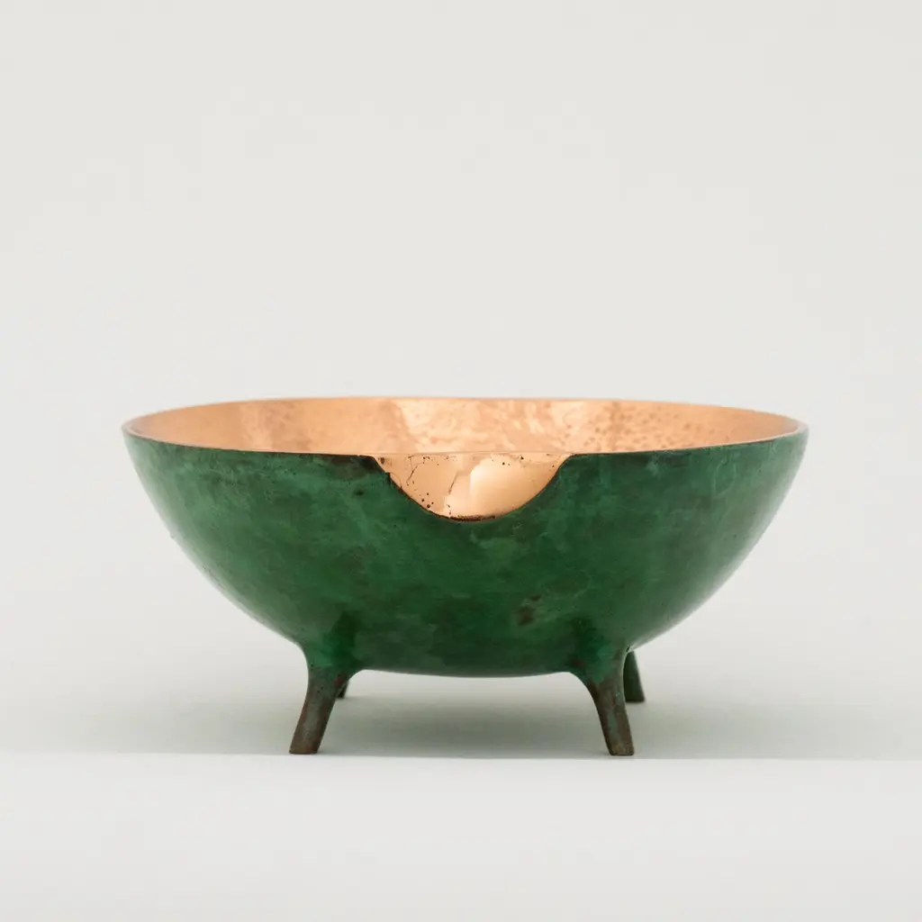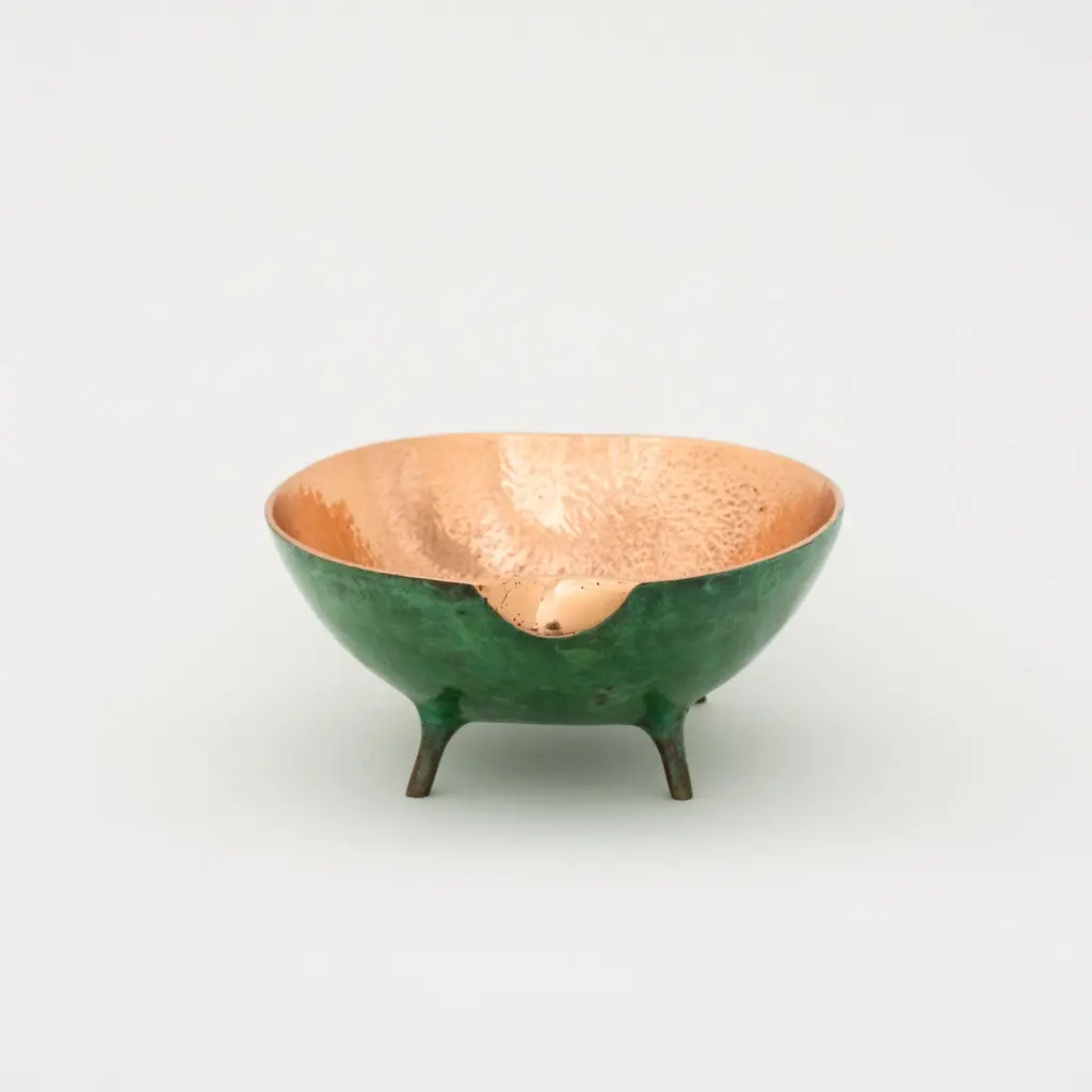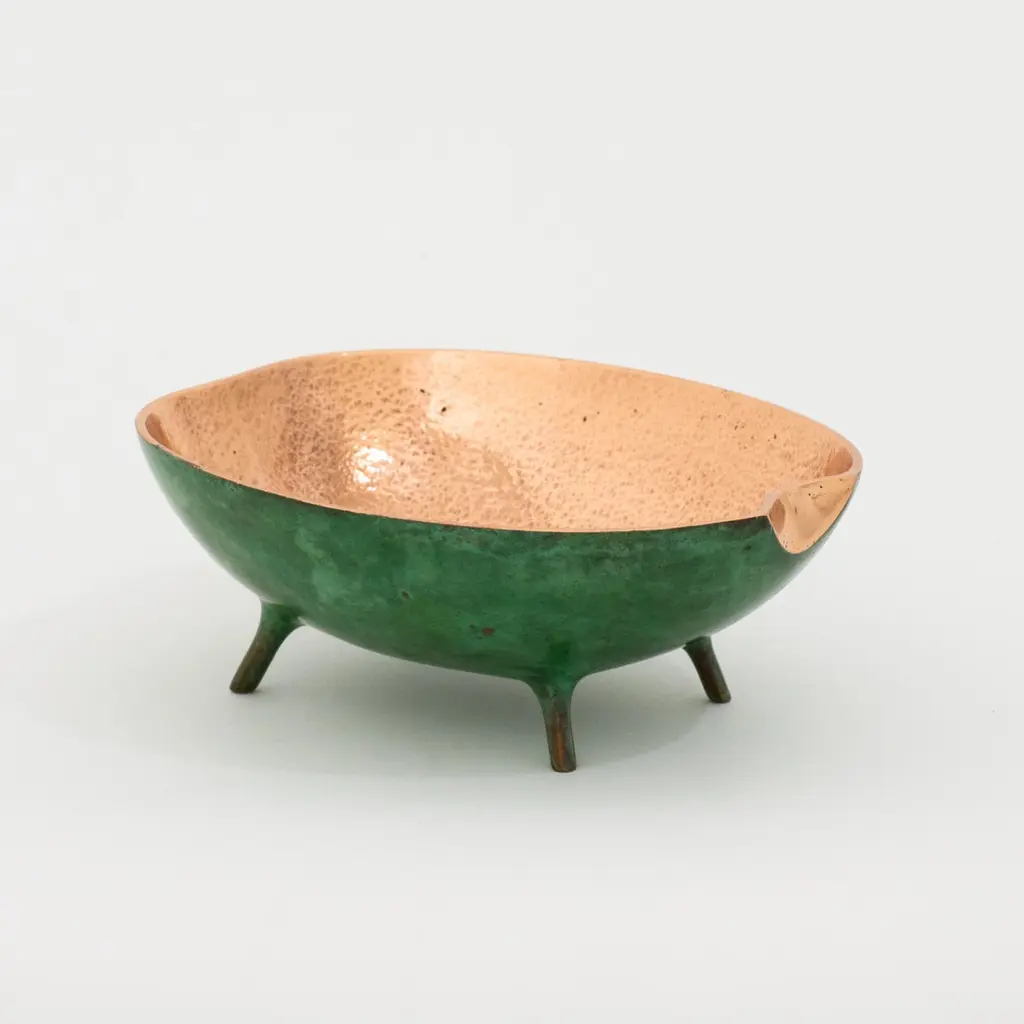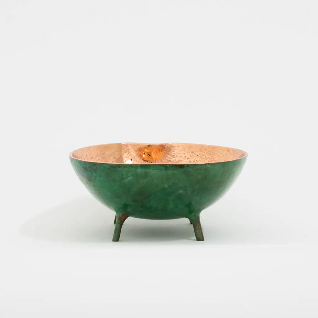Charming and unusual handmade polished cast bronze bowl.Each of these original and elegant bowl is handmade individually. Cast using very traditional techniques, the inside is polished and the outside is aged to show a beautiful copper green effect.Slight variations in polished finishes, patterns and sizes are characteristics of such original handmade creations. These characteristics enhance the beauty of the product and make each piece unique.Dimensions: H 6 cm x W 12 cm x D 14 cm / H 2.37 in x W 4.73 in x D 5.52 inORDERS OF MULTIPLE MIRRORS OF THE SAME TYPE: Please contact us to receive a Packing and Shipping quote when ordering multiple mirrors of the same type. An order for multiple mirrors of the same type may not be accepted without extra packing and shipping fees. Thank you.