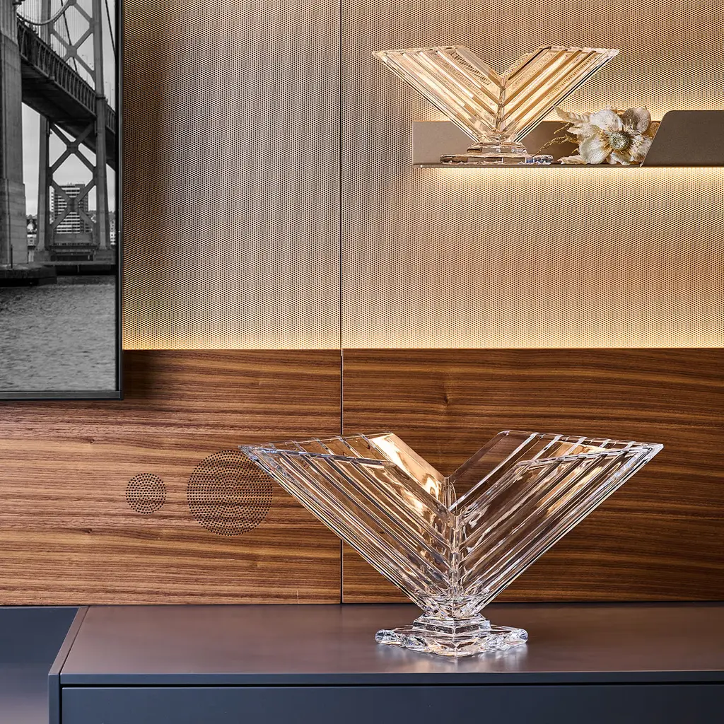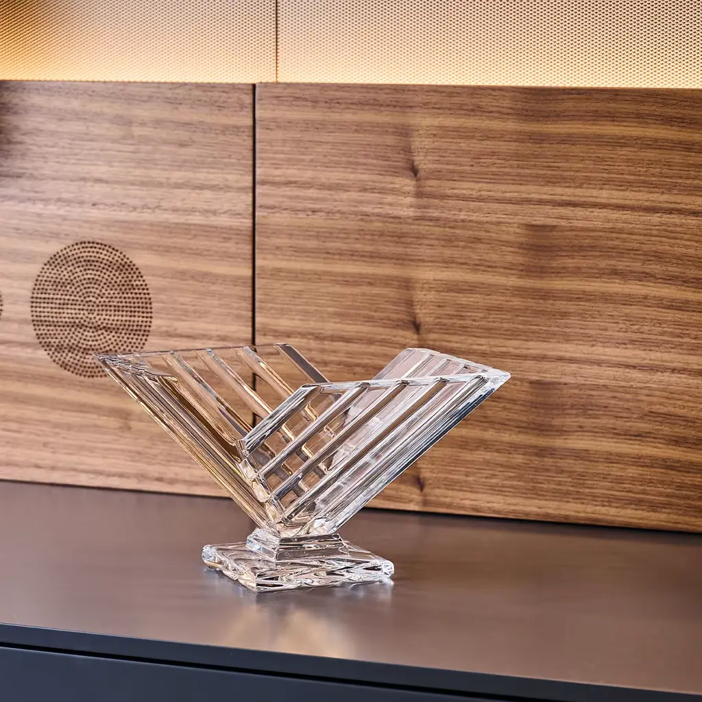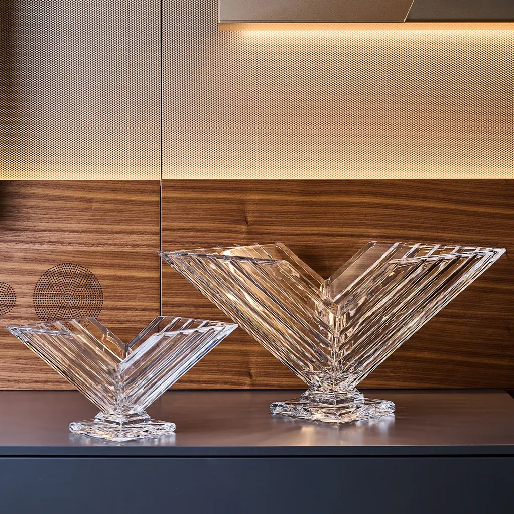 Bowl whose geometrical characteristics permit to the creation of an object of the typical V shape. Completely mouth-blown and hand-cut this object finds its place in any space for a unique contemporary touch.