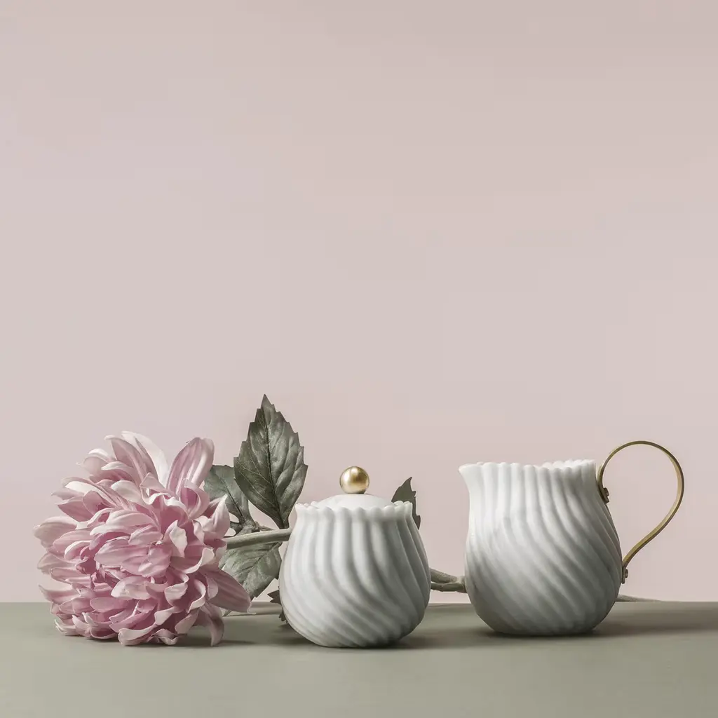 The Victoria collection celebrates the tea ritual by merging the British afternoon tradition with a classic Italian and noble material: marble. This superb sugar bowl, part of the set, features a sinuous, hand-carved relief pattern that creates striking, parallel ripples on the surface of the piece made of Arabescato marble. The soft, opaque white of the precious stone contrasts with the brass accent of the lid's handle for a truly unique object that can be combined with the others to create a cohesive look.