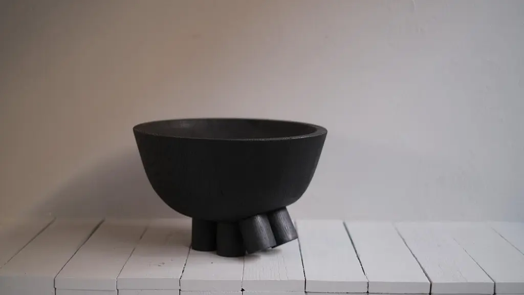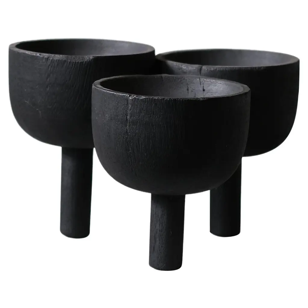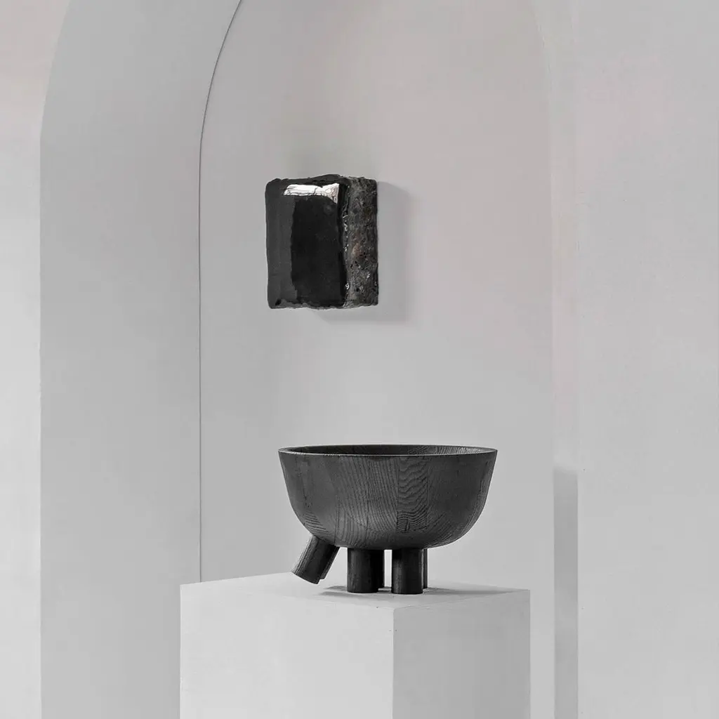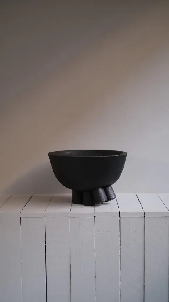 Walking bowl in Iroko wood, Arno DeclercqMeasures: 34 cm L x 34 cm W x 23 cm H13.4” L x 13.4“ W x 9“ HMaterial: Iroko wood Signed by Arno DeclercqArno DeclercqBelgian designer and art dealer who makes bespoke objects with passion for design, atmosphere, history and craft. Arno grew up in a family with parents who like to work with beautiful brands and objects.His father studied at the Royal Academy of Arts Fashion Department, he worked for Bikkembergs and made his own fashion brands, but has also collected tribal arts for more than 20 years. His mother, who worked with his father from the beginning, bought a shoe store in 2010 where they sold brands as Rick Owens, Ann Demeulemeester, Maison Martin Margiela, ... With the interest in beauty he learned from his parents, Arno studied interior design, after learning a lot about materials and with great knowledge of history he designed interiors and opened his own gallery for ethnographic art and design.The collection has come to the idea that there are too few interiors where they no longer have the big and static vases and candlesticks that the people had in big houses over 100 years ago. By focusing on architecture, ancient arts and design, after war buildings, defence buildings (bunkers and fortresses) and tribal arts, he created a collection that became a Classic.Each piece is unique because it is entirely handcrafted by him. Made of tropical hardwood called Iroko this he discovered after one of his many trips to West Africa interested in voodoo arts.In these strange tribal arts, the wood "Iroko" is used in many objects, according to their culture, the ancestors lives in these trees, and they also call this tree "the king of the forest".Arno also combines this with Belgian oak, that dried for more than 30 years, wood that was provided for the many furniture makers in Mechelen.By treating these objects through the Yakusugi technique or another mentioned "Shou Sugi Ban" an ancient Japanese technique where the objects are burned to protect the wood from weathering and subsequently fixed to get a patina look as long as possible. This gives each object a unique texture.