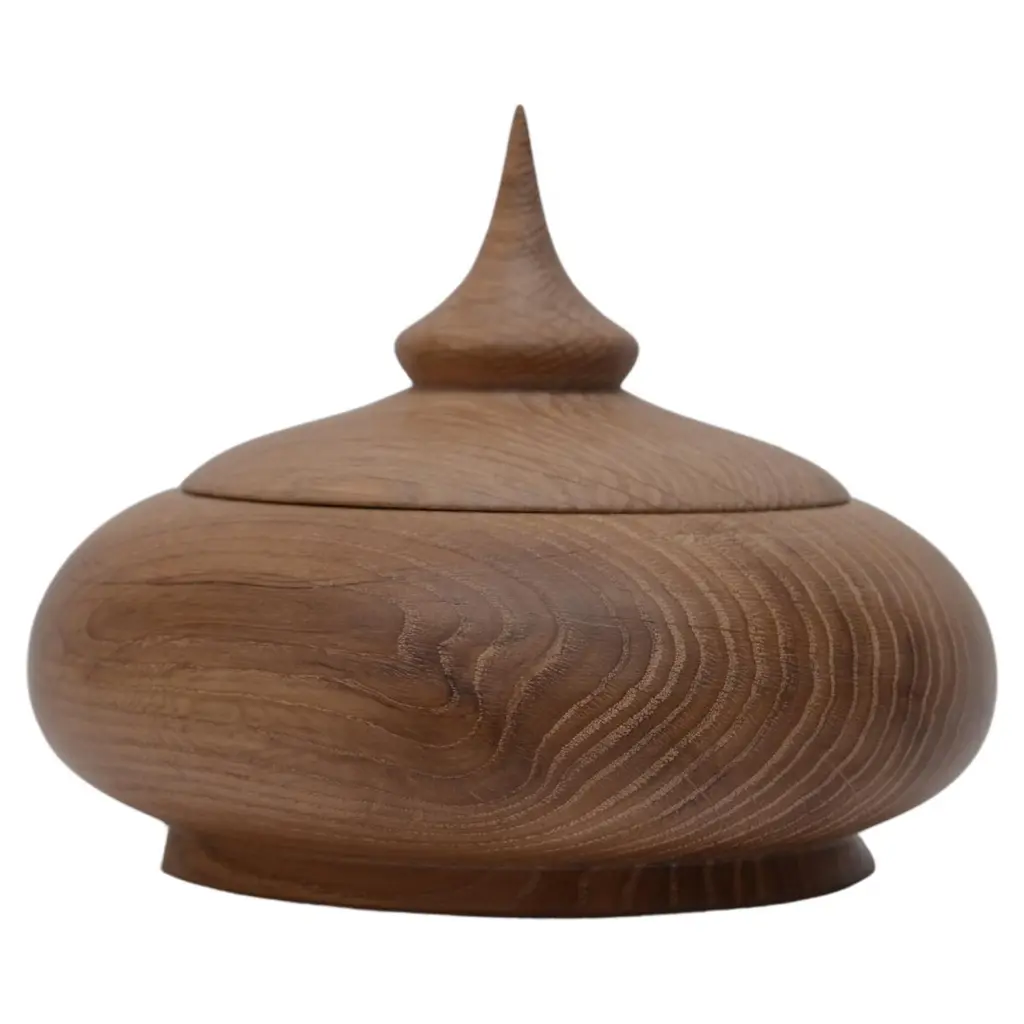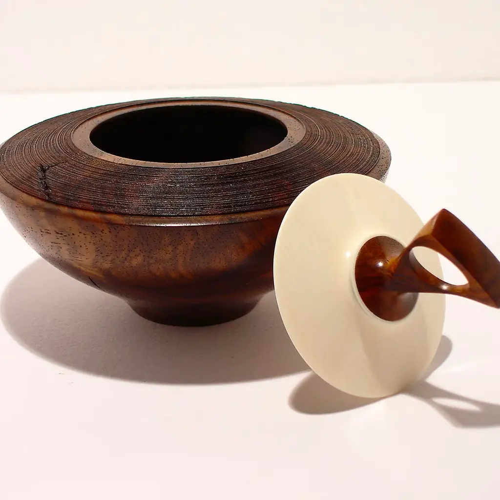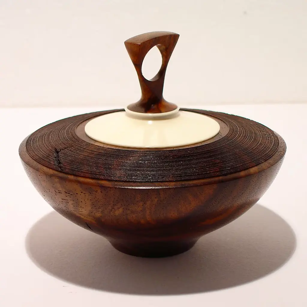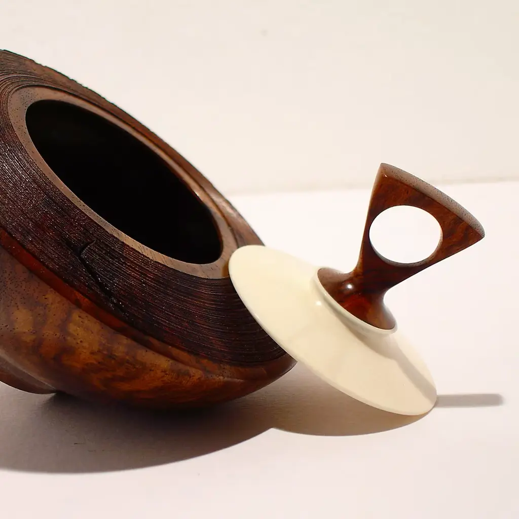 The classic shape of this exquisitely crafted bowl is designed to hold precious items or simply be displayed as a stunning artwork. Evocative of ancient vessels, the round walnut wood bowl showcases the tan background with rich chocolate-brown curly pattern. Perfectly balanced on the lid enriched with a silky ivory Galalith insert, the geometric knob of walnut briar adds a sophisticated and unique touch to this precious object.