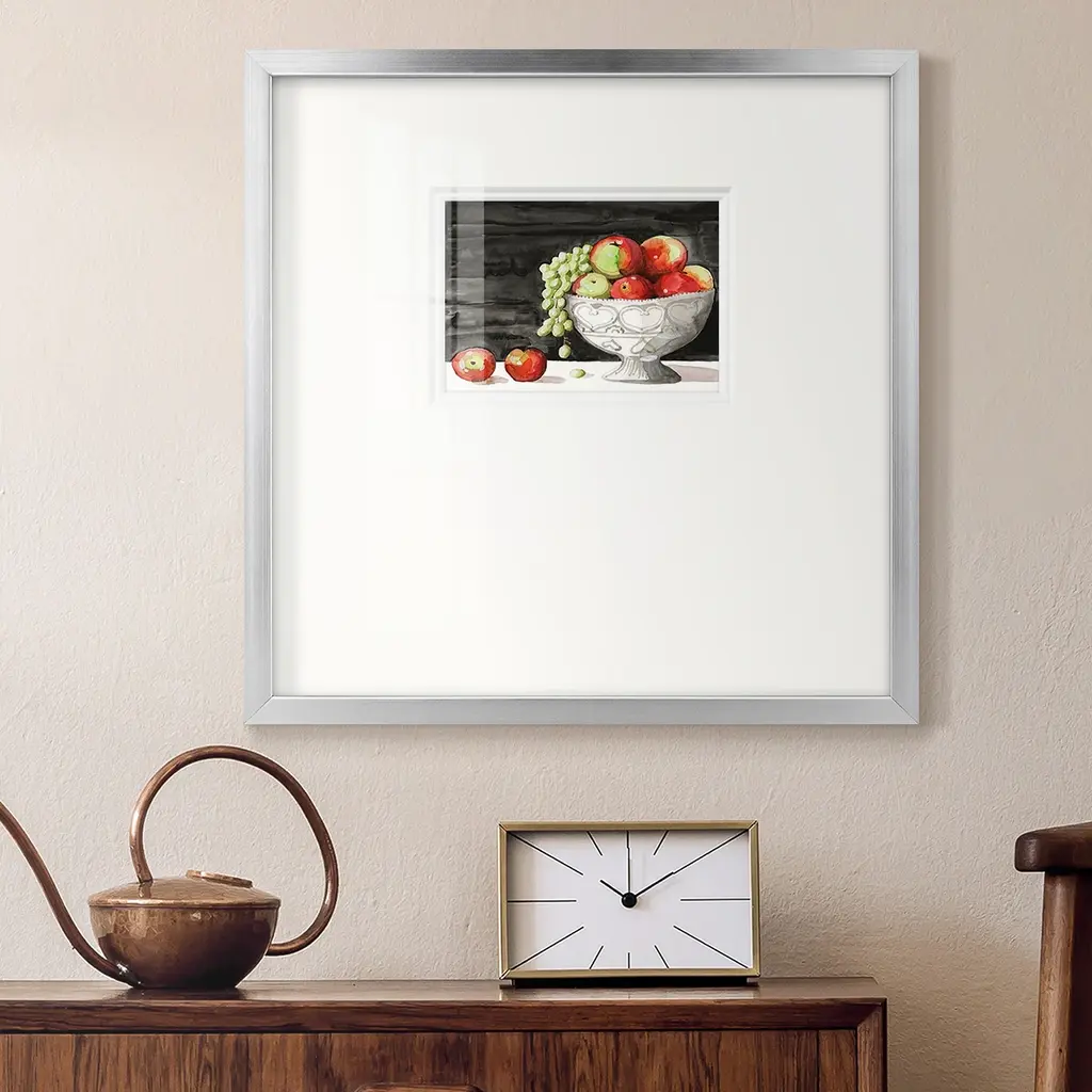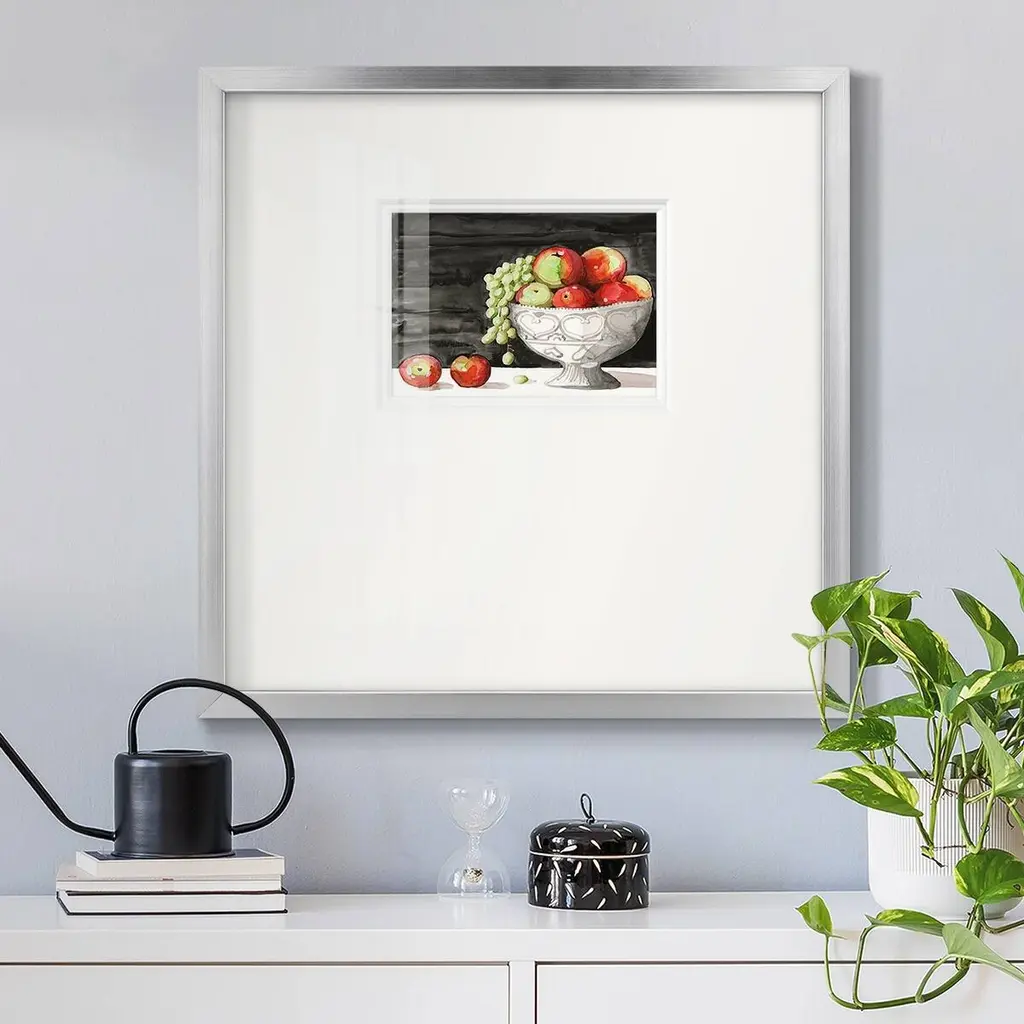 Watercolor Fruit Bowl IPremium Framed Print A framed cold pressed paper print featuring superior double matting and quality frame. 2 SIZES AVAILABLE 16''X16''' - Overall Size 20''X20''' - Overall Size Each piece is made to order. Each piece comes with hanging hardware. Made in the USA Ready to Hang Giclee Paper Print Plexiglass Beveled Matt Board Double Matte Board