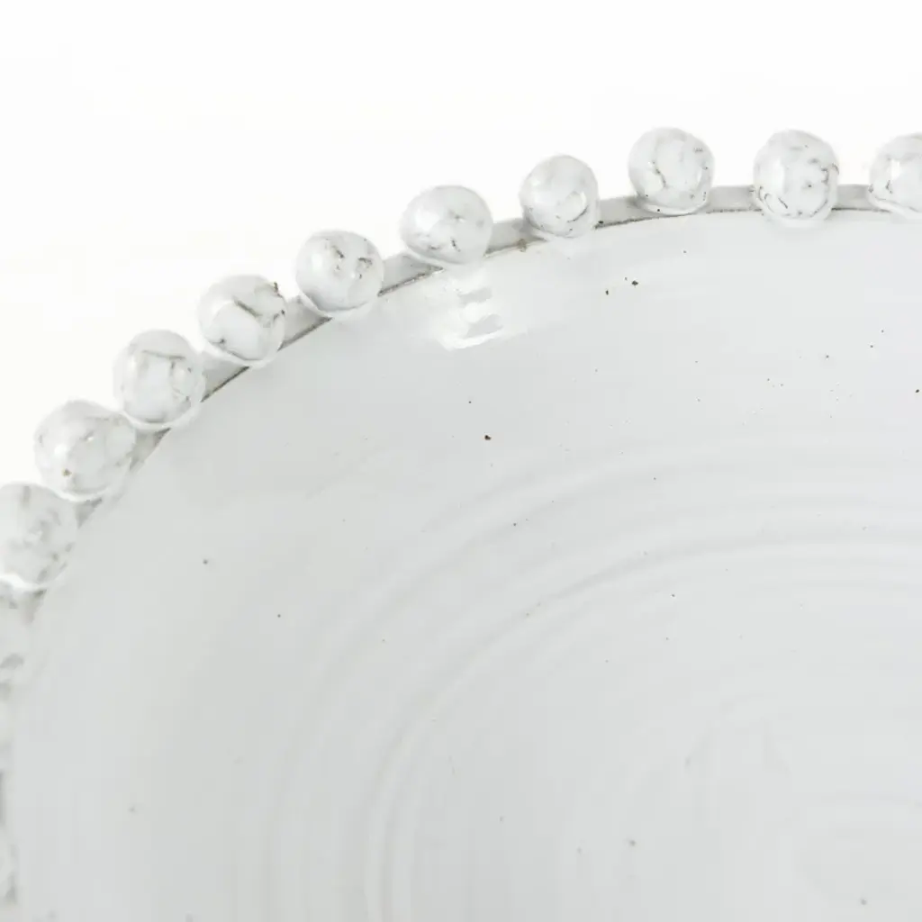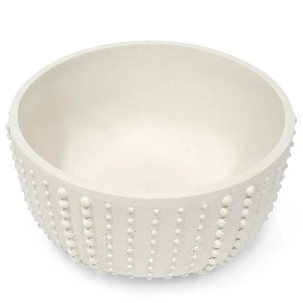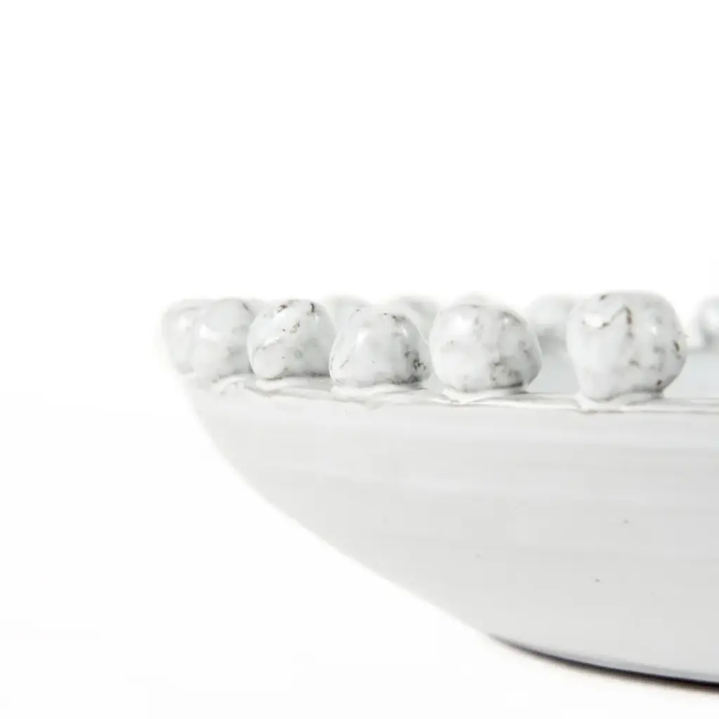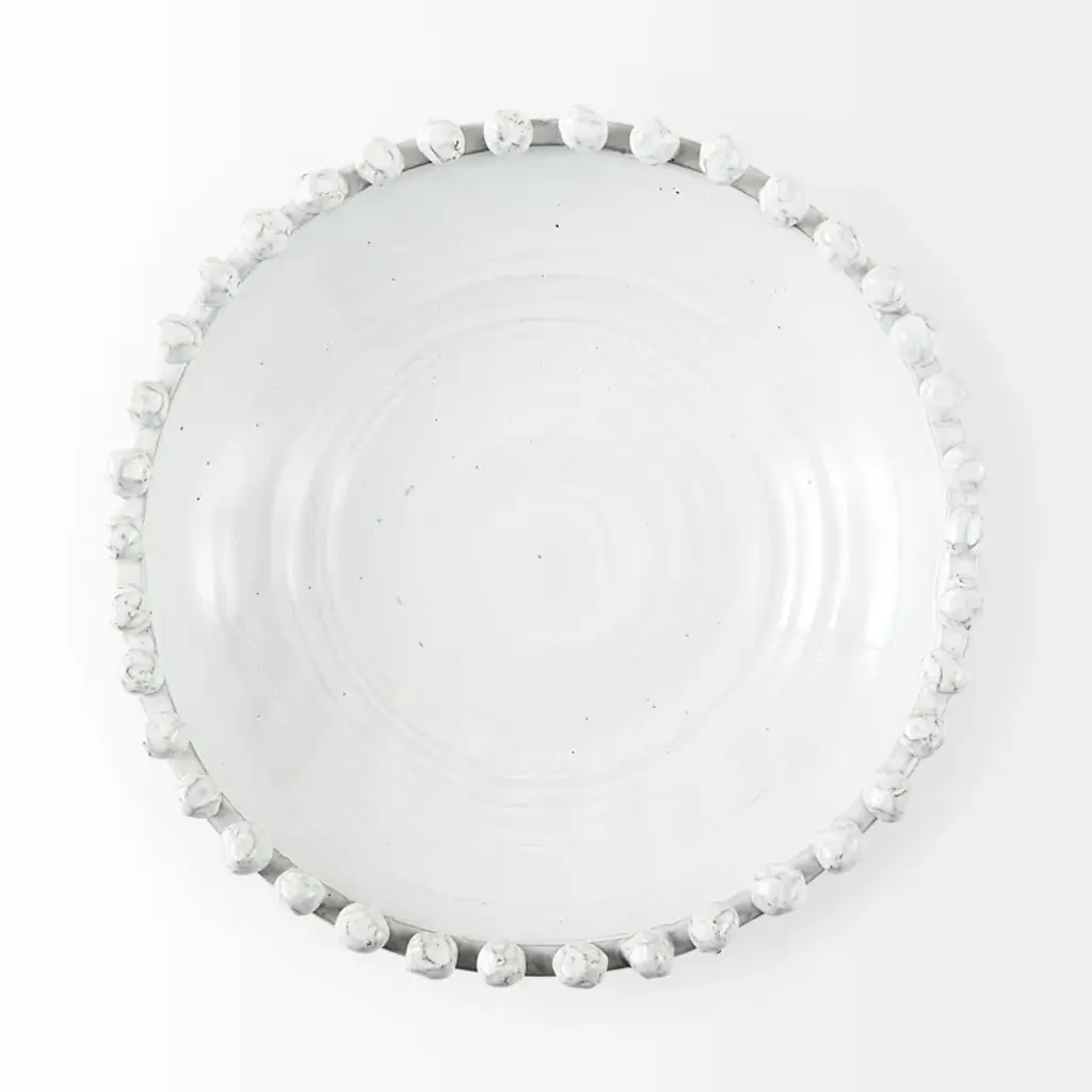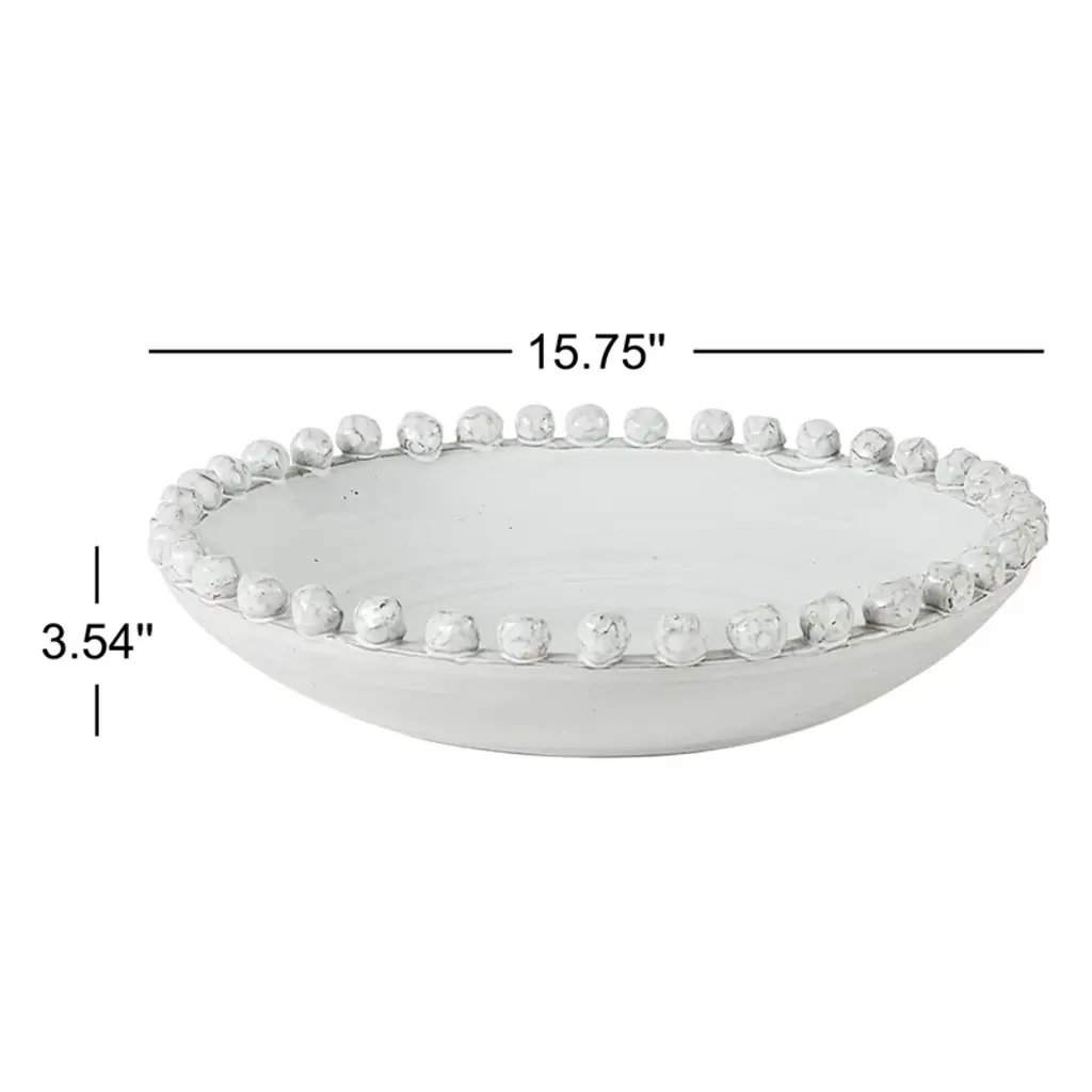 This bowl is a low-profile ceramic bowl that is great as a decor item or can be functional and hold, keys, fruit, or anything you can think of really. It has an off-white finish with handmade ball accents circling the top rim.