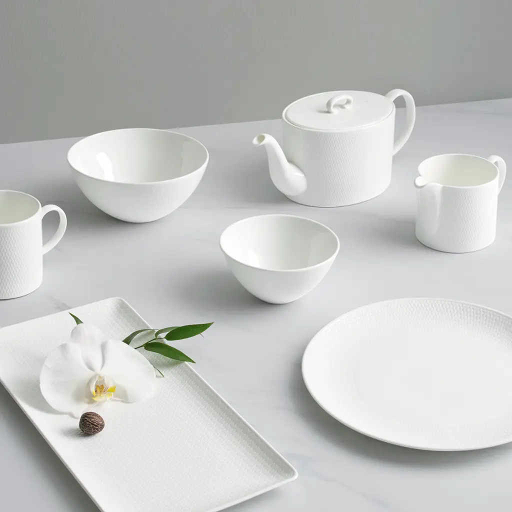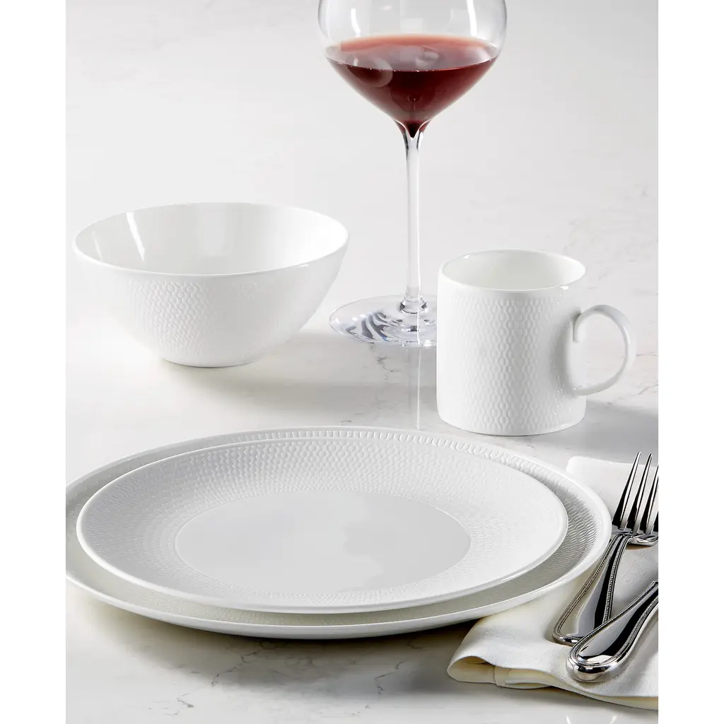 A crisp palette is defined by subtle textured detail in this elegant dinnerware from Wedgwood.