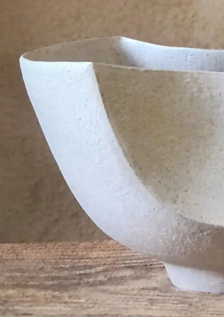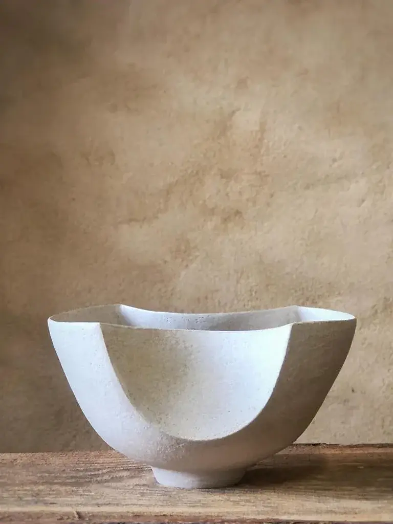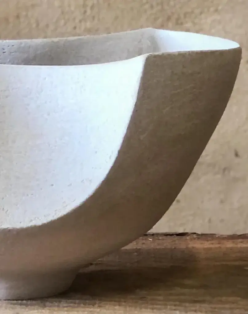 White bowl by sophie vaidie one of a kind. Dimensions: d 20,5 x w 31 x h 16,5 cm. Materials: beige chamotted stoneware and porcelain slip. In the beginning, there was a need to make, with the hands, the touch, the senses. Then came the desire to create and imagine objects to accompany everyday life through a timeless and poetic dimension.