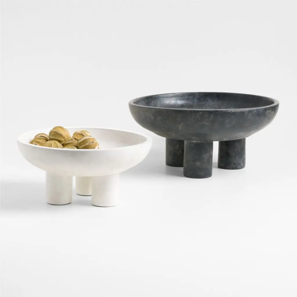 Our elevated centerpiece bowl makes a sculptural statement on a dining table, bookshelf or kitchen island. Formed and finished by hand, the playful piece presents a wide bowl upon three substantial columns. Skilled artisans sponge layers of sheer white and grey paint to soften the bold profile. Use our tri-footed ceramic centerpiece bowl to display botanicals, sculptural objects or a spill of potpourri. Or nest it within the larger black version in a tiered display. It is also perfect, if unconventional, for corralling remotes or magazines on a coffee table..