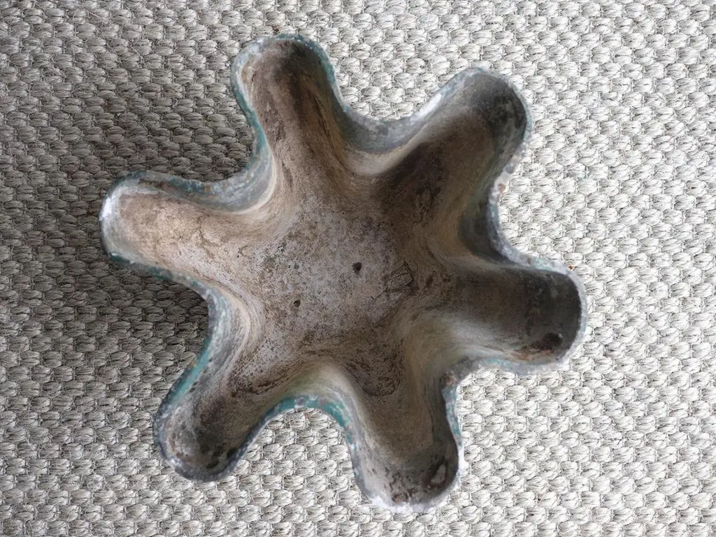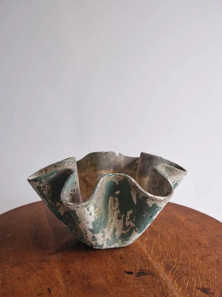 This lovely handkerchief bowl was crafted by Swiss designer Willy Guhl in the mid to late 1900s. It was hand crafted from concrete and is a very sturdy and solid bowl. The colors are deep green and tan, and the worn and "chipped" textures were purposely created to give the bowl and older and antique look.