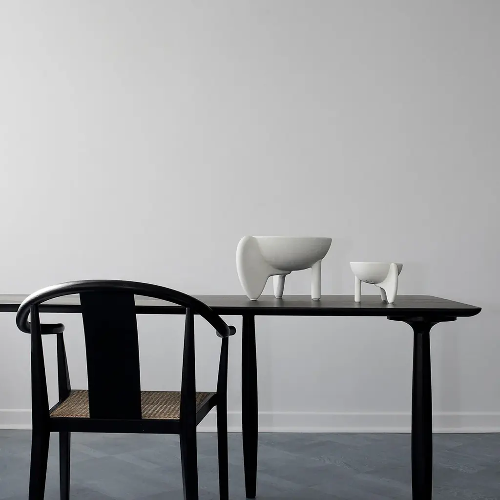 It is all about gravity and a sense of floating through the air. Wing is a sculptural collection of bowls that makes one want to be lifted into thin air even though its presence is very much grounding as well. The silhouette is made up of two wings and a single cylinder-shaped leg as a steady contrast. The bowls are casted in a lightweight fiber concrete. Use Wing as a container or as a standalone art piece on the table. Note that it is not 100% waterproof. Designed by Kristian Sofus Hansen & Tommy Hyldahl.