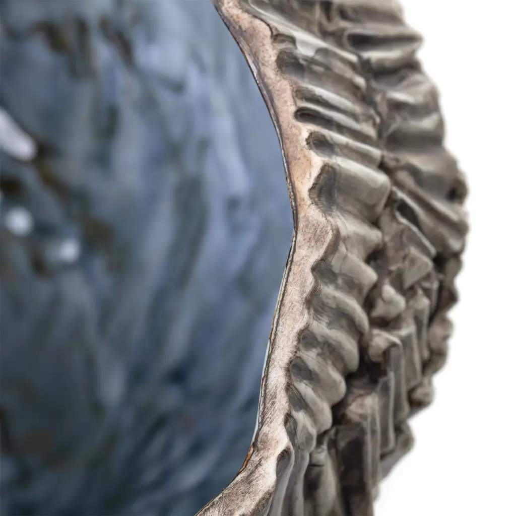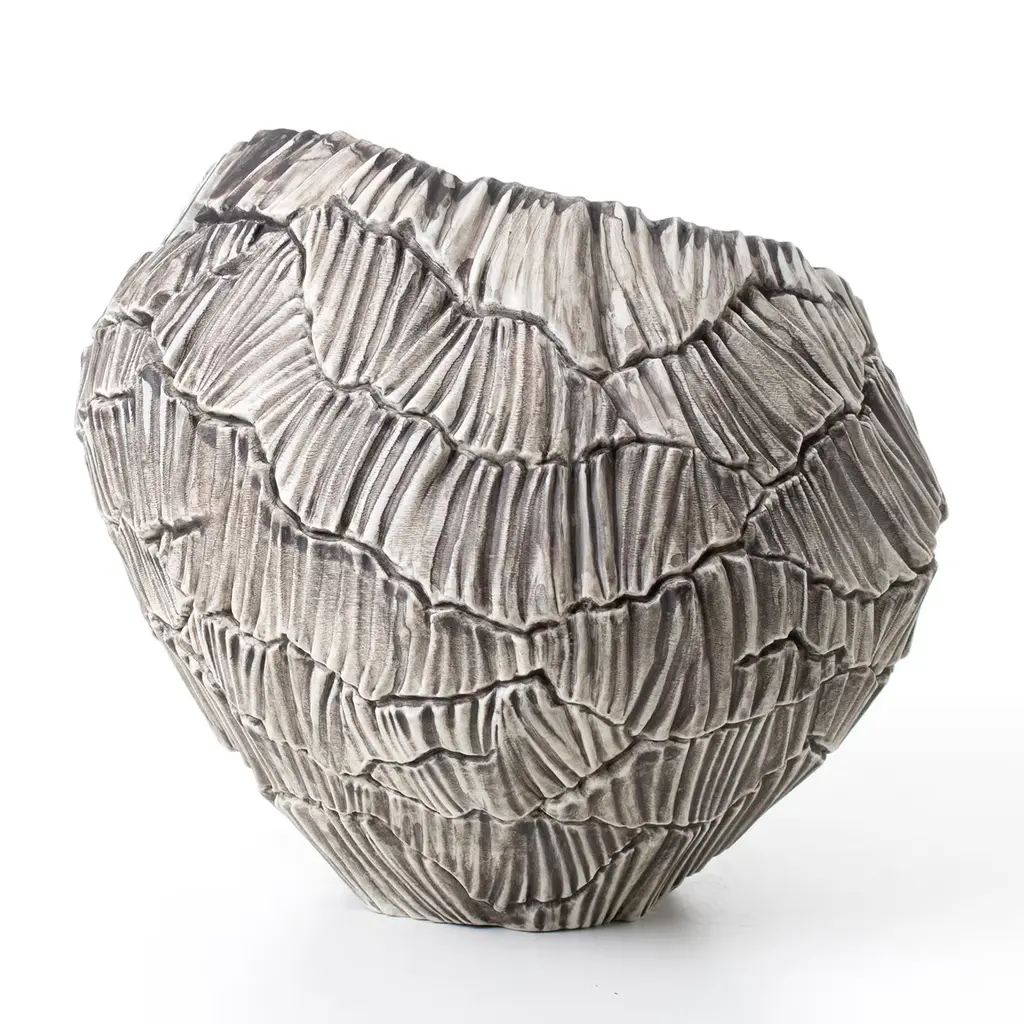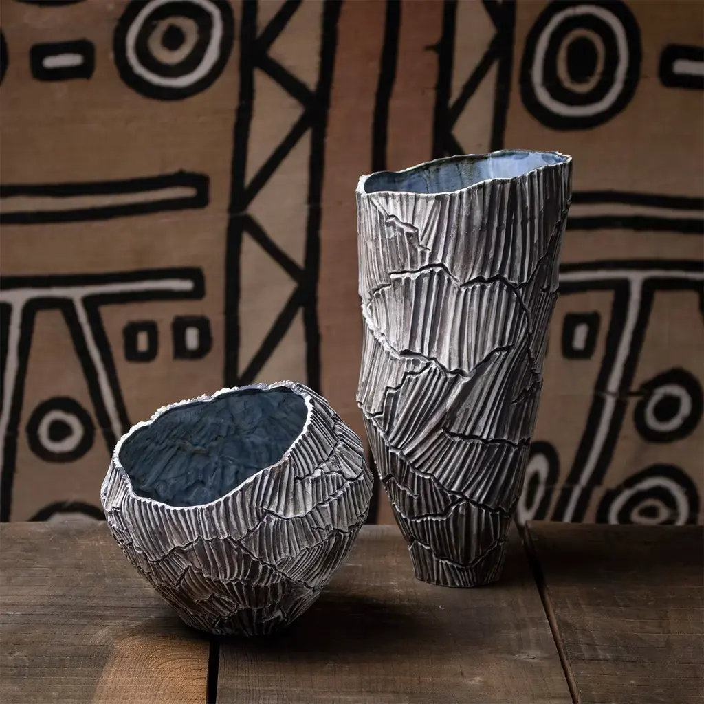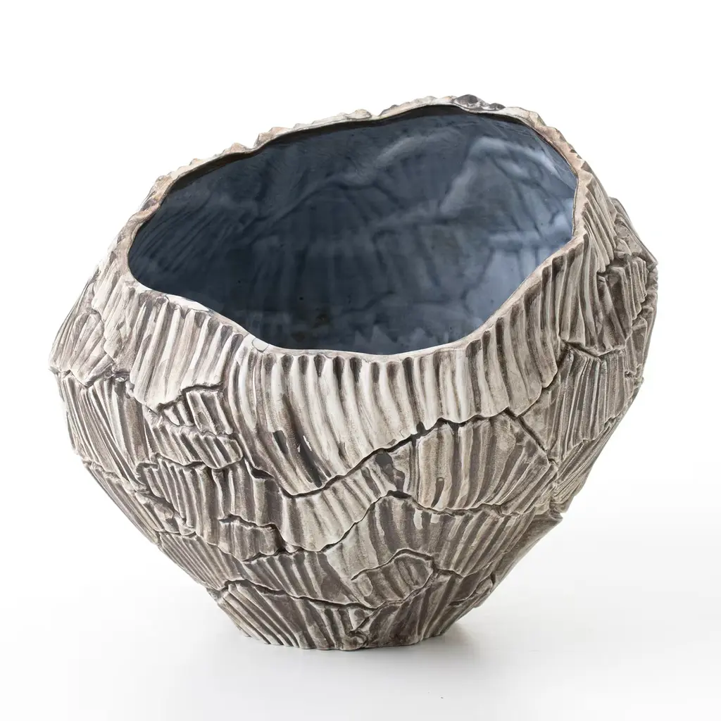 Zefiro Rock is a porcelain decorative bowl, part of Anemos Collection. The soft curves of canals shaped by wind create a unique rhythm on the surface, interrupted by the deep cracks of a dry land. This bowl is decorated with metal oxides which create unique earthy shades on the outside and light blue shades on the inside.