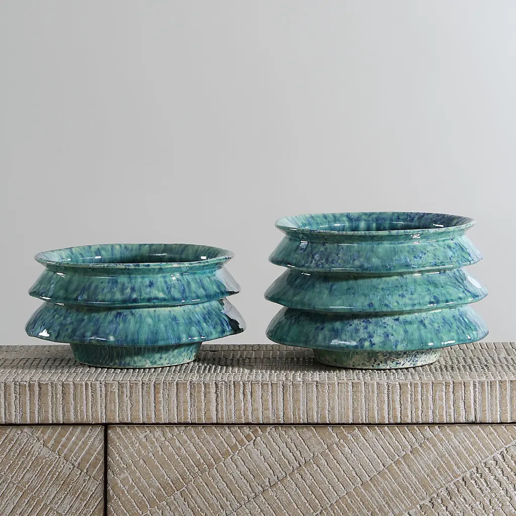 Introducing Our Stunning Set Of Two, Accordion Style Ceramic Bowls, With A Harmonious Blend Of Nature's Hues. Crafted With Care And Adorned In A Captivating Blue And Green Reactive Glaze. Sizes: S- 10x5x10, L- 10x7x10