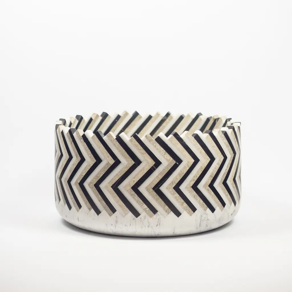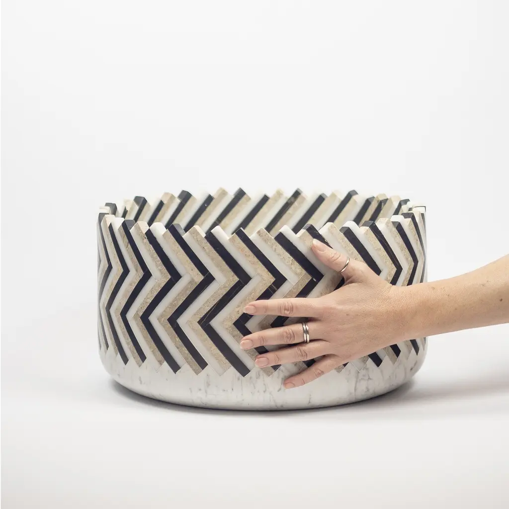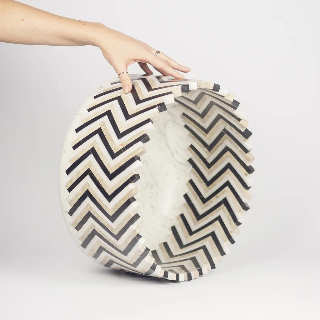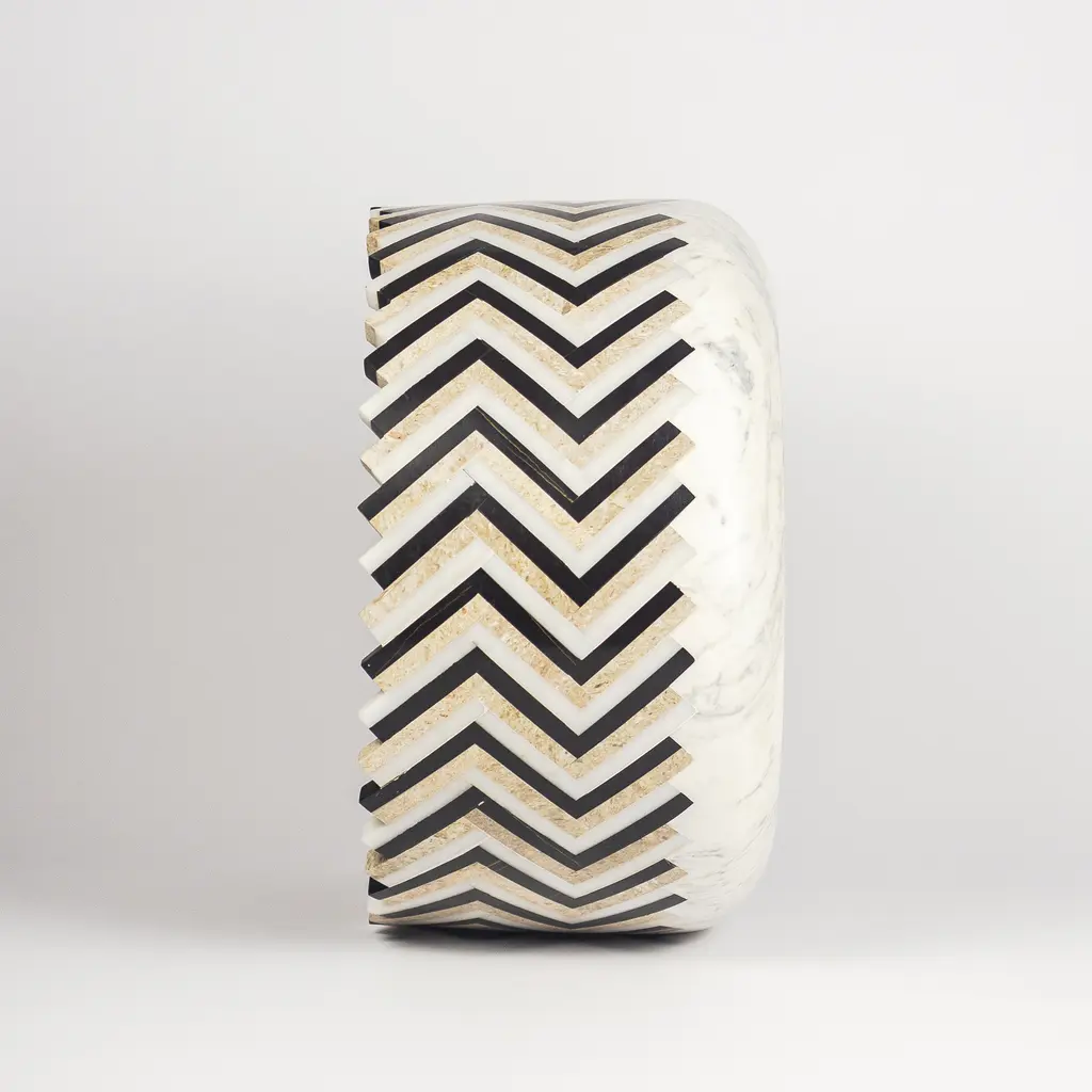 The traditional “Tunisian stitch”, or crochet work, provided the source of inspiration for the ZigZag series. Designed by Italian studio Gumdesign, this stone vessel is as fascinating to admire as it is to hold. The zigzag pattern stands out against the darker or lighter bases. Made from Tunisian stone, or Foussanna Grigio della Tunisia marble, the decorative bowl also features recovered glazed ceramic from the end of the 19th century. As a result, each product is one of a kind and a veritable collector’s item. Handmade by skilled artisans, the ZigZag is the perfect centerpiece for a dining table or living room.