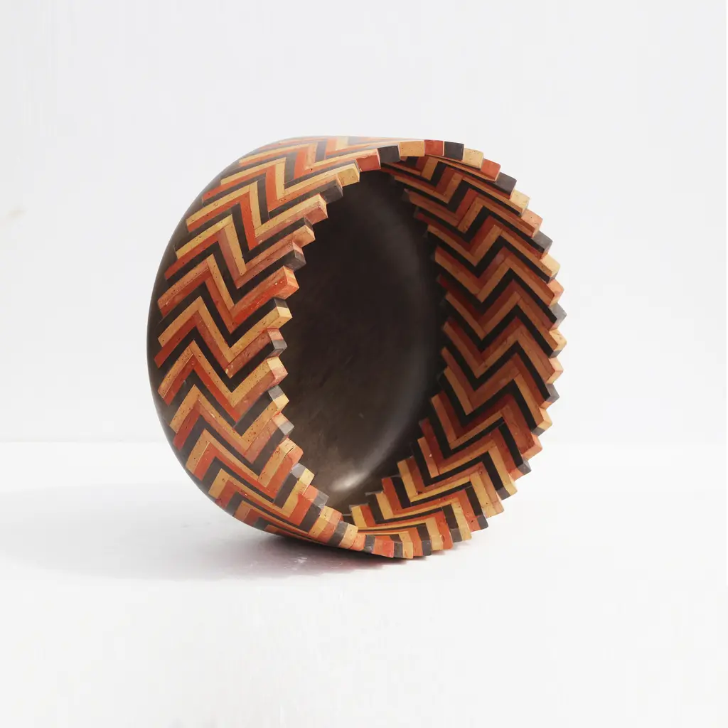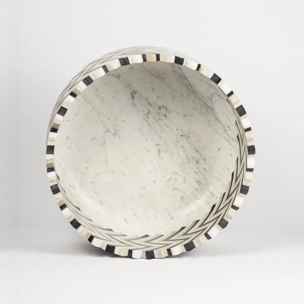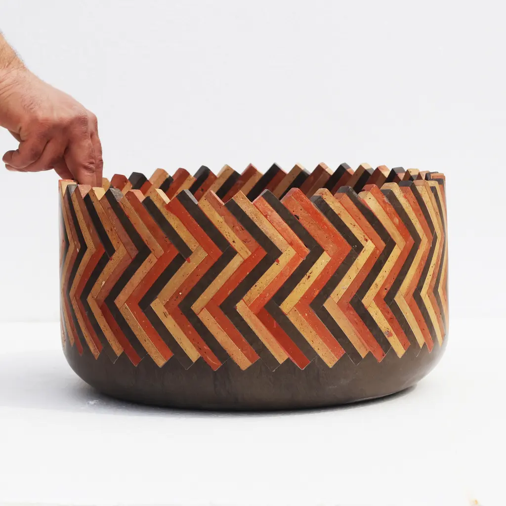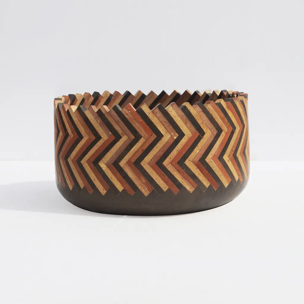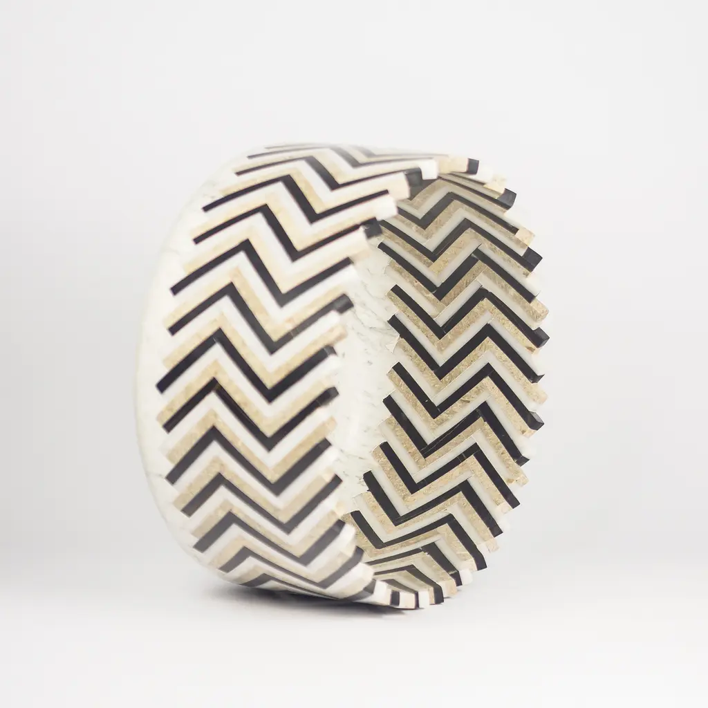 The traditional “Tunisian stitch”, or crochet work, provided the source of inspiration for the ZigZag series. Designed by Italian studio Gumdesign, this stone vessel is as fascinating to admire as it is to hold. The zigzag pattern stands out against the darker or lighter bases. Made from Tunisian stone, or Foussanna Grigio della Tunisia marble, the decorative bowl also features recovered glazed ceramic from the end of the 19th century. As a result, each product is one of a kind and a veritable collector’s item. Handmade by skilled artisans, the ZigZag is the perfect centerpiece for a dining table or living room.