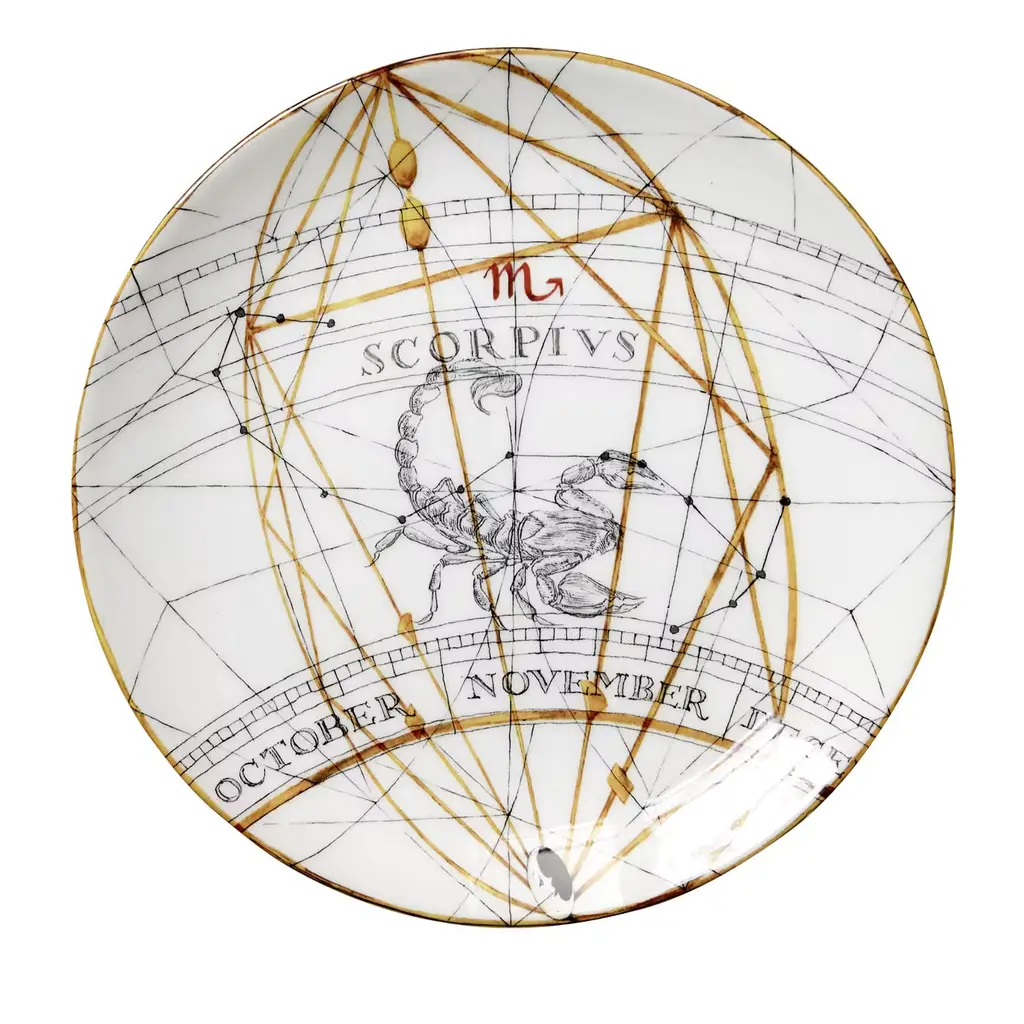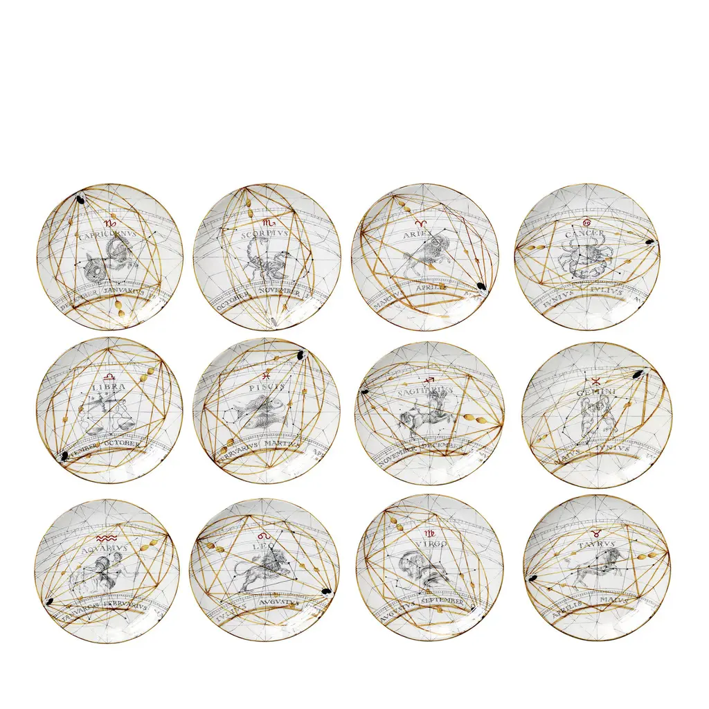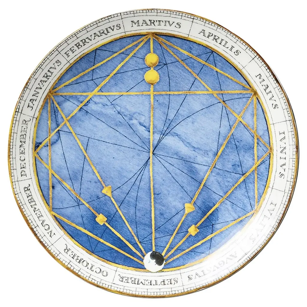 This superb ceramic bowl is part of the Zodiaco collection introduced at the Milan Furniture Fair 2017. The bowl features a round center in pale blue crossed with golden lines connecting the twelve months of the year, named in Latin. The edge is highlighted with a golden line. This plate will enrich with elegance and color any table.