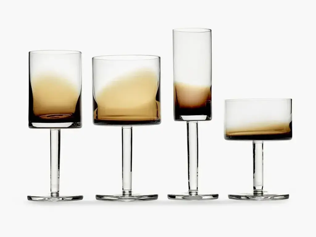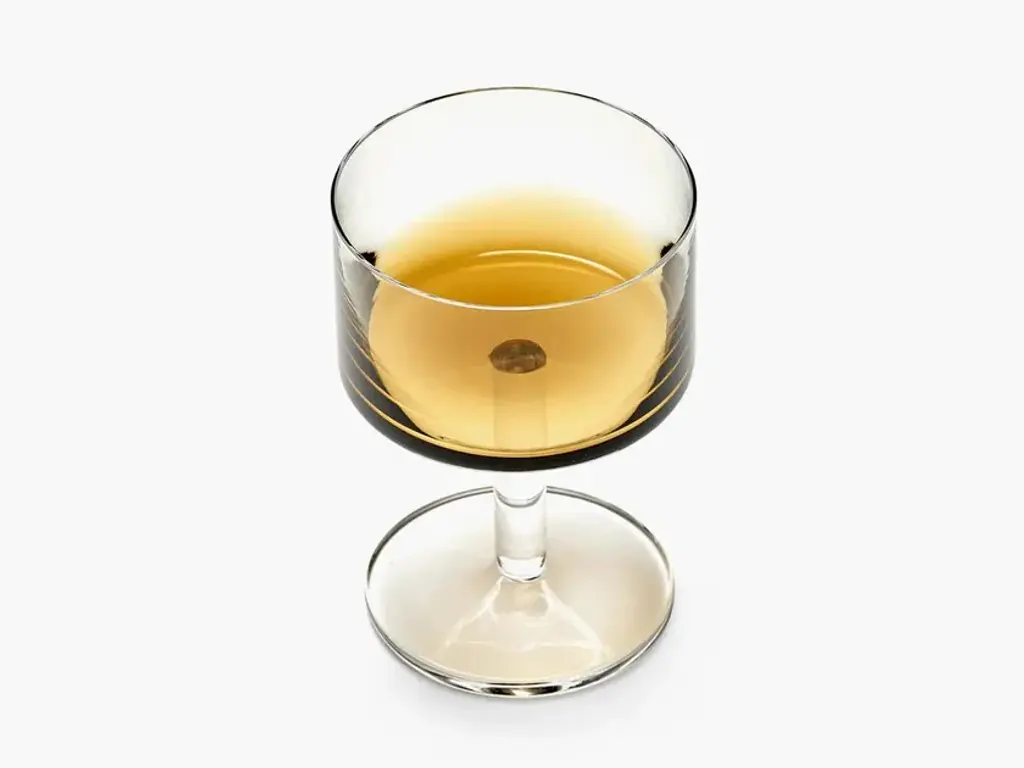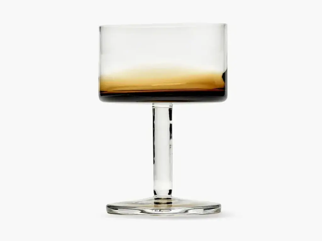 Zuma amber champagne coupe is a potassium glass champagne coupe.Discover the refined charm of the 'Zuma' Champagne glass from the exclusive Kelly Wearstler collection. With an amber tone obtained by a process of three layers of glass, this glass evokes the vintage atmosphere of antique glassware. The unique colour gradient is an elegant contrast with the thick glass base and streamlined shape.Material: potassium glassDishwasher resistant: yesKelly Wearstler started from a digital graphic pattern, inspired by Bauhaus principles, to design Zuma, her range of porcelain tableware. Each pattern is hand-stamped onto the pieces for a hand-painted look and feel, after which the glaze is applied. The patterns vary and you can easily mix and match the different shapes and colors – white, dark gray, and soft orange which is used as an accent color.