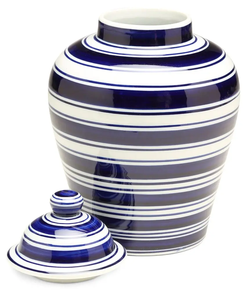 Designed with classic stripes in blue and white, this porcelain ginger jar is sure to stand out on any shelf, console, or mantel.