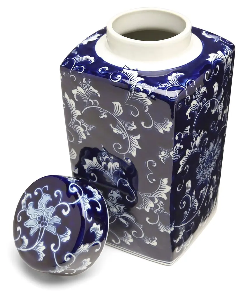 Designed with classic floral motifs in blue and white, this porcelain ginger jar is sure to stand out on any shelf, console, or mantel.