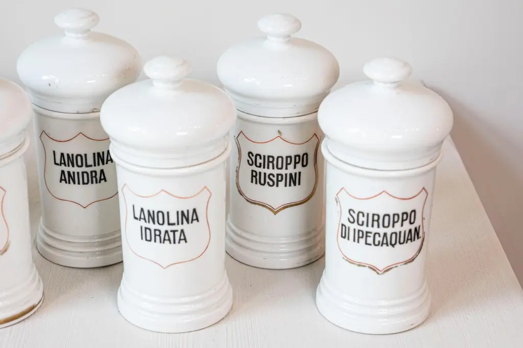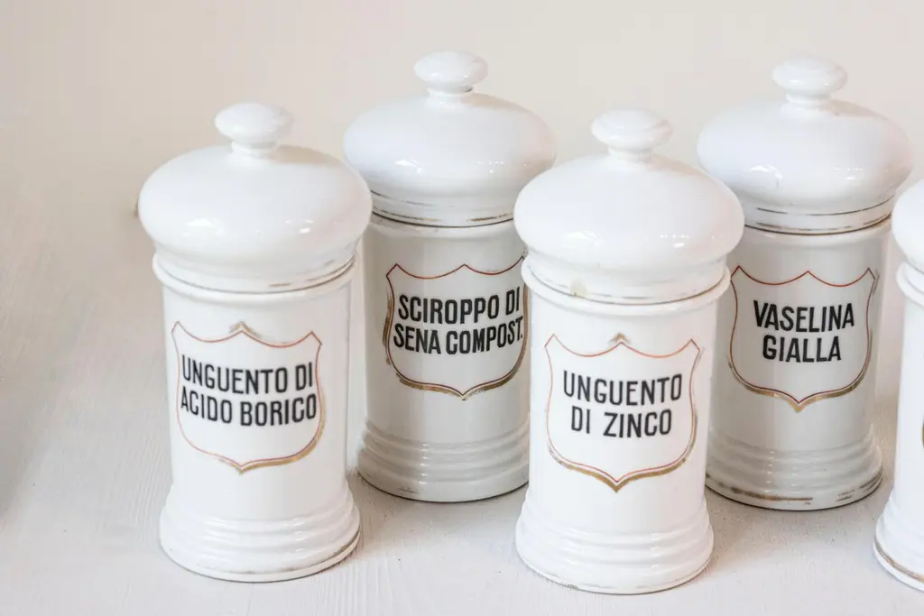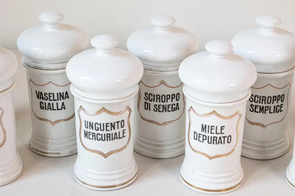 13 Vintage Italian Porcelain Pharmacy Jars With Labels, Sold Each