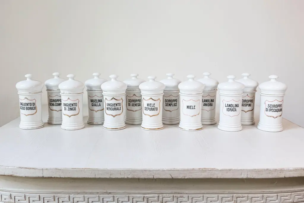 This set of 13 vintage Italian porcelain pharmacy jars offers a glimpse into the meticulous organization of historical apothecaries. Each jar is crafted from white glazed porcelain, showcasing a cylindrical form with a domed lid for an elegant and functional design. The jars feature original labels framed with gold-trimmed shields, marked with contents such as “Unguento di Zinco,” “Miele Depurato,” and “Sciroppo di Senega.” Likely dating from the early to mid-20th century, these jars are both decorative and practical, reflecting the careful craftsmanship of Italian pharmaceutical traditions. Perfect for display in kitchens, bathrooms, or as part of a vintage collection, these jars blend classic design with historical charm. Each jar is sold individually, making them versatile additions to any interior space.