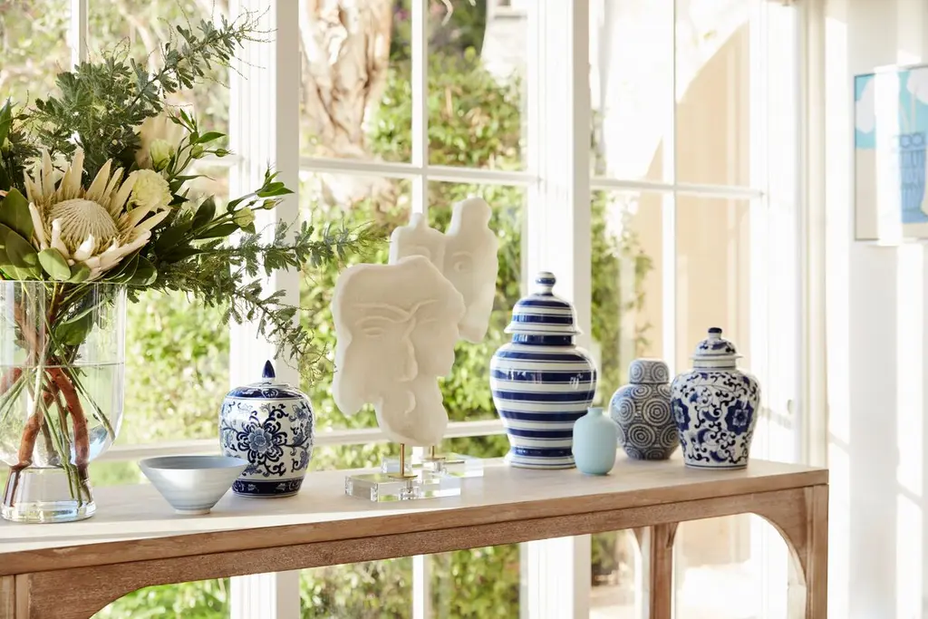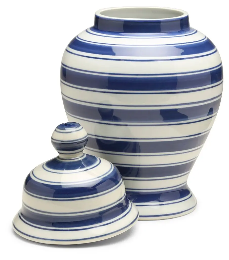 Designed with classic stripes in blue and white, this porcelain ginger jar is sure to stand out on any shelf, console, or mantel.