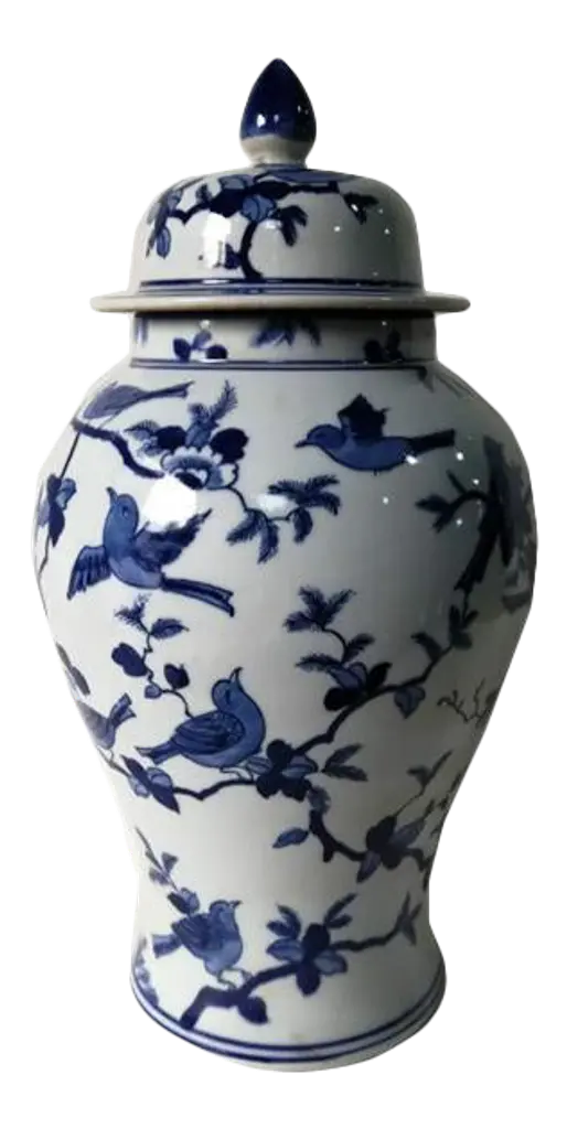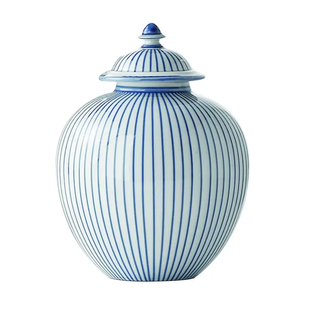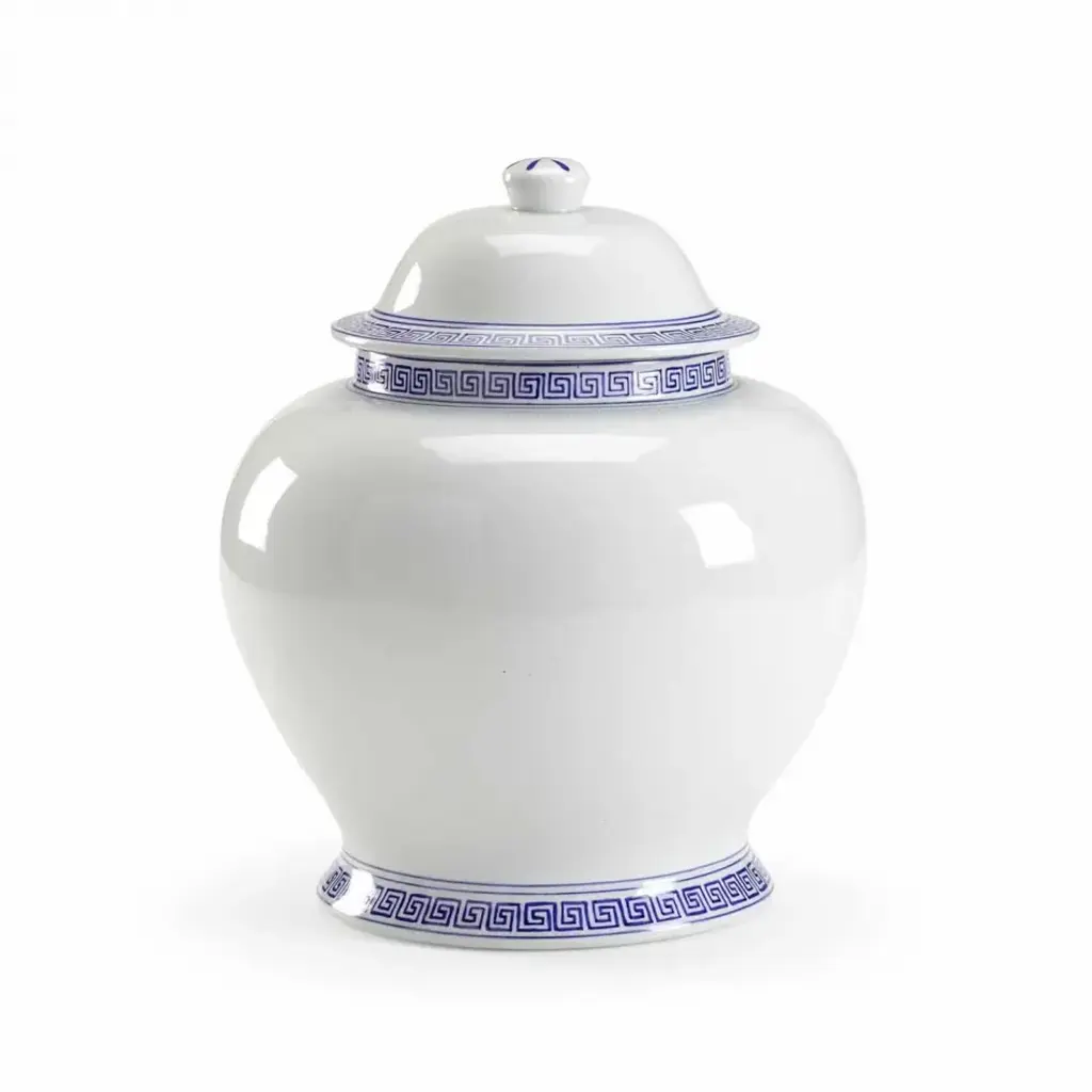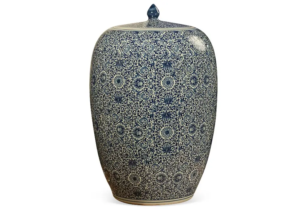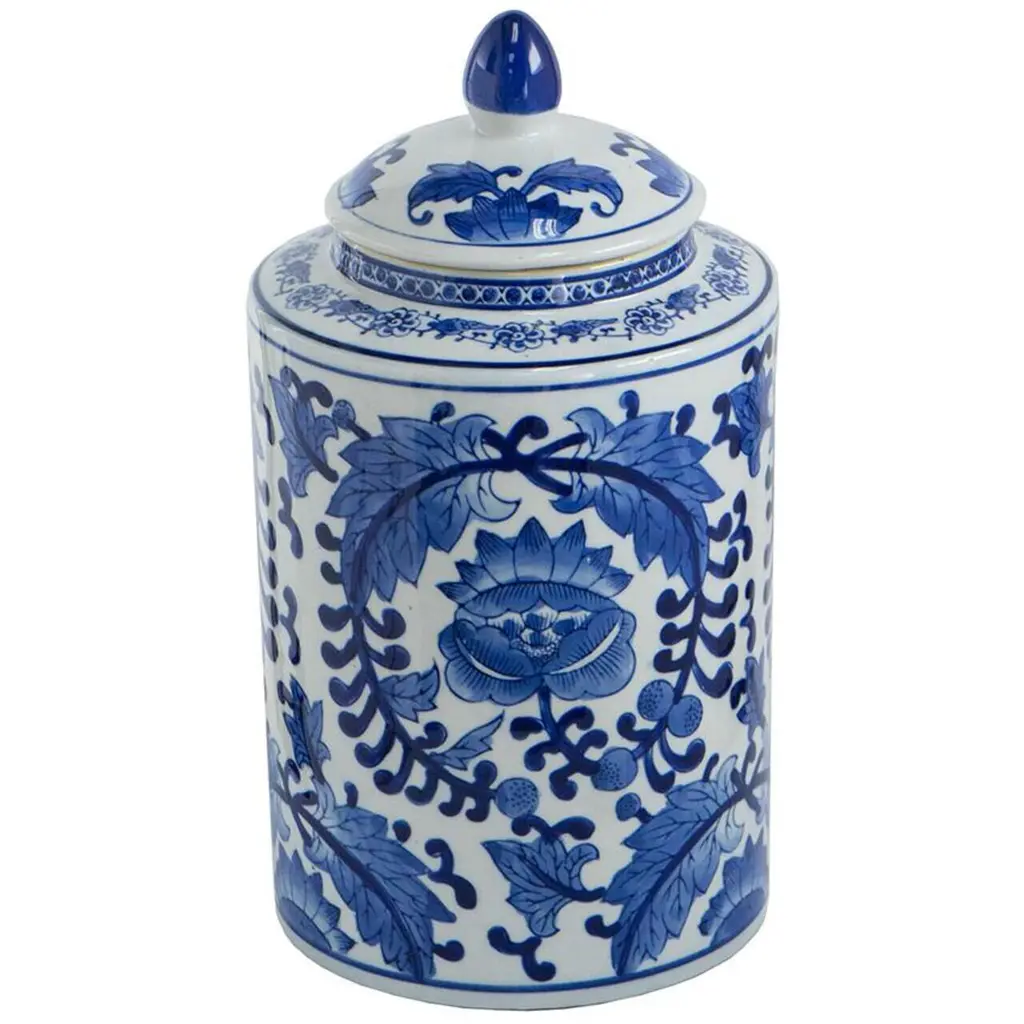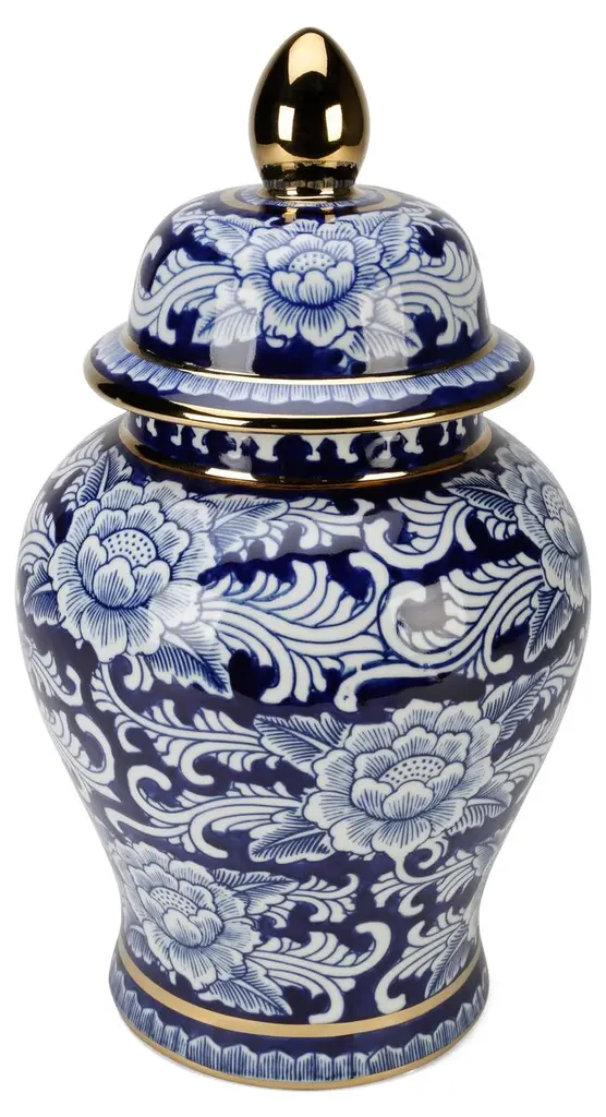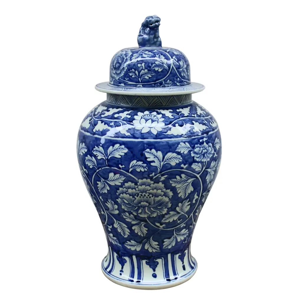 Beautifully crafted of porcelain, this temple jar shows off a classic silhouette enhanced by iconic lotus motifs and a bright blue finish.