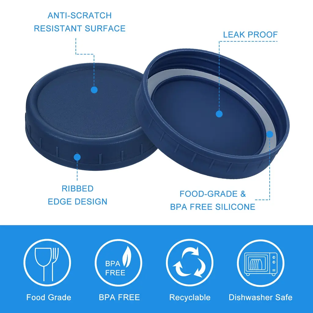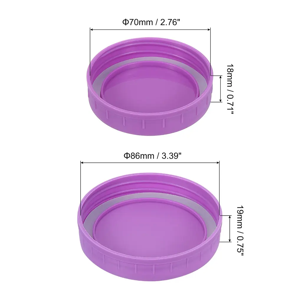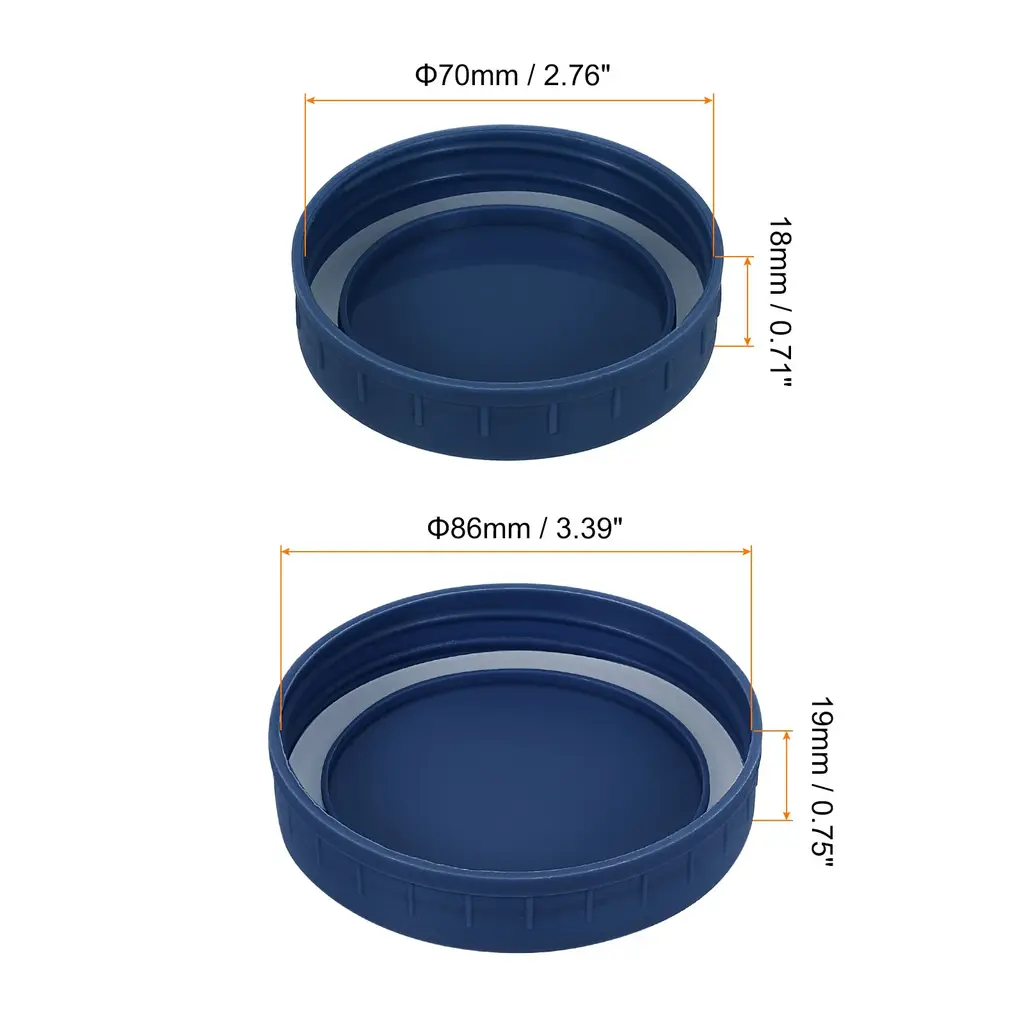 Description:[Material]: The Mason jar lid is made of good-quality plastic. The thickened material is sturdy, durable, and odorless. Each Mason jar lid comes with a silicone ring that is removable for easy cleaning. It is very suitable for storing food.[Design]: Our Mason jar lids feature vertical stripes on the edges to increase friction and prevent slipping, making it easier to tighten or open the lid. It is equipped with a silicone ring, which has strong sealing and can effectively prevent the contents of the bottle from leaking out.[Beauty and Convenient]: The lid can be easily cleaned with a cleaning brush. Its bright color can enhance the visual appeal of the jar, and add a touch of bright color to your Mason jar.[Application]: Plastic jar lid is suitable for a variety of jars such as Mason jars and Ball jars. They can be used to hold many different types of food such as candy, cereals, fruits, salads, etc. Their portability and leak-proof design make them a great choice for outdoor picnics, camping, or traveling.SpecificationMaterial: PlasticColor: Dark BlueRegular Mouth Lid Size: 70 x 18mm / 2.76 x 0.71inch(ID*H)Wide Mouth Lid Size: 86 x 19mm / 3.39 x 0.75inch(ID*H)Package Content: 9 Pcs Wide Mouth Lid; 9 Pcs Regular Mouth Lid