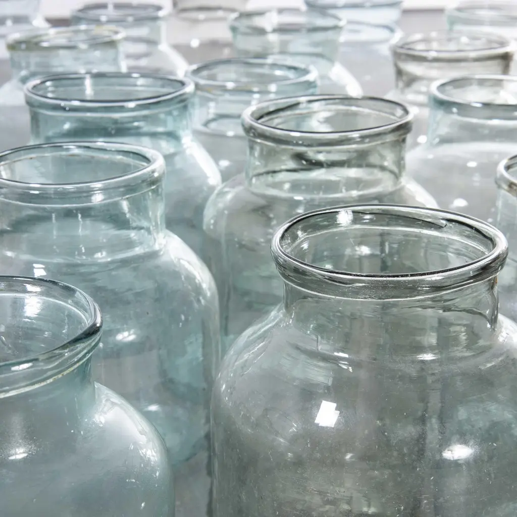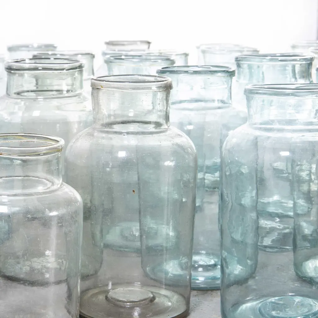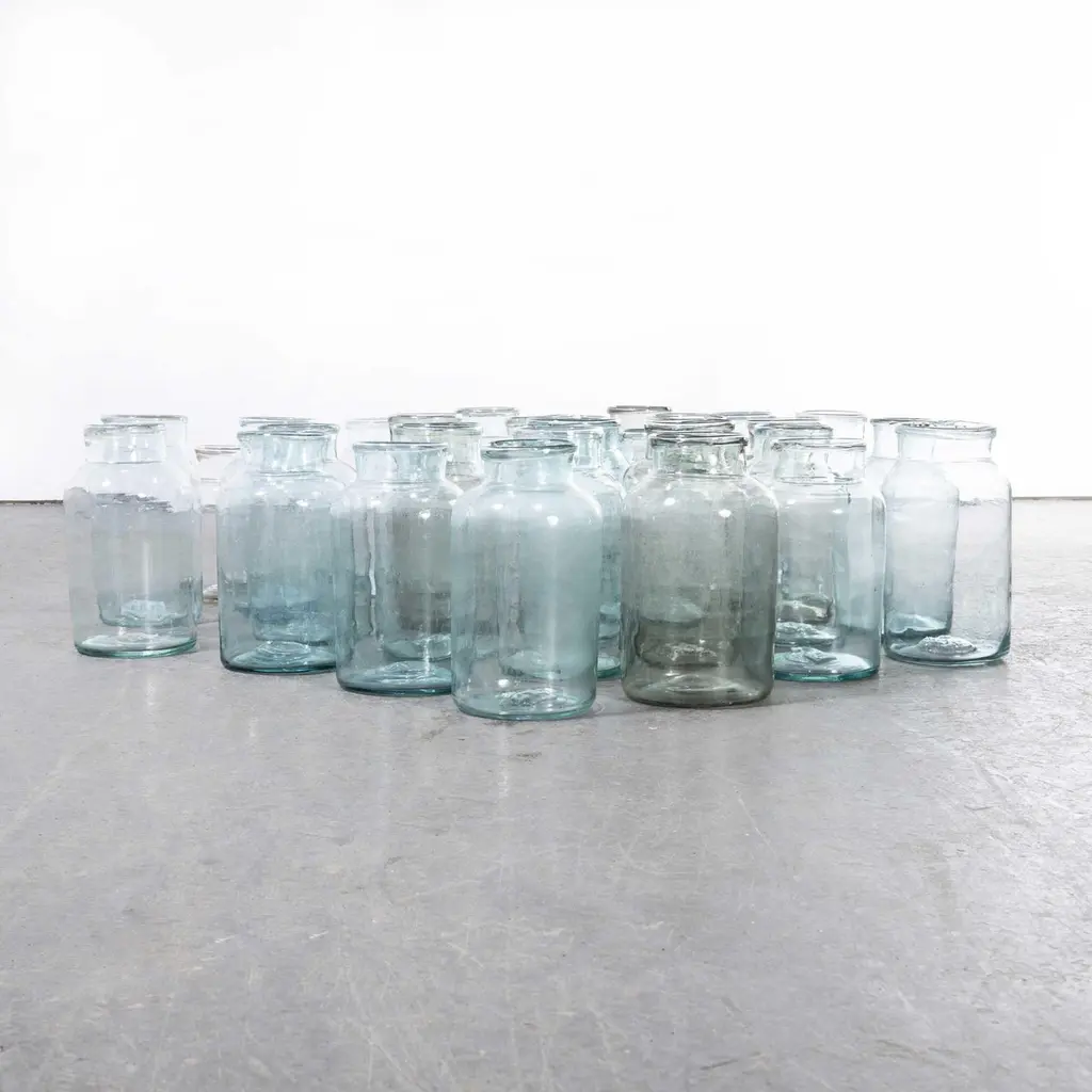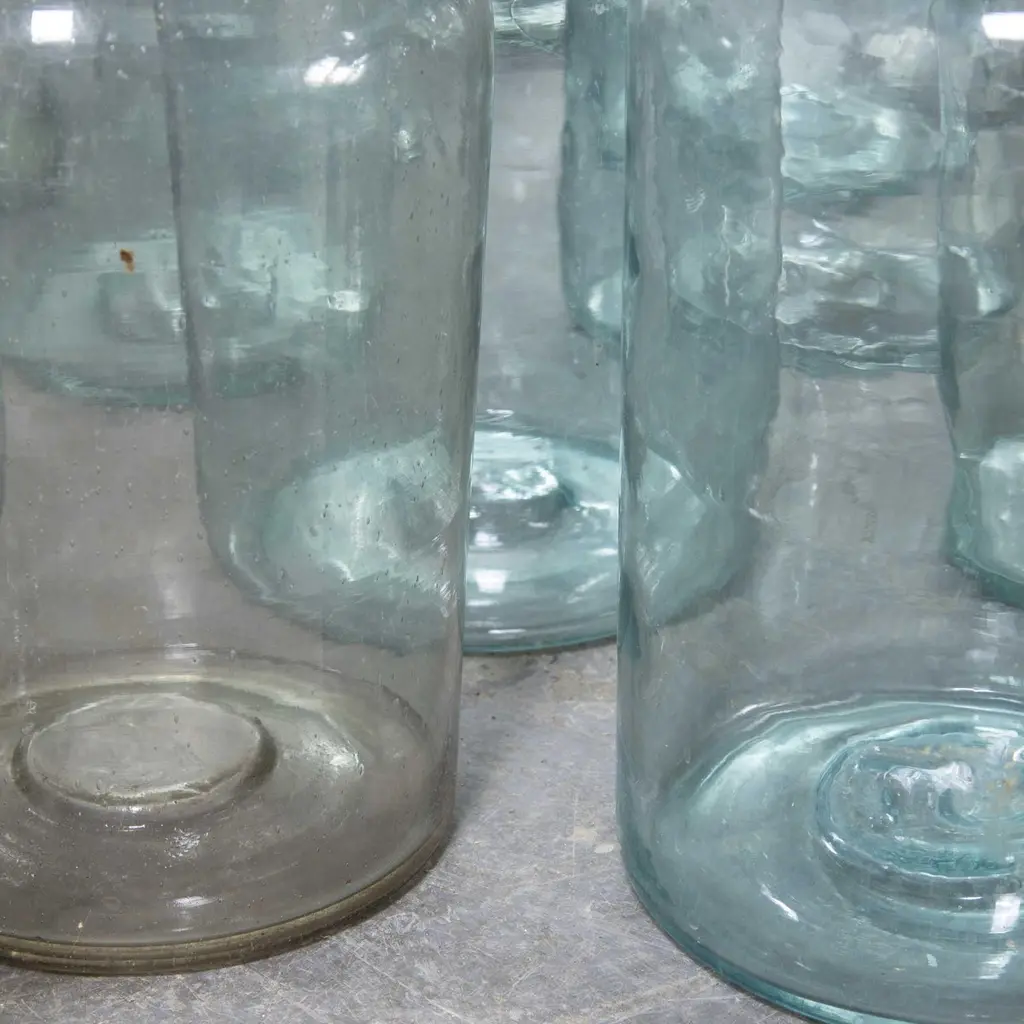 1940’s Mouthblown Hungarian storage storage jars – large1940’s Mouthblown Hungarian storage Storage jars – large. Traditional handmade storage jars made in small workshops in Hungary these are beautiful vintage storage jars, mouthblown locally. The top edge is hand rolled and the beauty is that every piece is different. The jars are collected from local villages where they were traditionally used by families for the storage of pickles and other kitchen goods. They were genearally sealed with cork or wood lids and then wax sealed and covered with a cloth. We can’t be precise on age but they are generally from the 1920’s through to the 1950’s. Average diameter is 15cm and height 28cm.Workshop reportOur workshop team inspect every product and carry out any needed repairs to ensure that everything leaves us serviced and maintained ready for many more years of life. All of our vintage products show the rich beauty and history of their life with the knocks and bumps of many years of use and we try to minimise restoration to keep every piece as original as possible.Date: 1940'sMaker: Handmade - HungaryDimensions: L 15 x W 15 x H 28 cm.