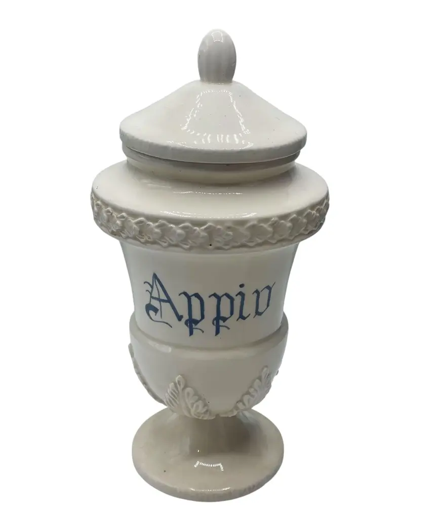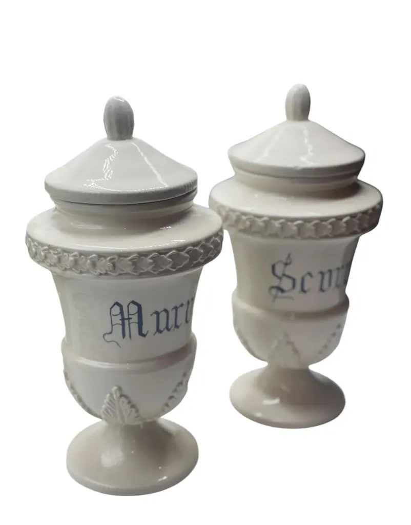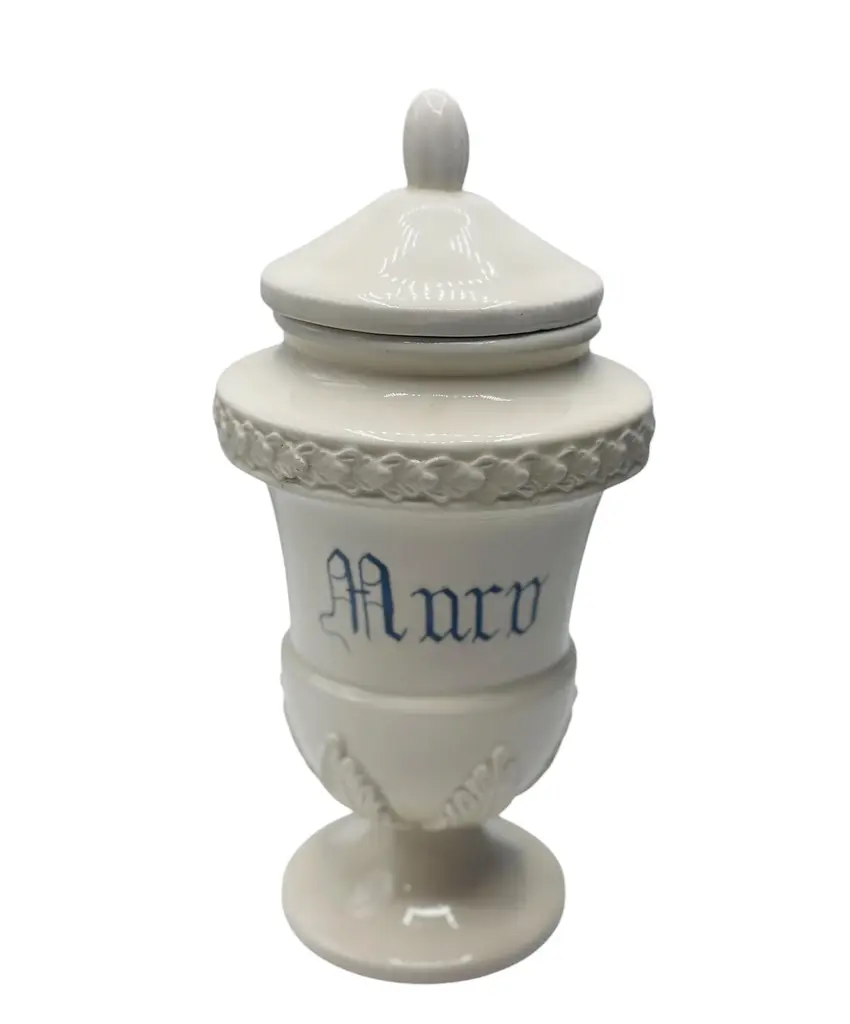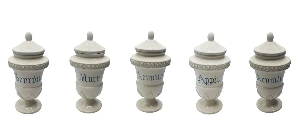 These exquisite 19th century French ceramic apothecary jars are a stunning blend of elegance and history. Featuring raised foliage detailing that gracefully frames the top and base, each jar is beautifully labeled in hand painted blue script, adding to its old world charm. The intricate craftsmanship and classic design make these jars perfect for collectors. Five available.