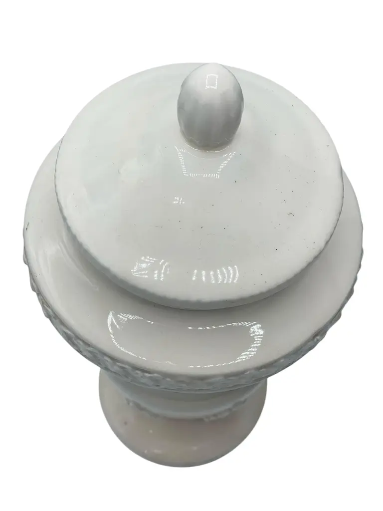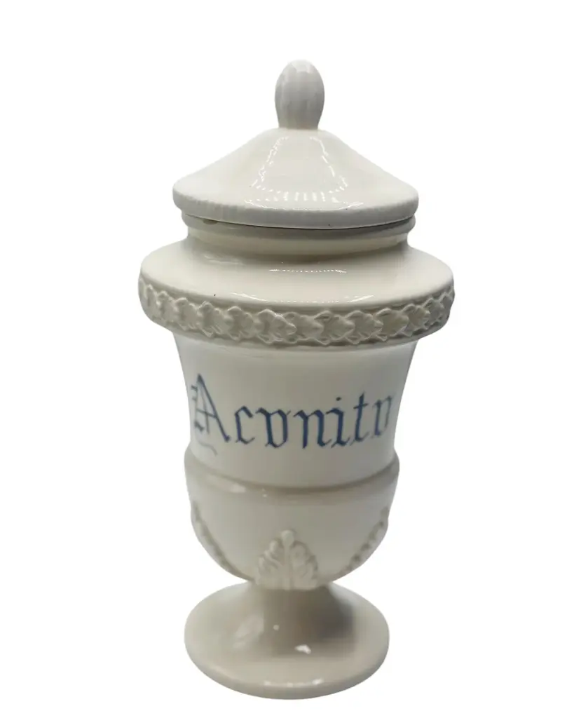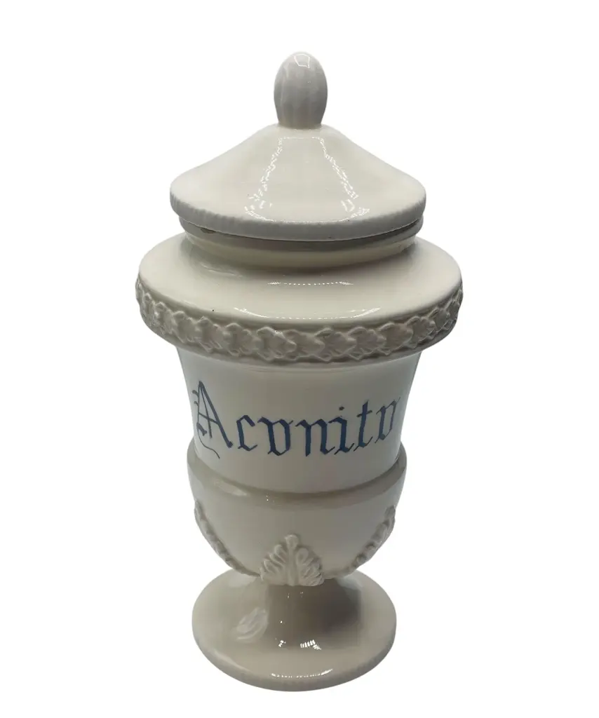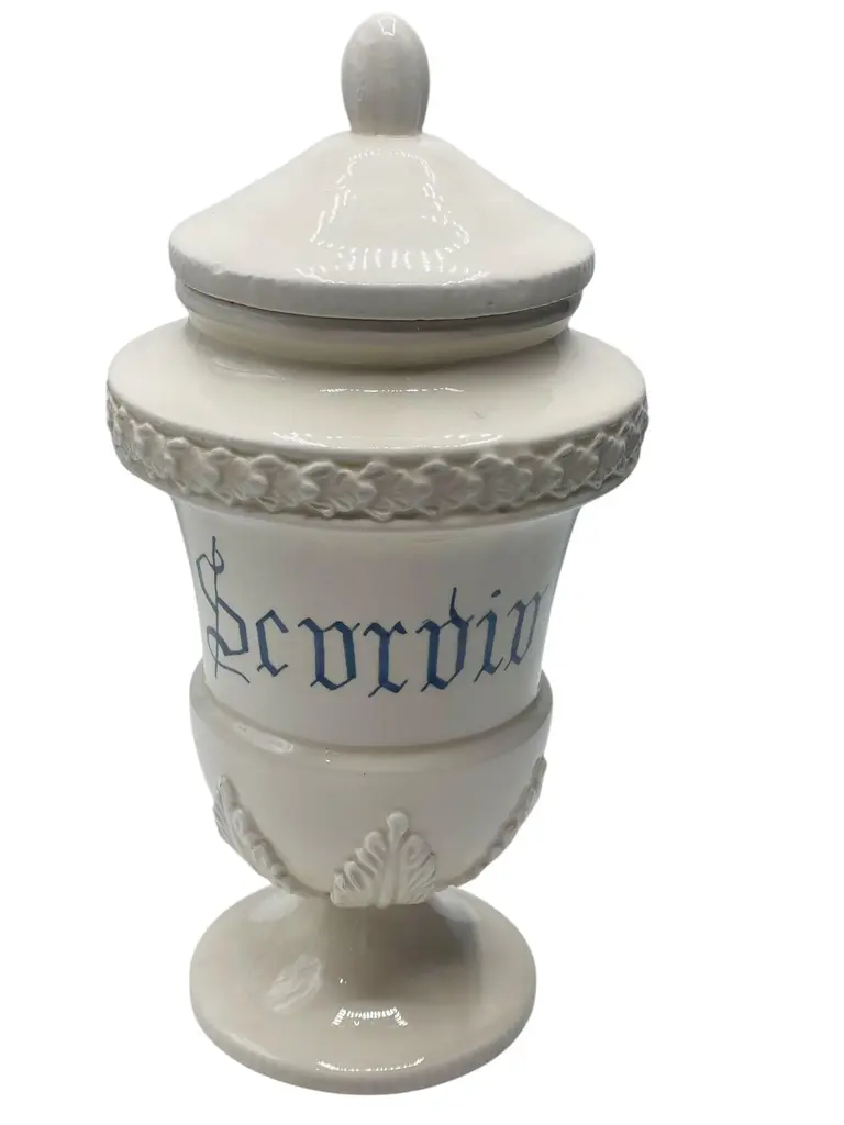 These exquisite 19th century French ceramic apothecary jars are a stunning blend of elegance and history. Featuring raised foliage detailing that gracefully frames the top and base, each jar is beautifully labeled in hand painted blue script, adding to its old world charm. The intricate craftsmanship and classic design make these jars perfect for collectors. Five available.