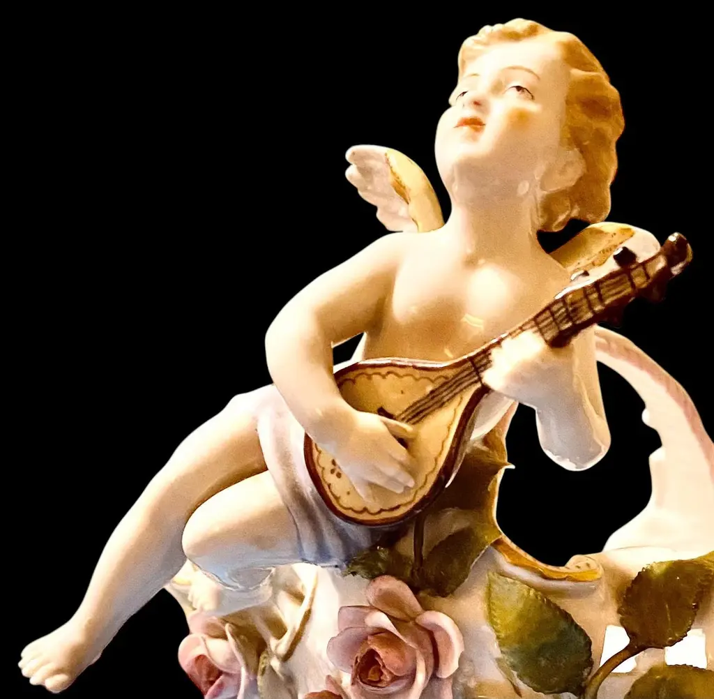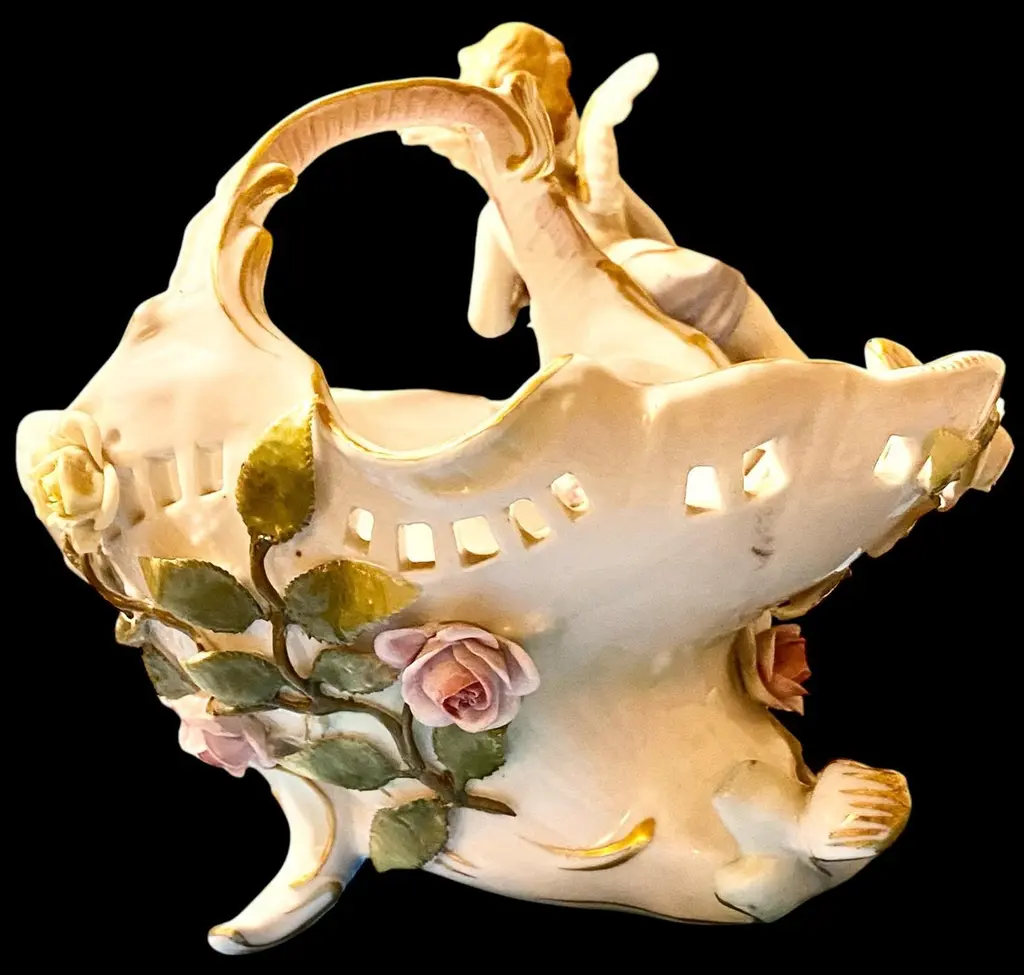 An antique 19th-century Viennese porcelain centerpiece bowl or jardinière beautifully rendered in multi-colors with floral sprays and gilt highlights. This stunning Art Nouveau piece heavily attributable to Meissen also features rose flower in relief, leaves, and ribbons with a winged cherub with lute.