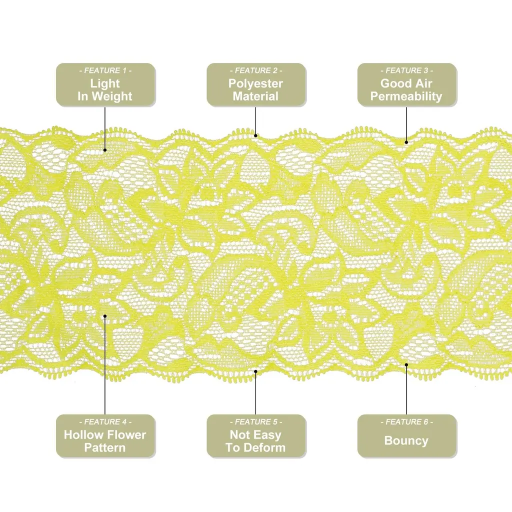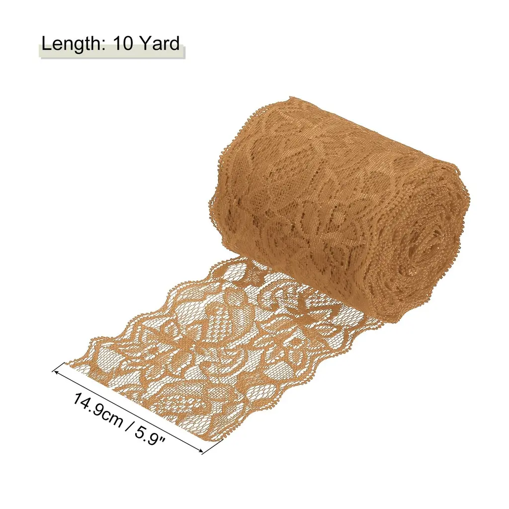 What is this?This Lace Ribbon is mainly used for sewing, wrapping gift boxes and bouquets. It can be used to make hair accessories, DIY your clothing, hats or scarves, etc. It can also be used to DIY cards, decorate various jars or other crafts at home. Great decoration for wedding, birthday, Christmas, Valentine's Day and other partiesWhat will I get?Color: YellowMaterial: polyesterSize: 5.9 inch x 10 Yard (W*L)Package Content: 1 Pack x Lace Trim RibbonAre there any advantages of the product?1. The pattern of the lace ribbon is a hollow flower pattern, which adds a different packaging style to your gift box or bouquet, and adds elegant decoration to your wedding or birthday party.2. Lace trim ribbon is made of polyester material, which is light in weight, has good air permeability and is not easy to deform. bouncy,Easy to use, you can cut the length according to your needs.3. This vintage lace ribbon has a wide range of uses and many color choices. You can choose different colors according to different needs to DIY your gift box or bouquet, or your partyHow to use it?According to the length you need, cut the lace with scissors, and then you can use this lace to decorate or wrap the itemWhat should I notice?Please confirm the size you need before buying