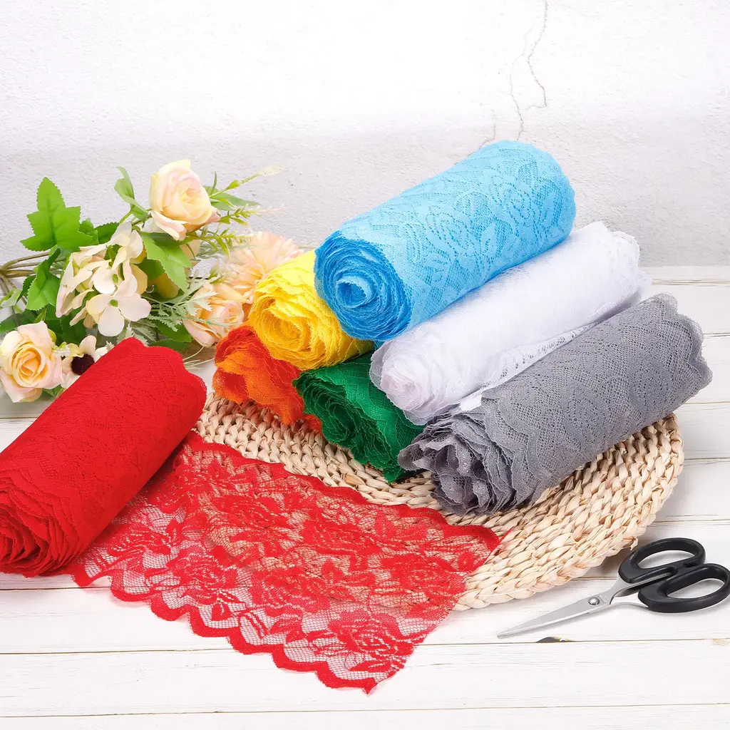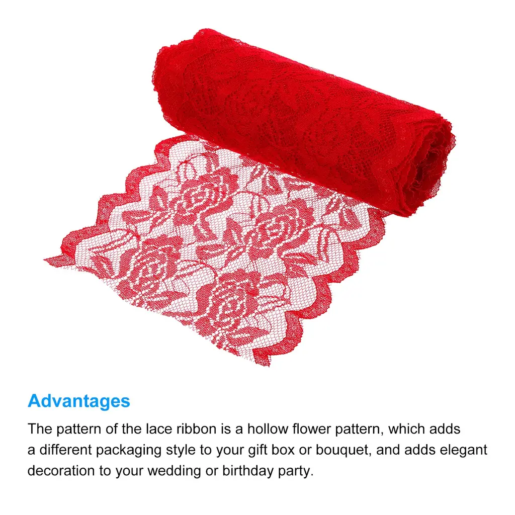 What is this?This Lace Ribbon is mainly used for sewing, wrapping gift boxes and bouquets. It can be used to make hair accessories, DIY your clothing, hats or scarves, etc. It can also be used to DIY cards, decorate various jars or other crafts at home. Great decoration for wedding, birthday, Christmas, Valentine's Day and other partiesWhat will I get?Material: polyesterSize: 5.9 inch x 11 Yard (W*L)Package Content: 1 Pack x Lace Trim RibbonAre there any advantages of the product?1. The pattern of the lace ribbon is a hollow flower pattern, which adds a different packaging style to your gift box or bouquet, and adds elegant decoration to your wedding or birthday party.2. Lace trim ribbon is made of polyester material, which is light in weight, has good air permeability and is not easy to deform. Easy to use, you can cut the length according to your needs.3. This vintage lace ribbon has a wide range of uses and many color choices. You can choose different colors according to different needs to DIY your gift box or bouquet, or your partyHow to use it?According to the length you need, cut the lace with scissors, and then you can use this lace to decorate or wrap the itemWhat should I notice?Please confirm the size you need before buying