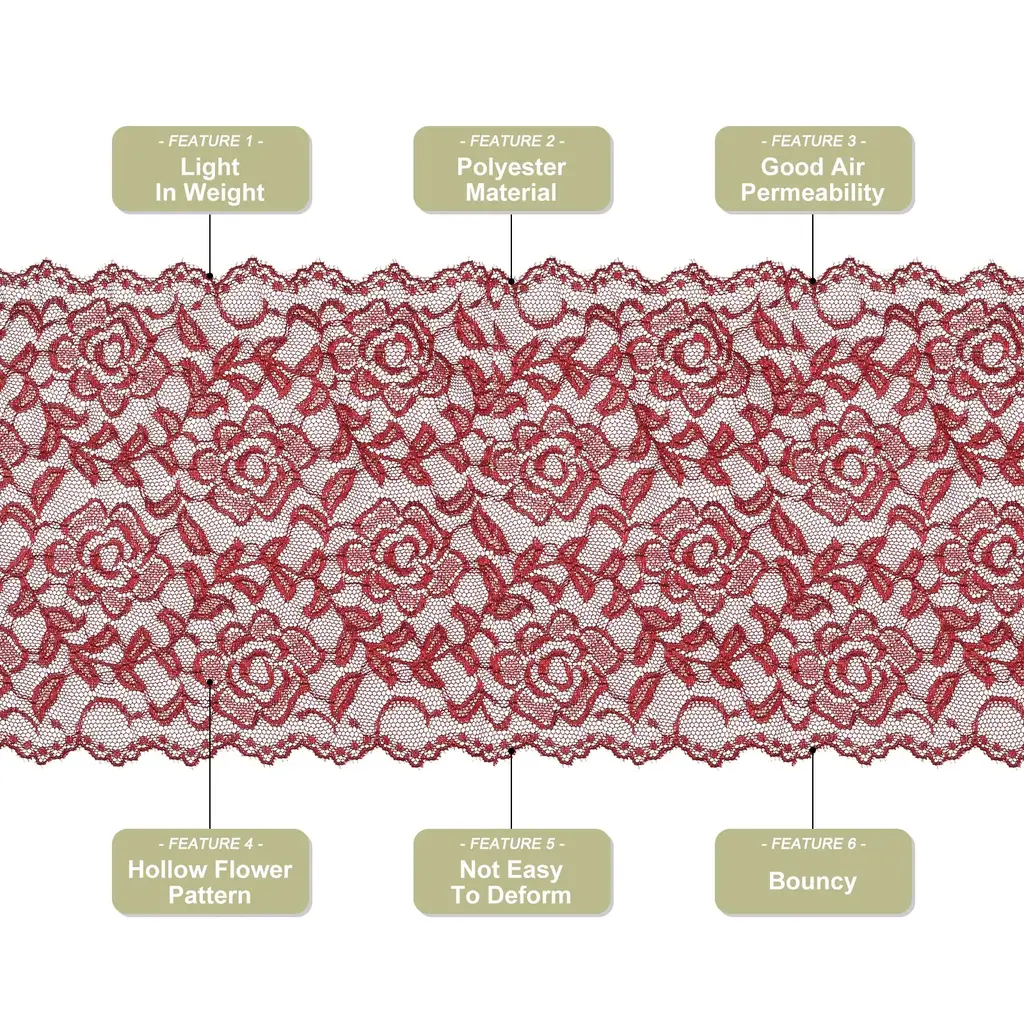 What is this?This Lace Ribbon is mainly used for sewing, wrapping gift boxes and bouquets. It can be used to make hair accessories, DIY your clothing, hats or scarves, etc. It can also be used to DIY cards, decorate various jars or other crafts at home. Great decoration for wedding, birthday, Christmas, Valentine's Day and other partiesWhat will I get?Color: Burgundy RedMaterial: polyesterSize: 7.09 inch x 5 Yard (W*L)Package Content: 1 Pack x Lace Trim RibbonAre there any advantages of the product?1. The pattern of the lace ribbon is a hollow flower pattern, which adds a different packaging style to your gift box or bouquet, and adds elegant decoration to your wedding or birthday party.2. Lace trim ribbon is made of polyester material, which is light in weight, has good air permeability and is not easy to deform. bouncy,Easy to use, you can cut the length according to your needs.3. This vintage lace ribbon has a wide range of uses and many color choices. You can choose different colors according to different needs to DIY your gift box or bouquet, or your partyHow to use it?According to the length you need, cut the lace with scissors, and then you can use this lace to decorate or wrap the itemWhat should I notice?Please confirm the size you need before buying