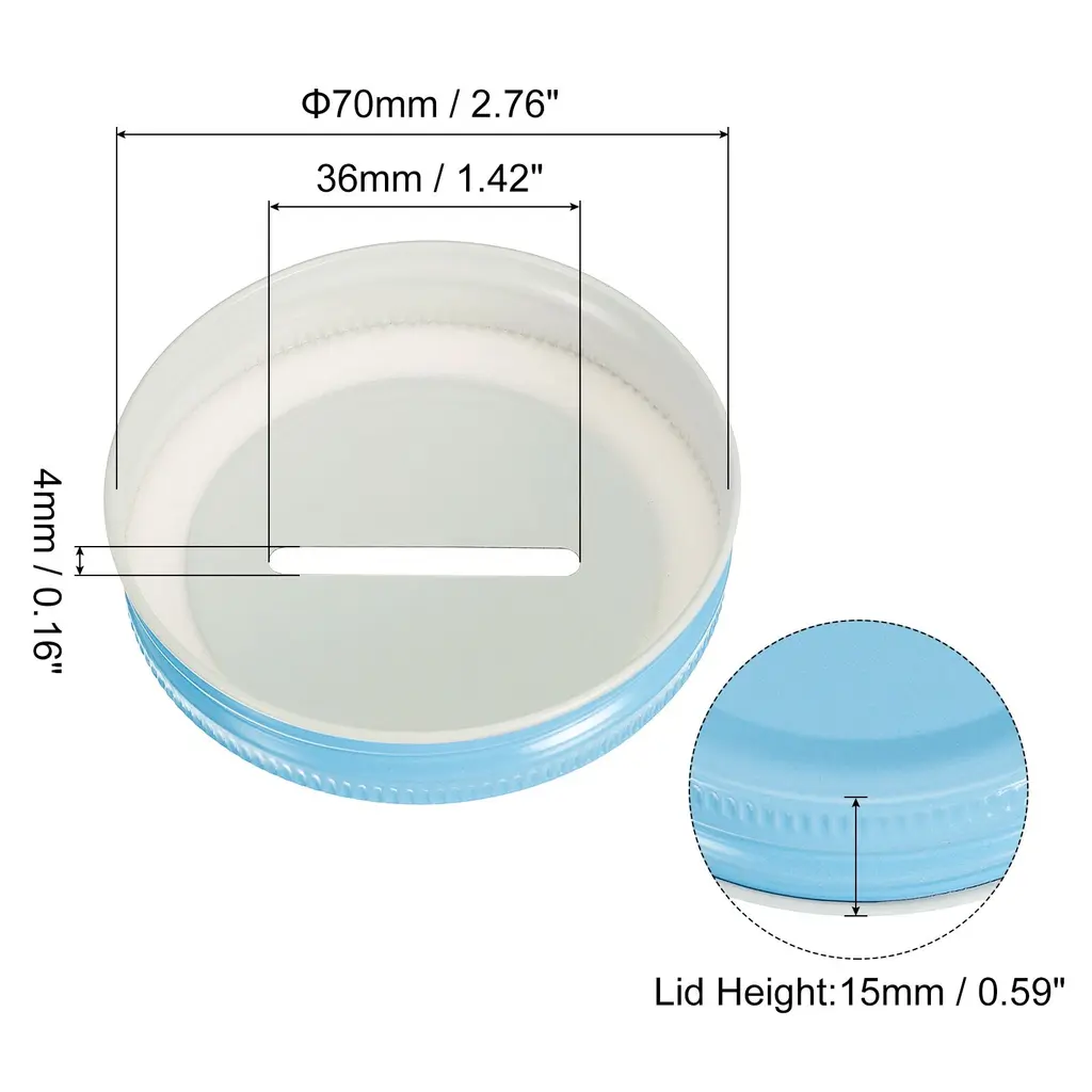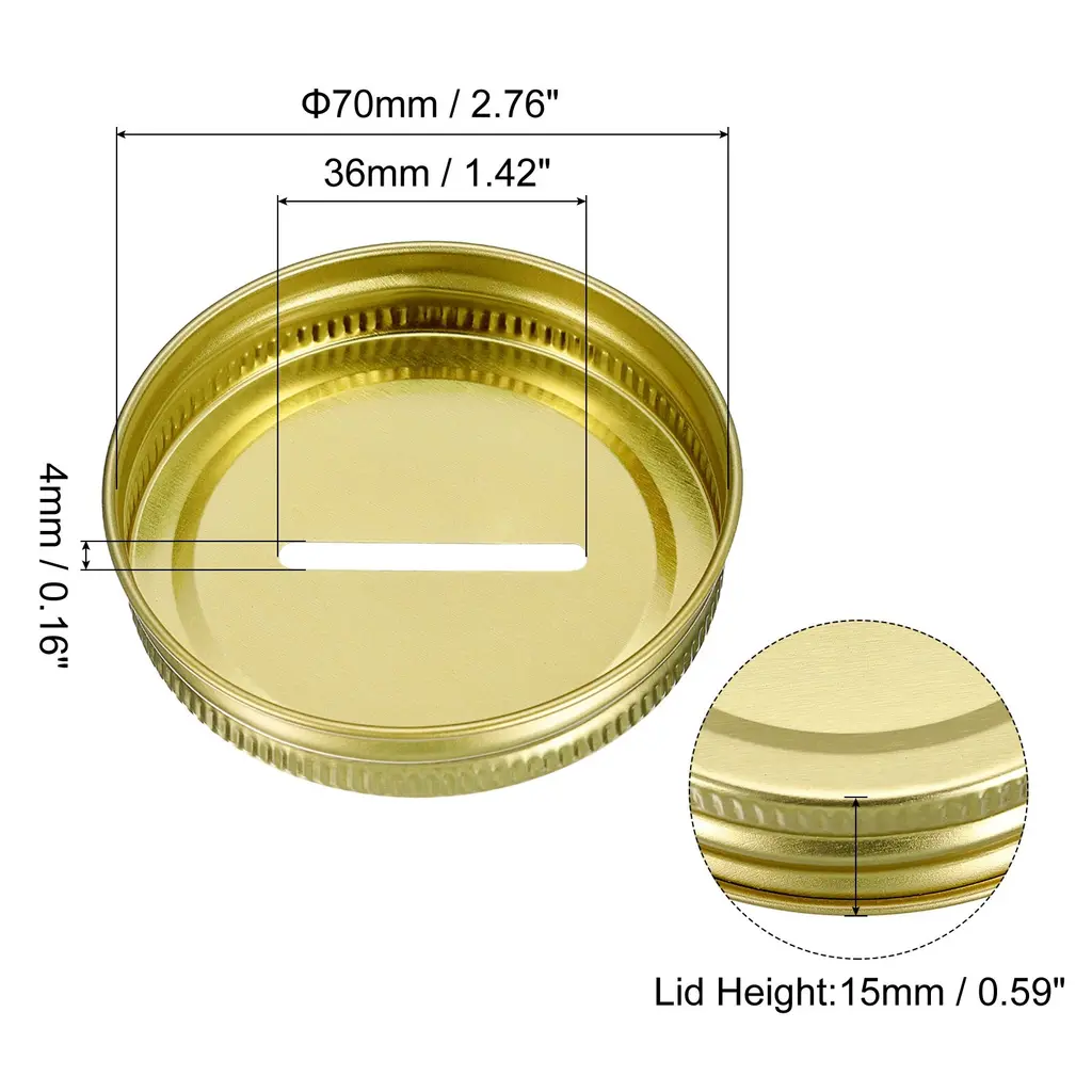 Description:Compact Size - Designed to fit regular mouth(70mm/2.76") mason jars and with a 36mm x 4mm coin slot, therefore, most sizes of coins are suitable for these lids. A useful design for you to collect coins and changes more convenient.Vertical Stripe Design - Concave-convex design with vertical stripes on the outside to increase friction between palm and lid, and facilitate opening and closing.Material - Constructed from a thin steel plate as the substrate, tin plated on its surface and multi-protective films(layers). With corrosion resistance, odorless, glossy surface, lightweight and strong adaptability to ambient temperature.Washable & Reusable - The canning lid is washable and suitable for the dishwasher. Please wash the lids before using on food and it is better to dry to store them as soon as possible, in order to extend service life and not easy to rust.Wide Applications - Commonly apply on mason jars for collecting coins, change, extra buttons come with clothes, wish notes, and any other small objects and for making DIY projects. It is a convenient tool for exchanging extra mason jar to a change organizer for us.Specifications:Material: Tin PlateColor: Gold ToneInner Diameter: 70mm/2.76-inchCoin Slot Size: 36mm x 4mm/1.42-inch x 0.16-inchLid Height: 15mm/0.59-inchPackage Contents:15pcs x Coin Slot Bank Lid