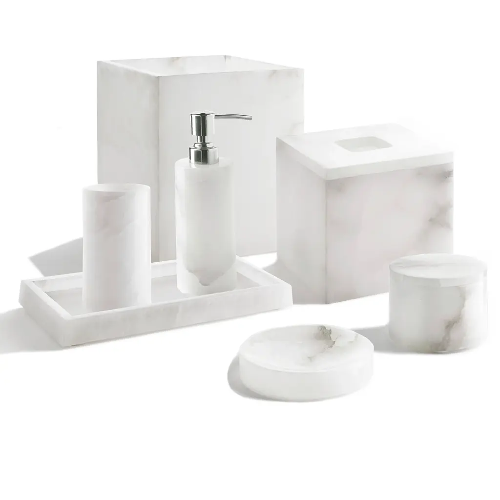 Crafted from luxuriant alabaster, the naturally marbled veining of each distinct collection piece brings artful elegance to the bathroom.