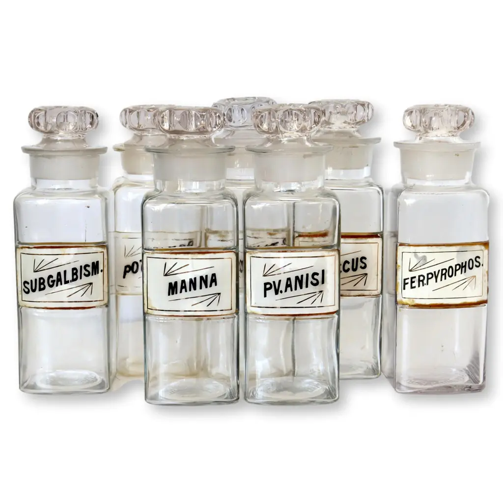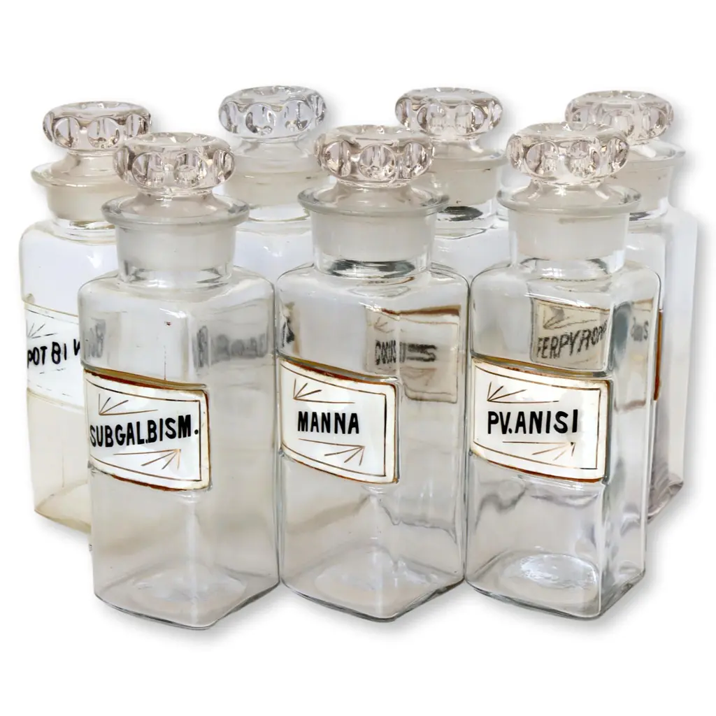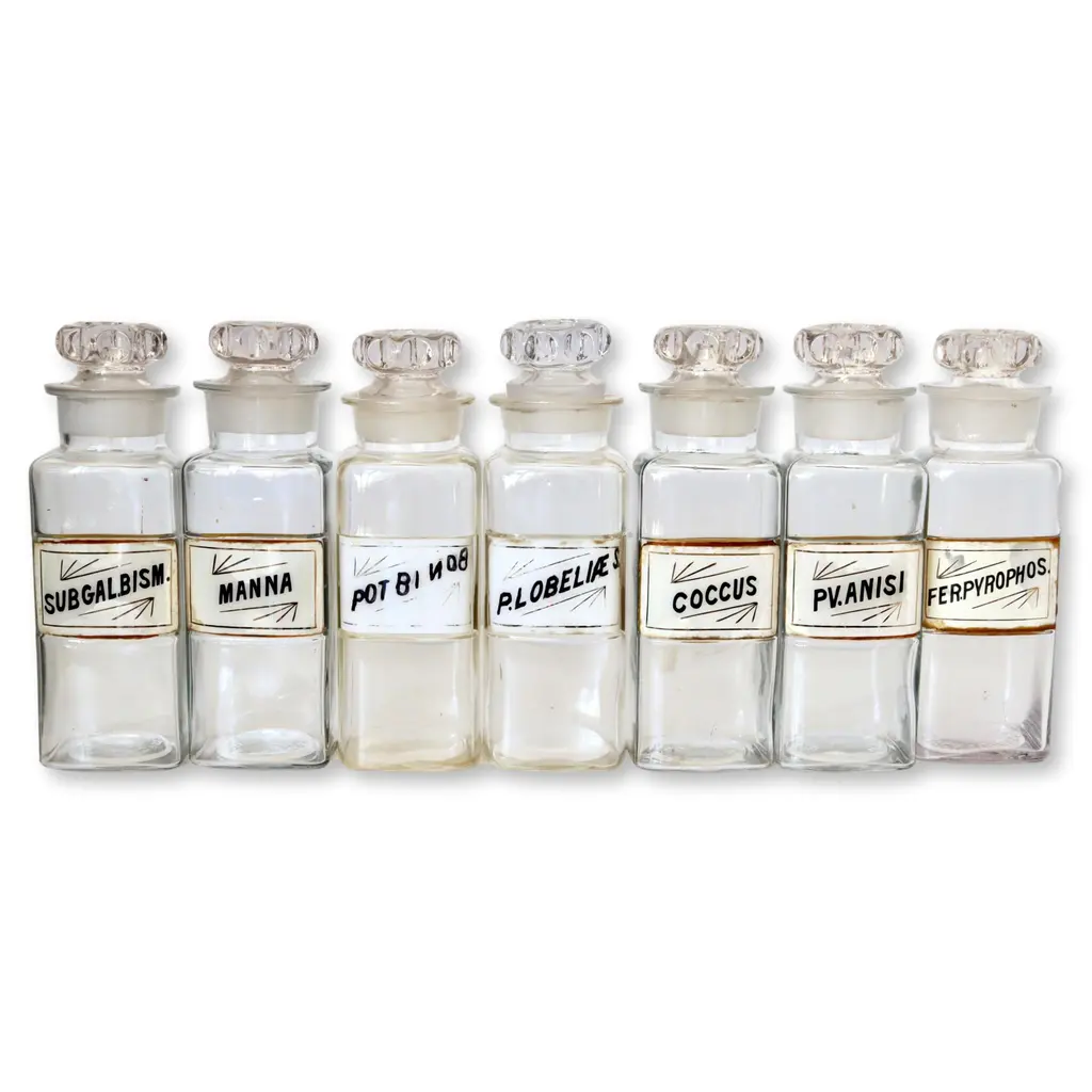 A set of seven antique English Apothecary jars. Highly collectible, and rare to find in a set, these jars were used in to store the pharmaceutical components needed to make medications at your local chemist / pharmacy.