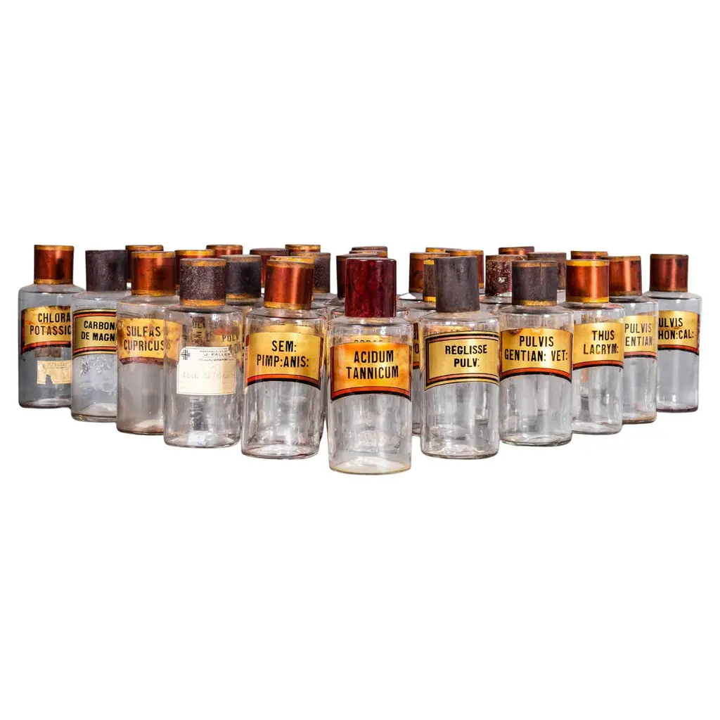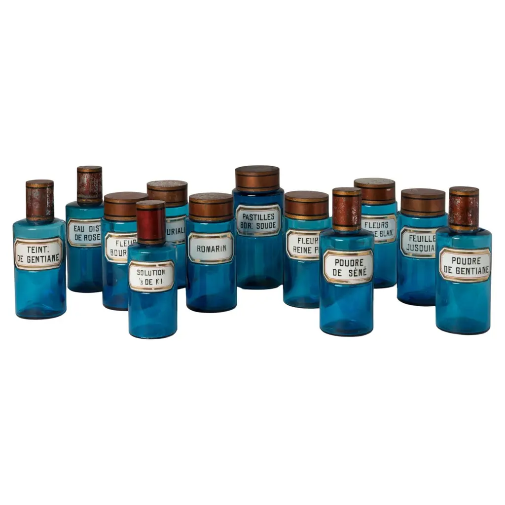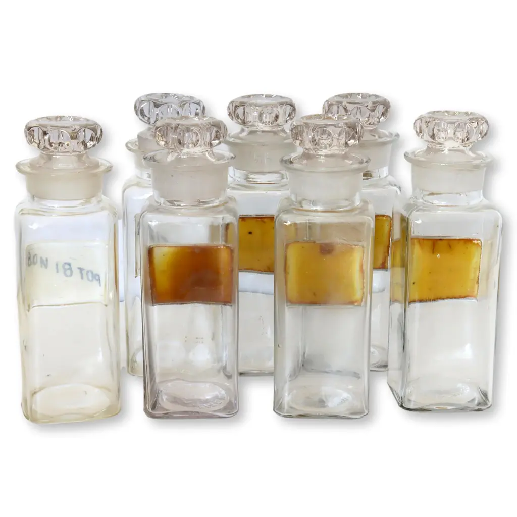 A set of seven antique English Apothecary jars. Highly collectible, and rare to find in a set, these jars were used in to store the pharmaceutical components needed to make medications at your local chemist / pharmacy.