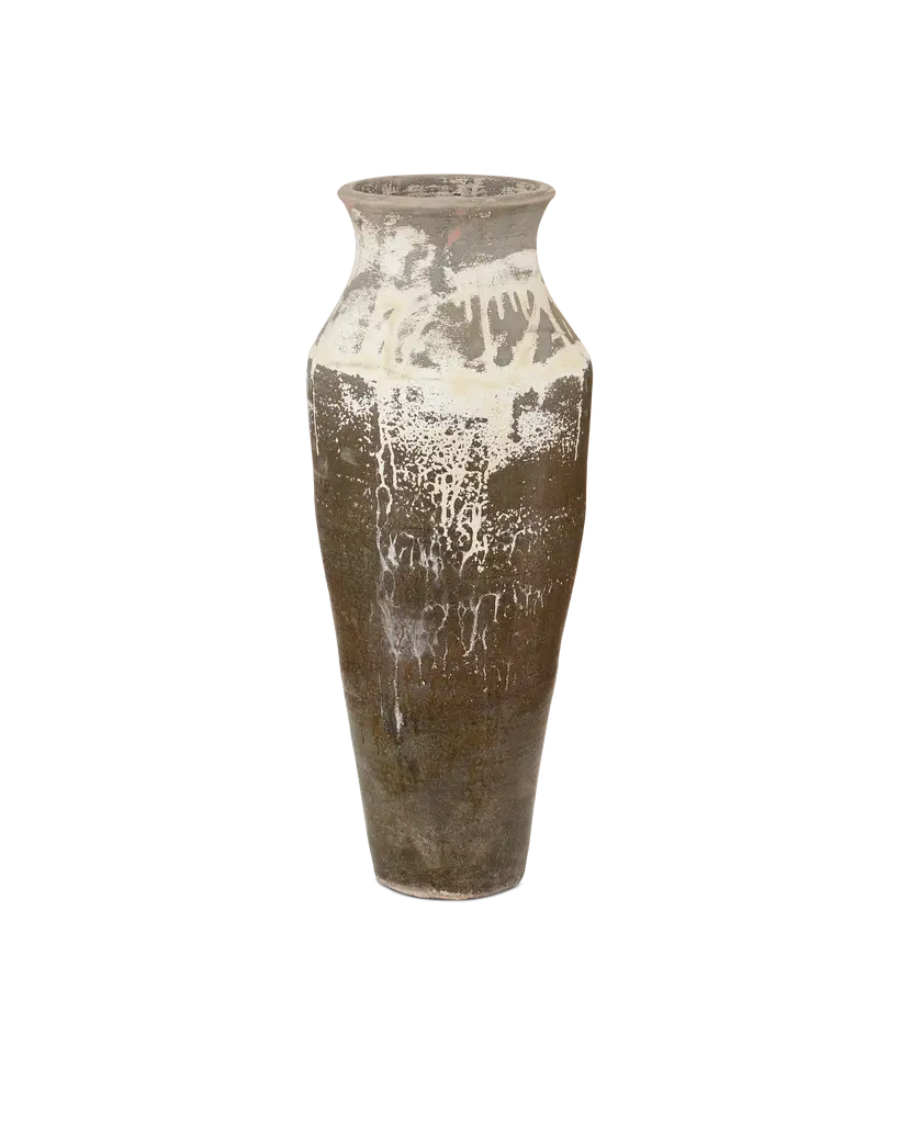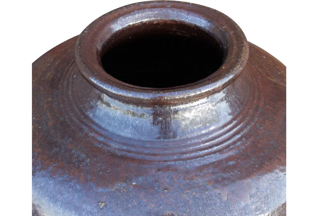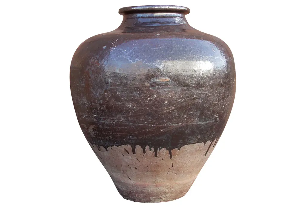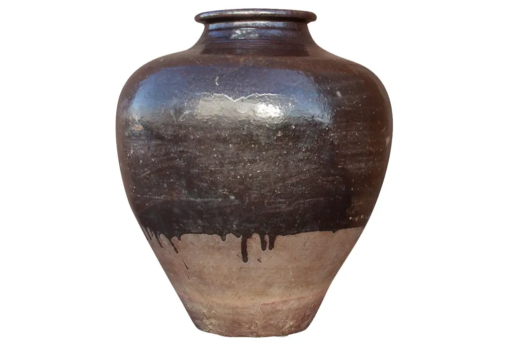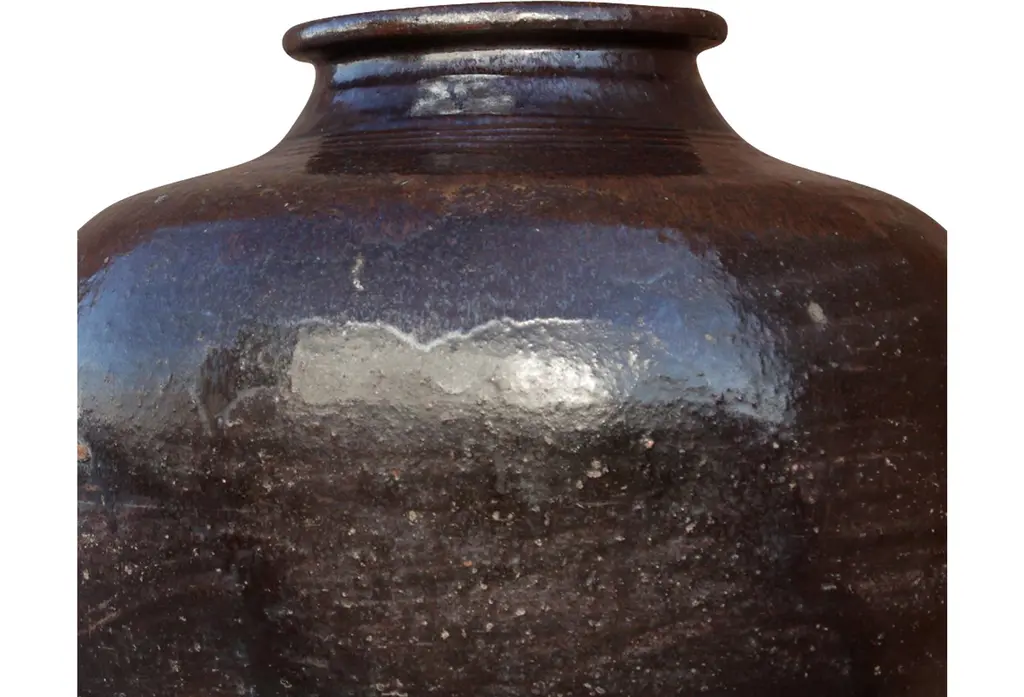 A large antique Southeast Asian pottery Martaban jar with a Henan style glaze and moulded ribbed details. These jars were used to carry Mango and pickles on the silk route.